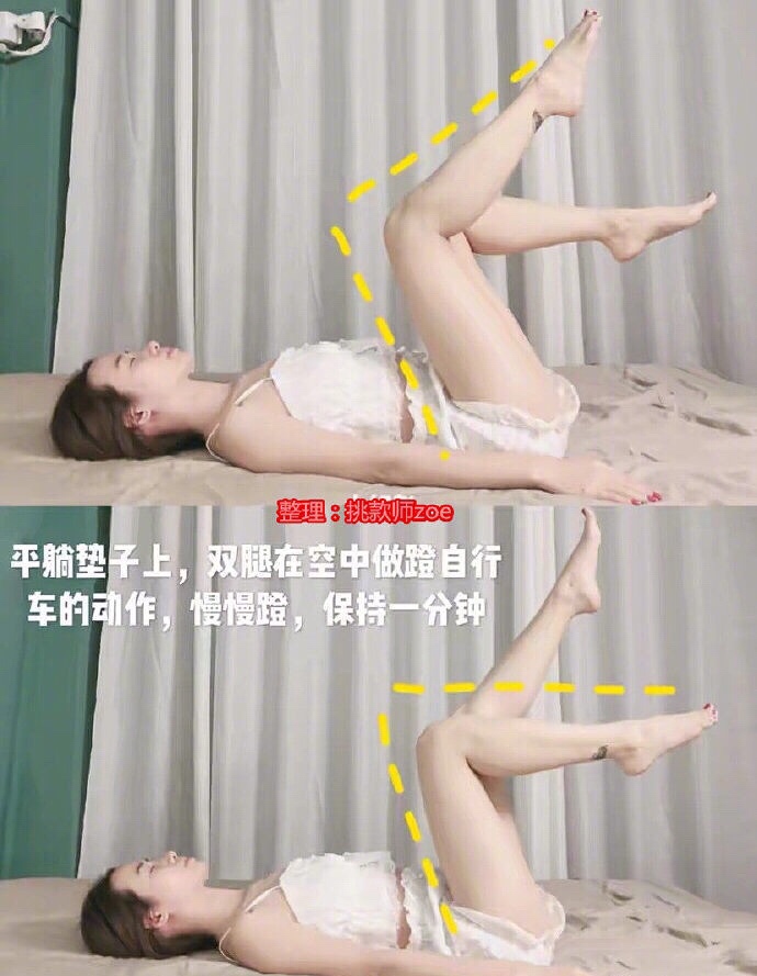 平躺在垫子上,双腿在空中开始做蹬自行车的动作,慢慢蹬,保持一分钟。做完整条腿都是酸麻的。