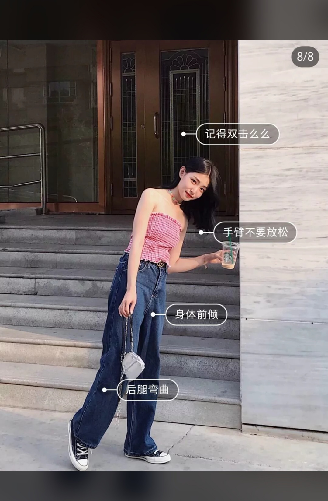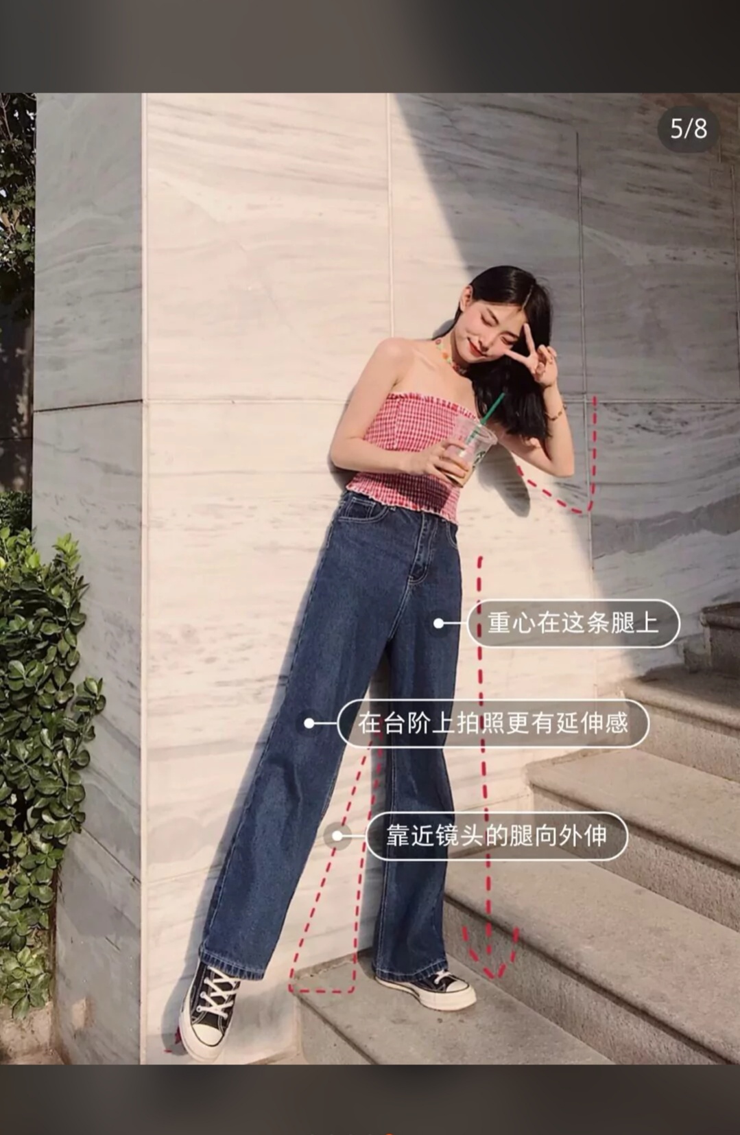 腿一定不要笔直地站着!笔直站着会显得头大腿短!腿一前一后,前腿微微屈膝,后腿提胯特别显腿长!
