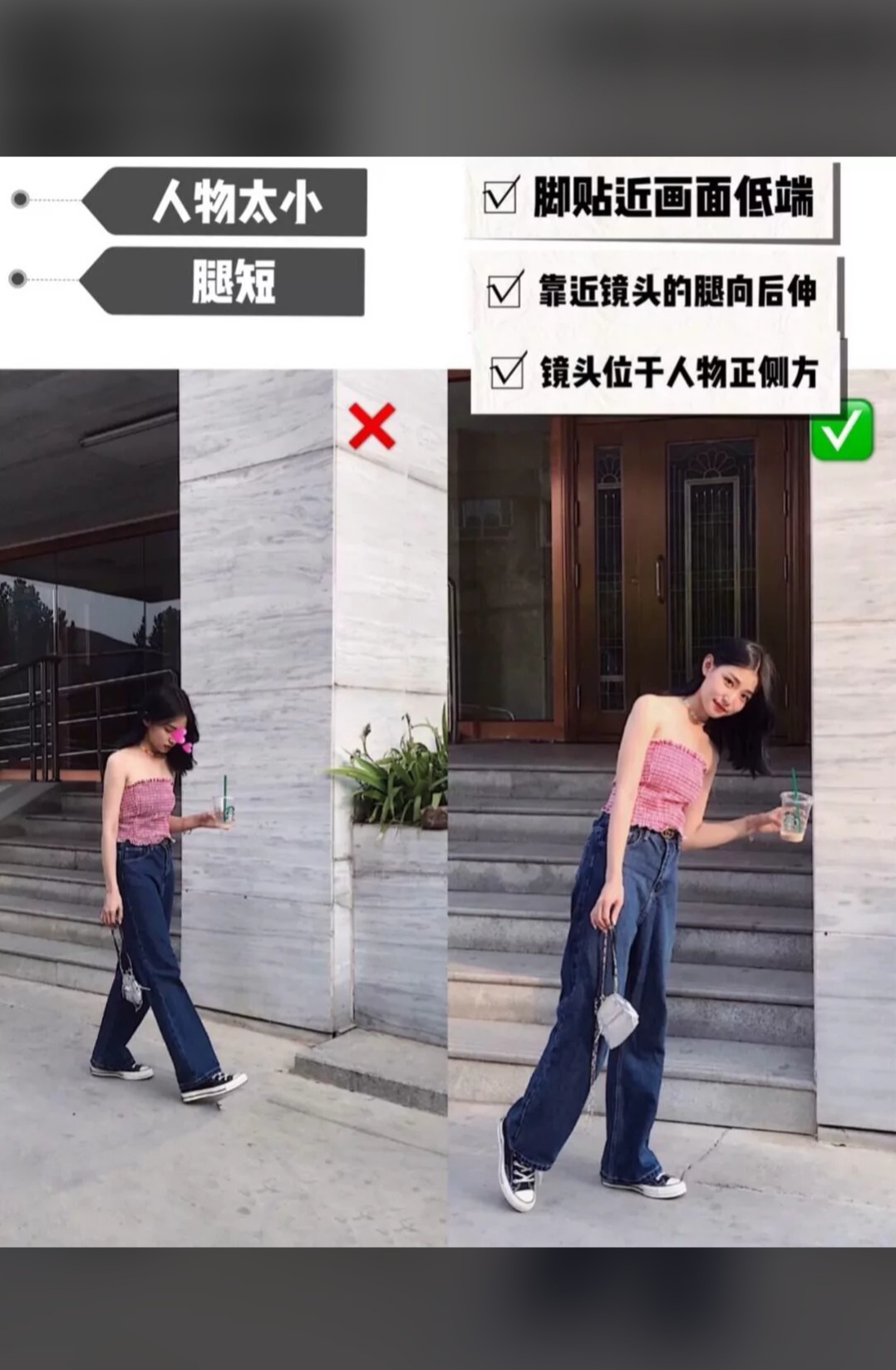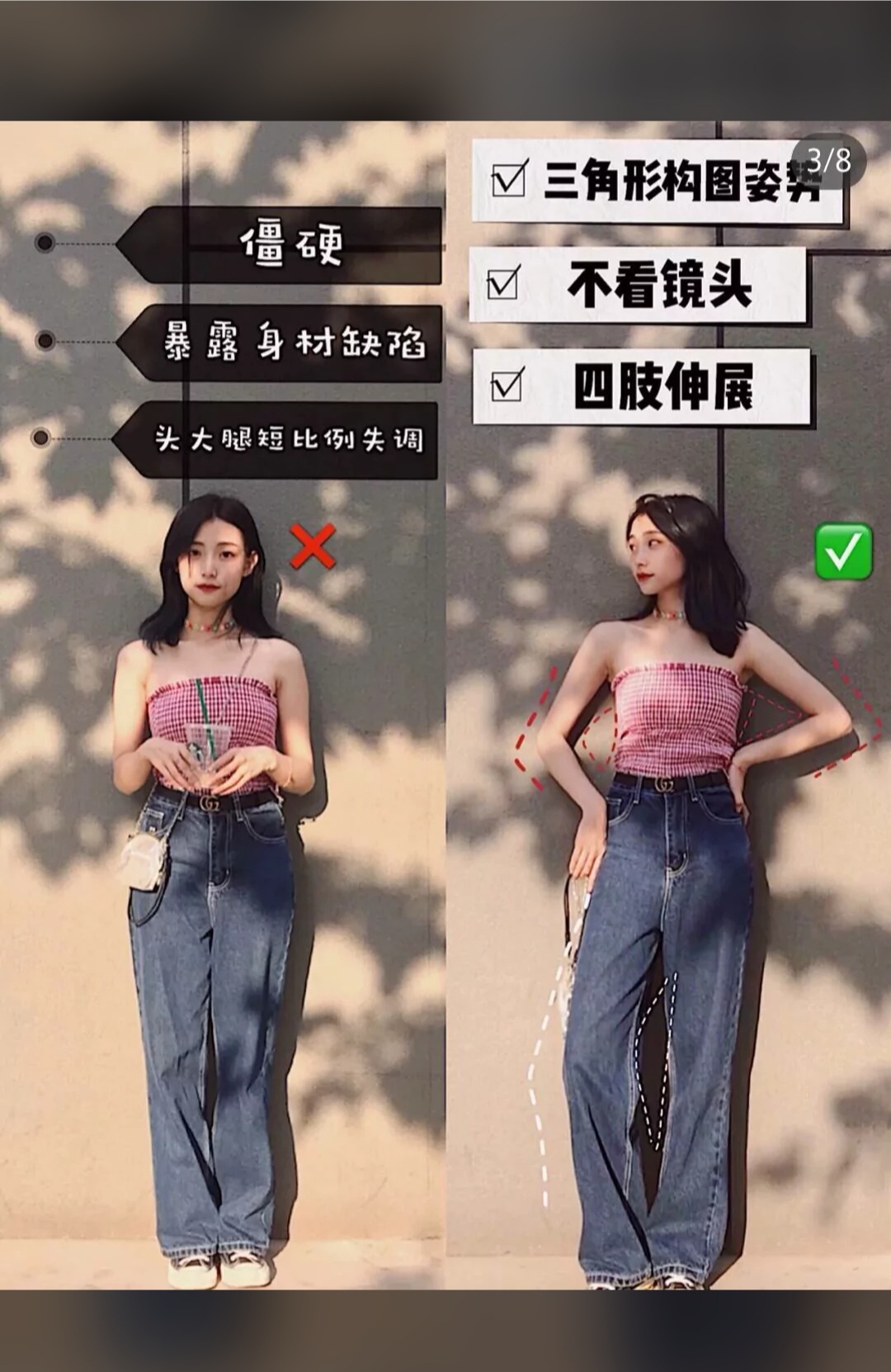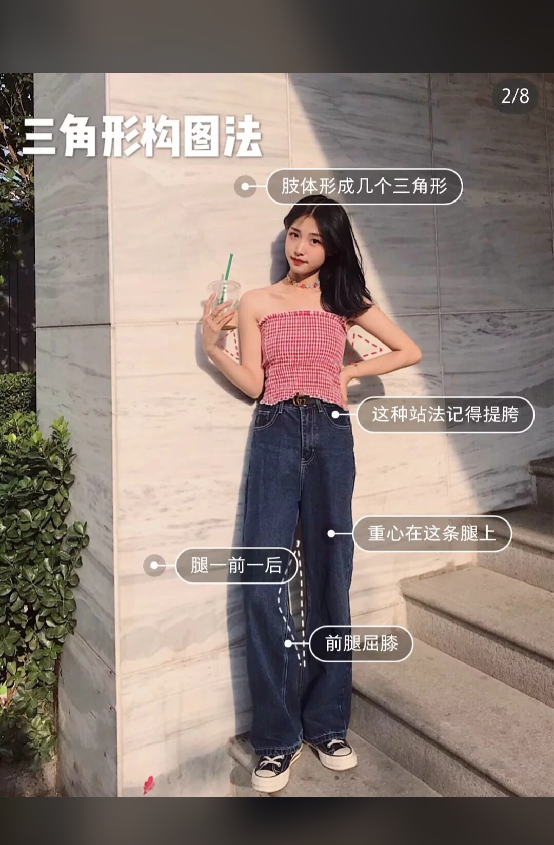 怎么拍出一米八即视感的全身照!三角形构图法四肢和身体形成几个三角形口比如图二!