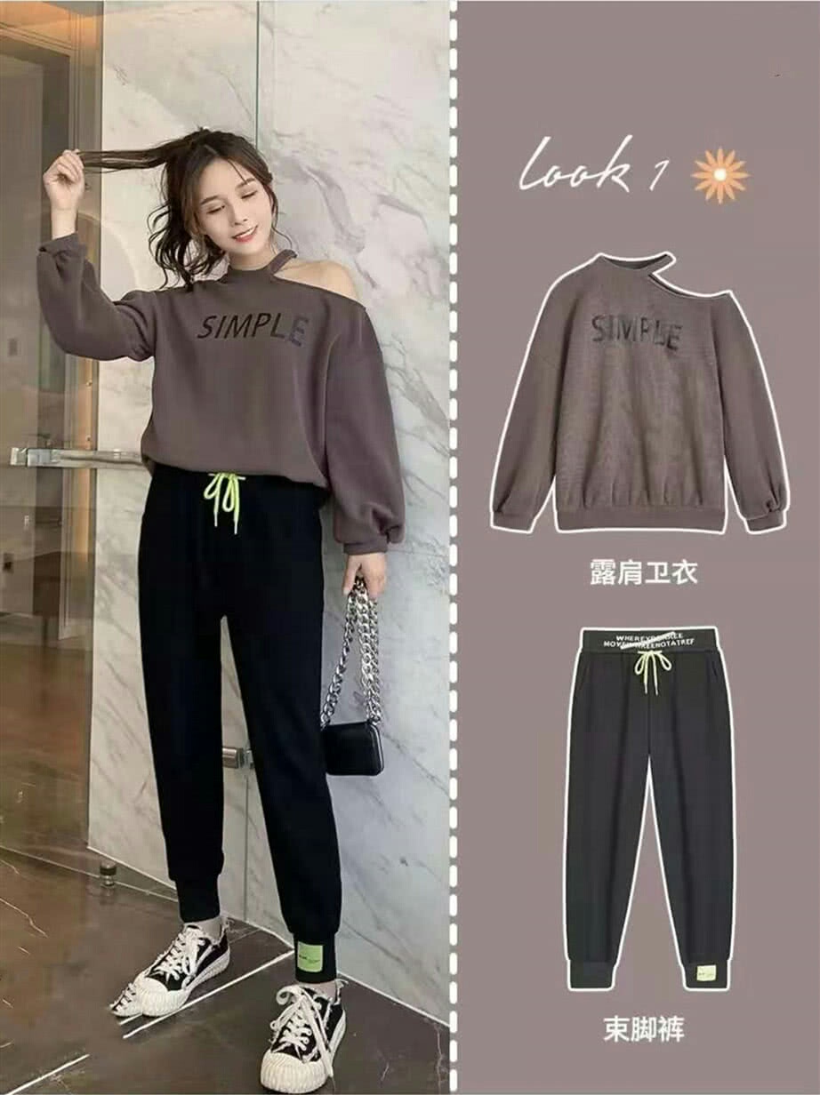1. 漏肩上衣+休闲裤,宽松的卫衣上身舒适又自然,小心机的漏肩搭配,可爱与性感并存。