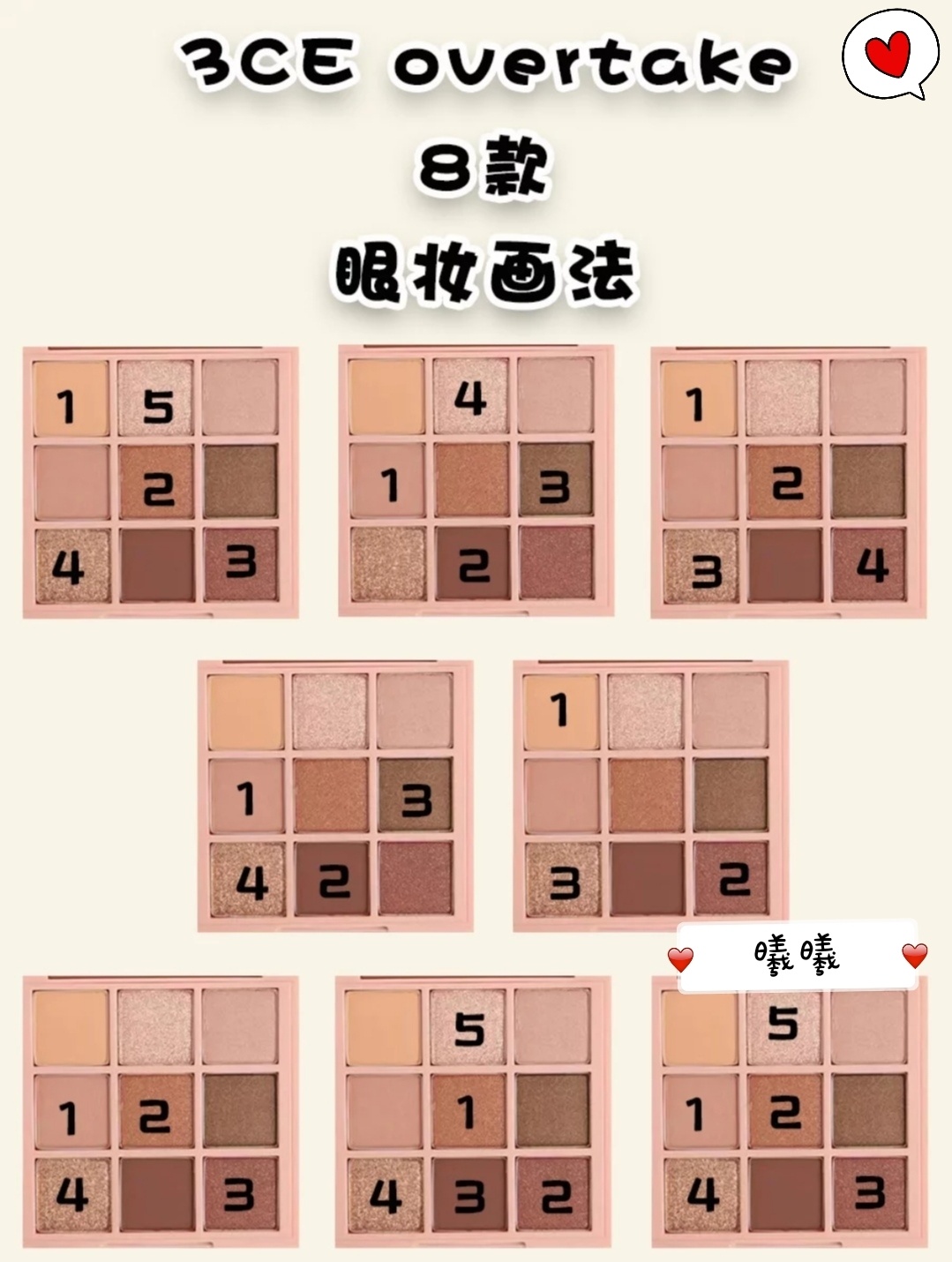 新手必看! 3CE overtake8款眼妆画法教程3CE overtake眼影盘的配色十分适合新手入门,配色简单清新,怎么搭配都不会出错