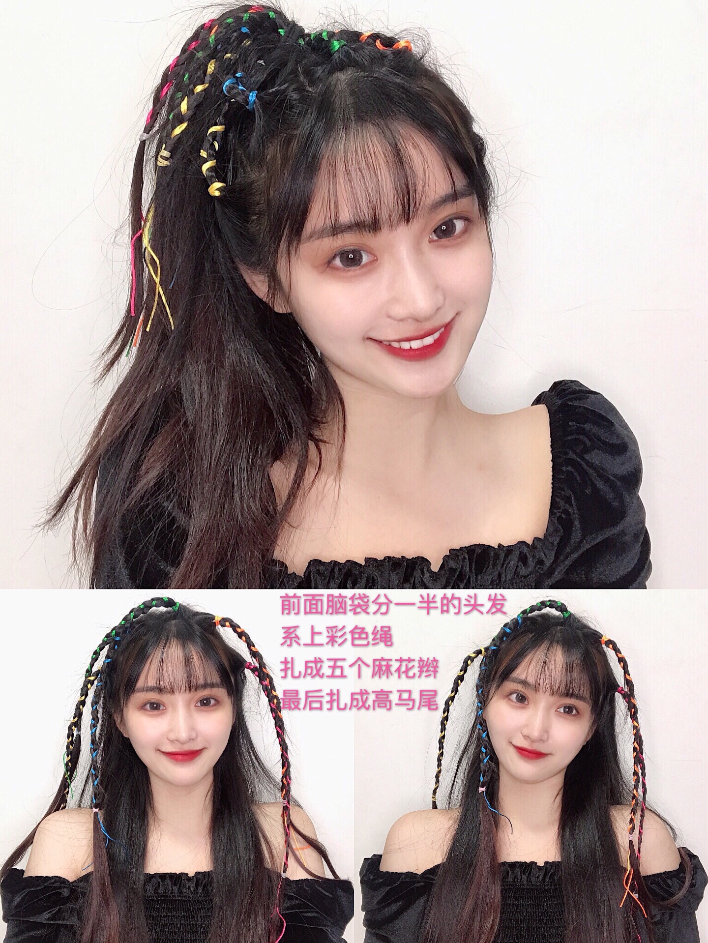 - 彩色绳固定住头发后编五个小麻花,再扎个高马尾,甜美酷girl