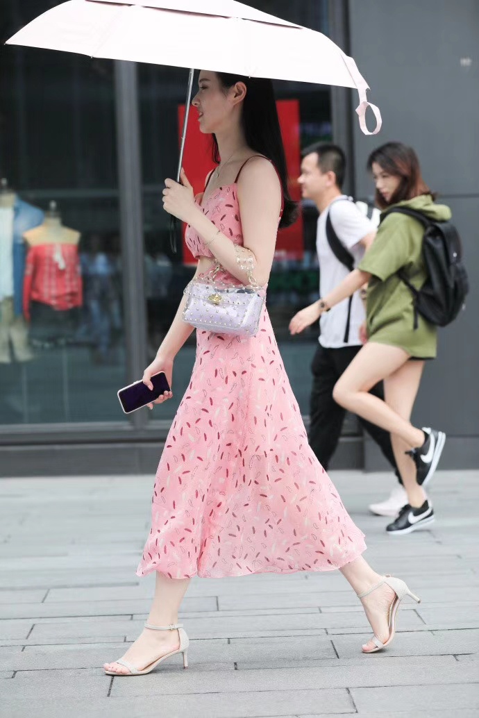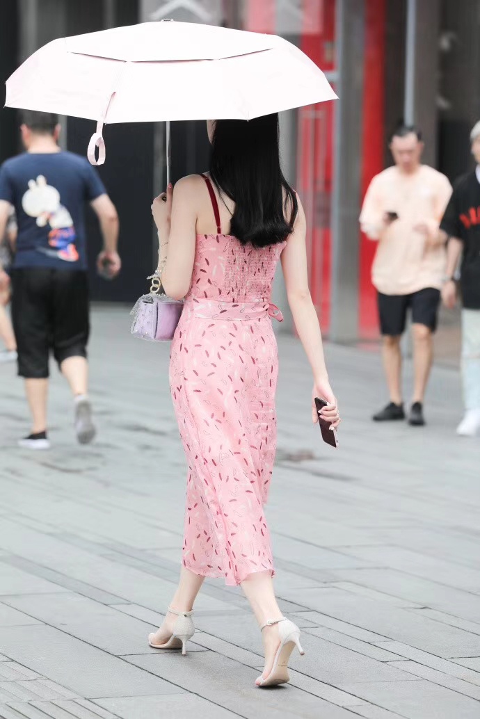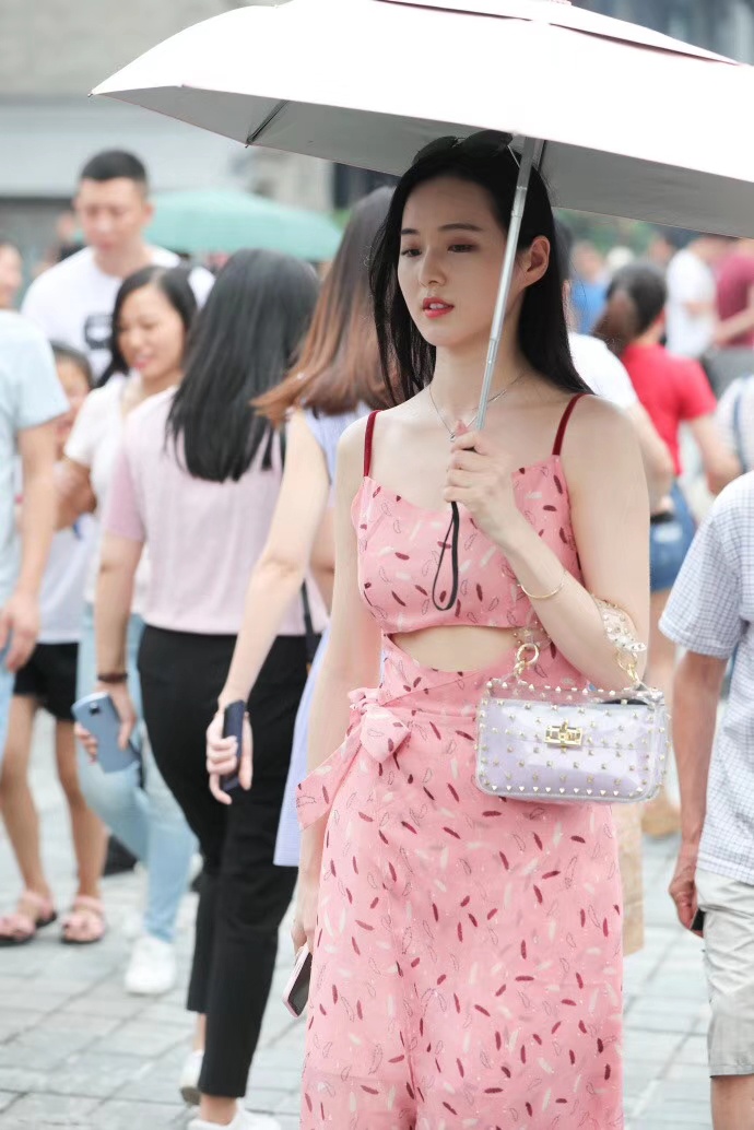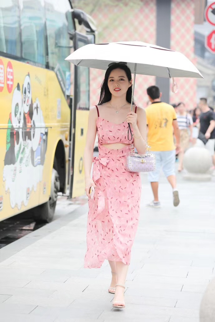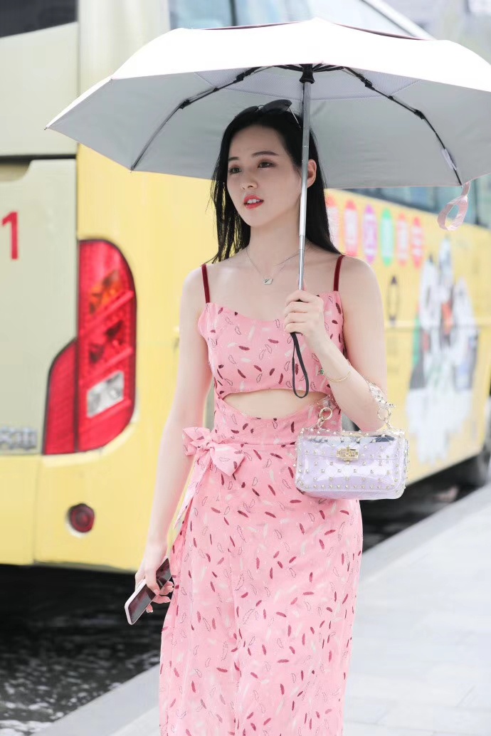 #美图分享# 穿粉色碎花吊带裙的清纯美女街头写真。