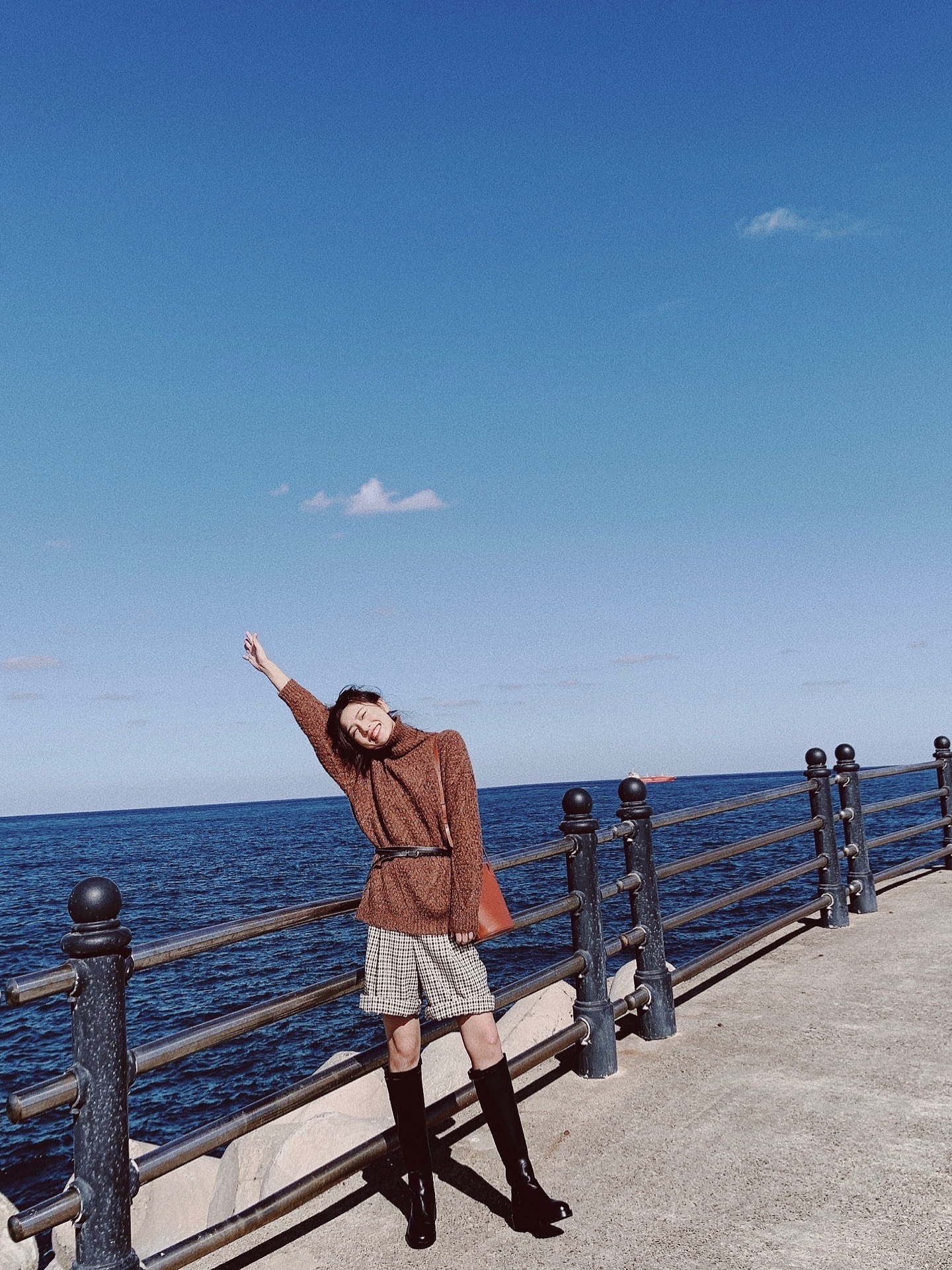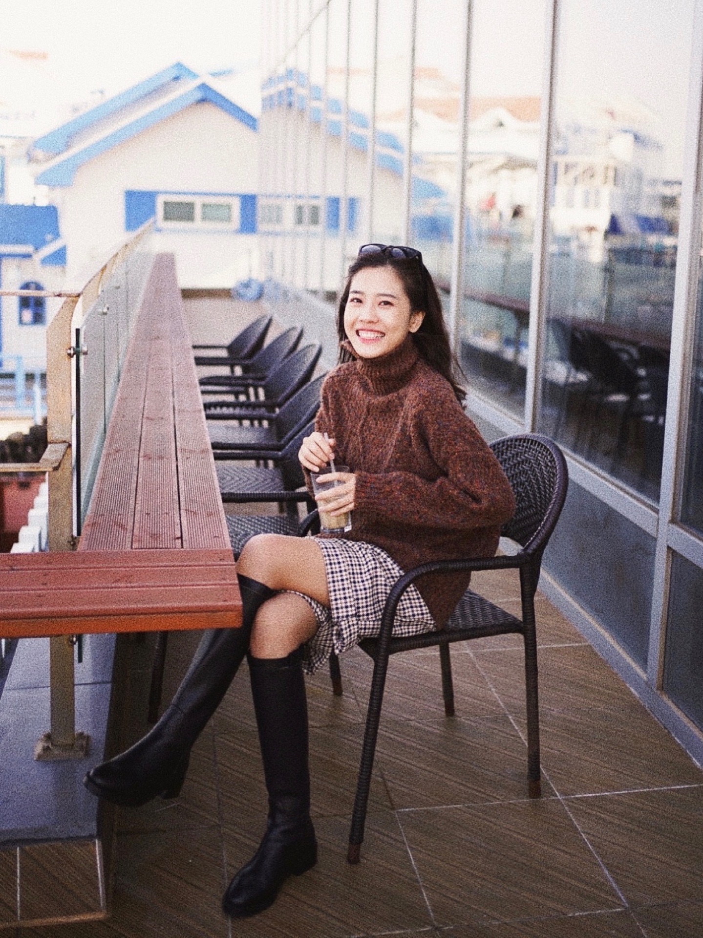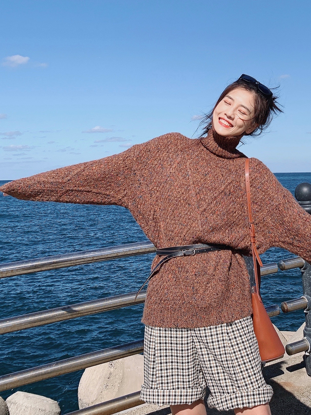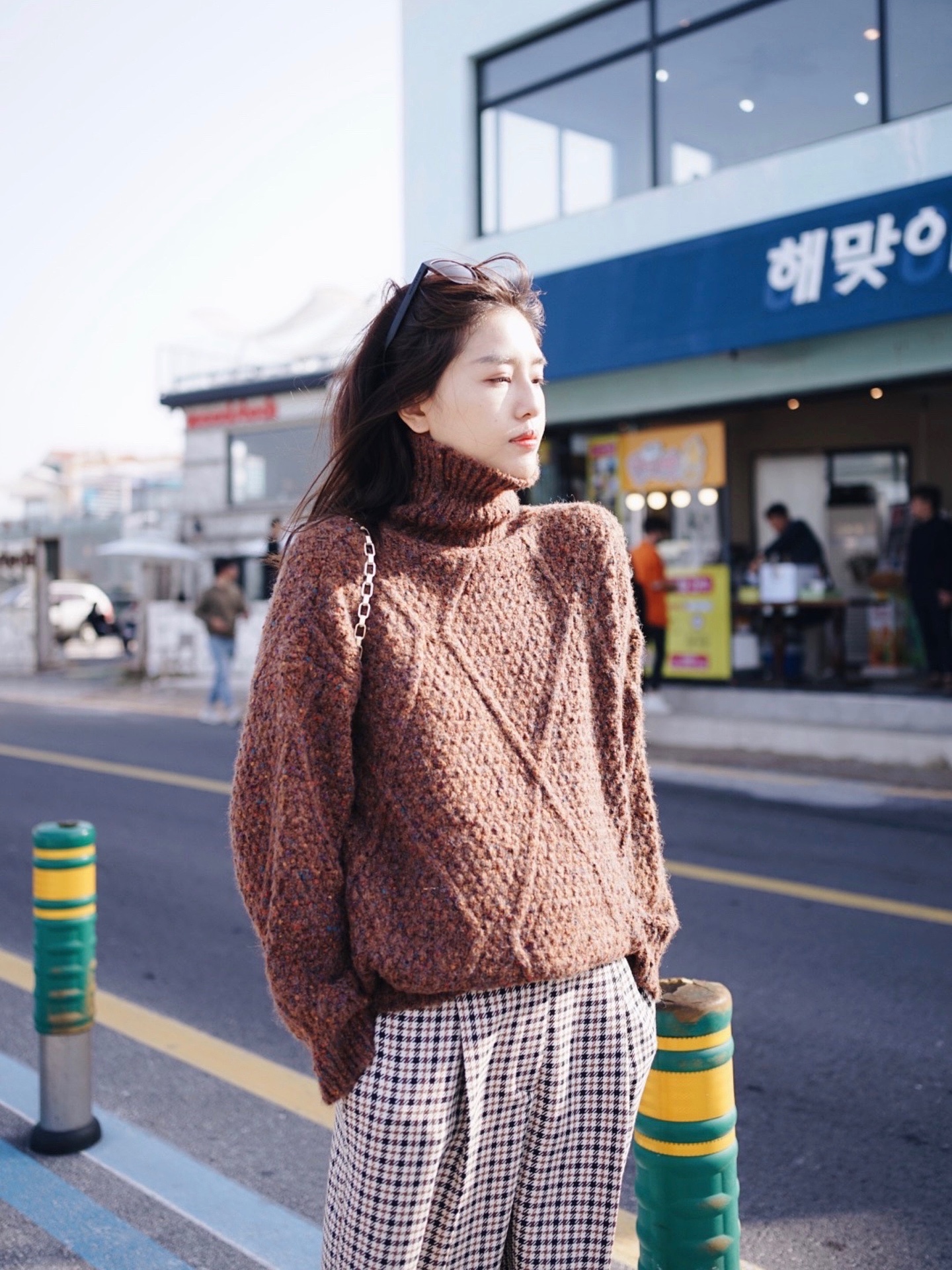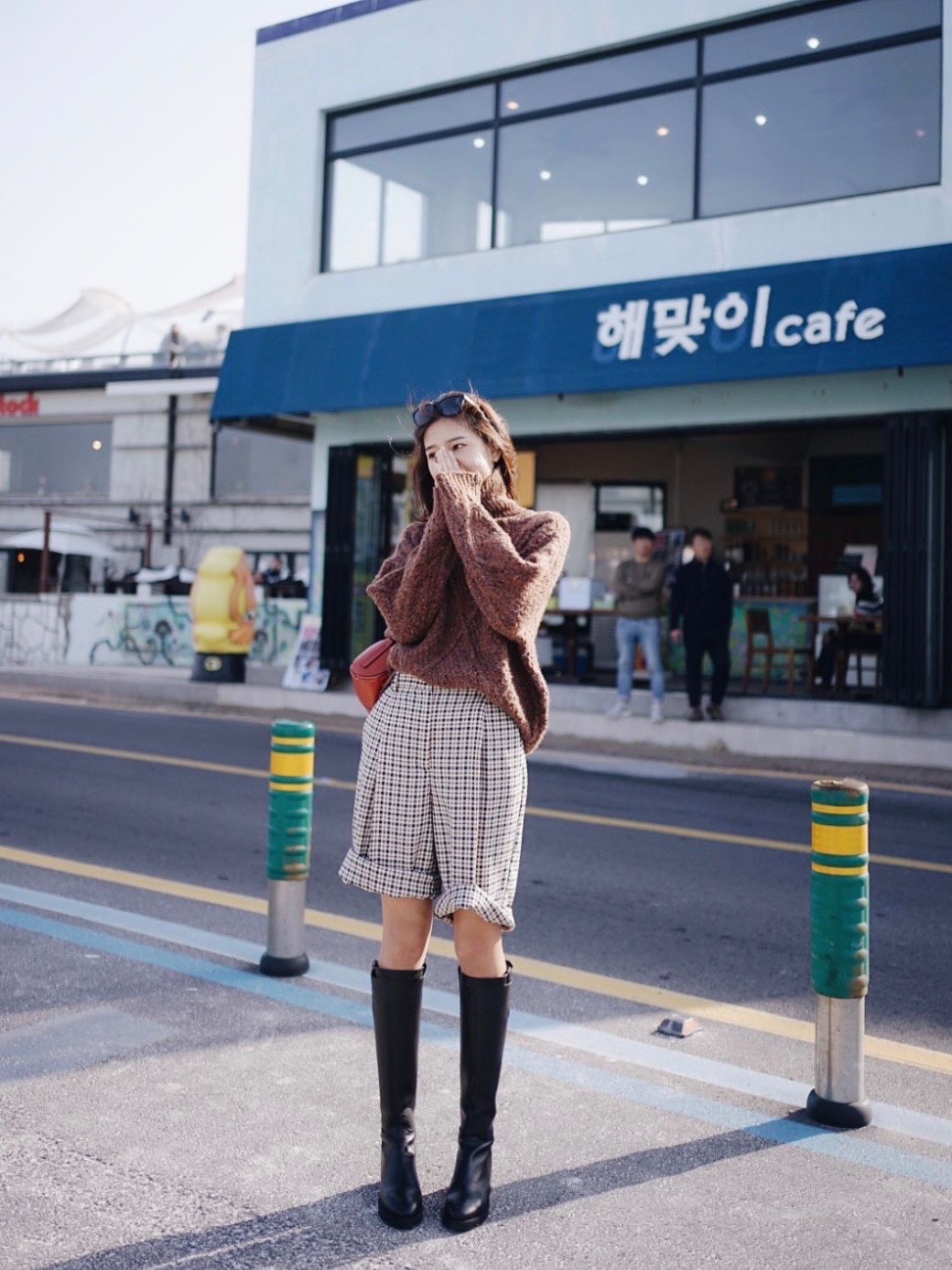 焦糖色高领毛衣搭配格纹中裤!再来一双骑士靴!满满的英伦复古风情~#每日穿搭#