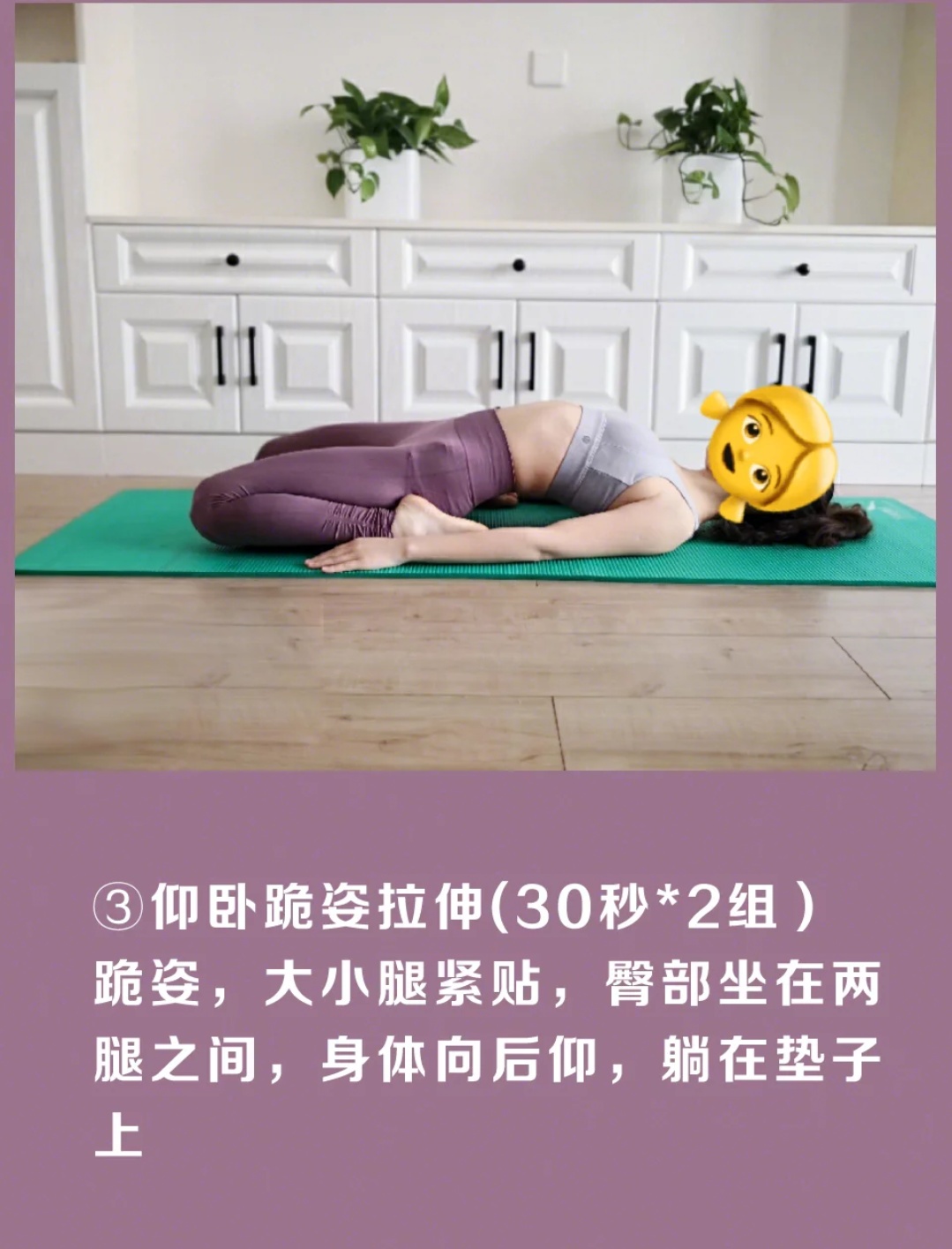 跪姿大小腿紧紧贴着臀部坐在两腿之间身体向后仰躺在垫子上 做这个动作时会感受到大腿前侧酸爽的拉伸感!