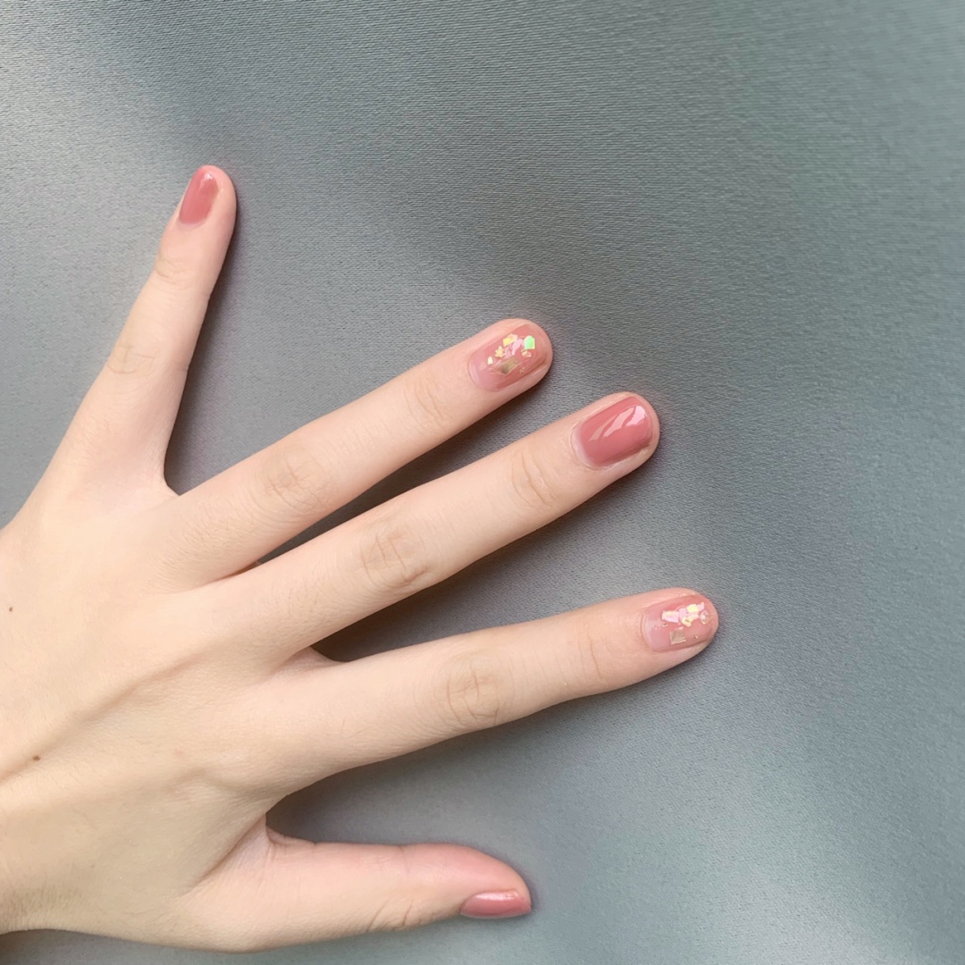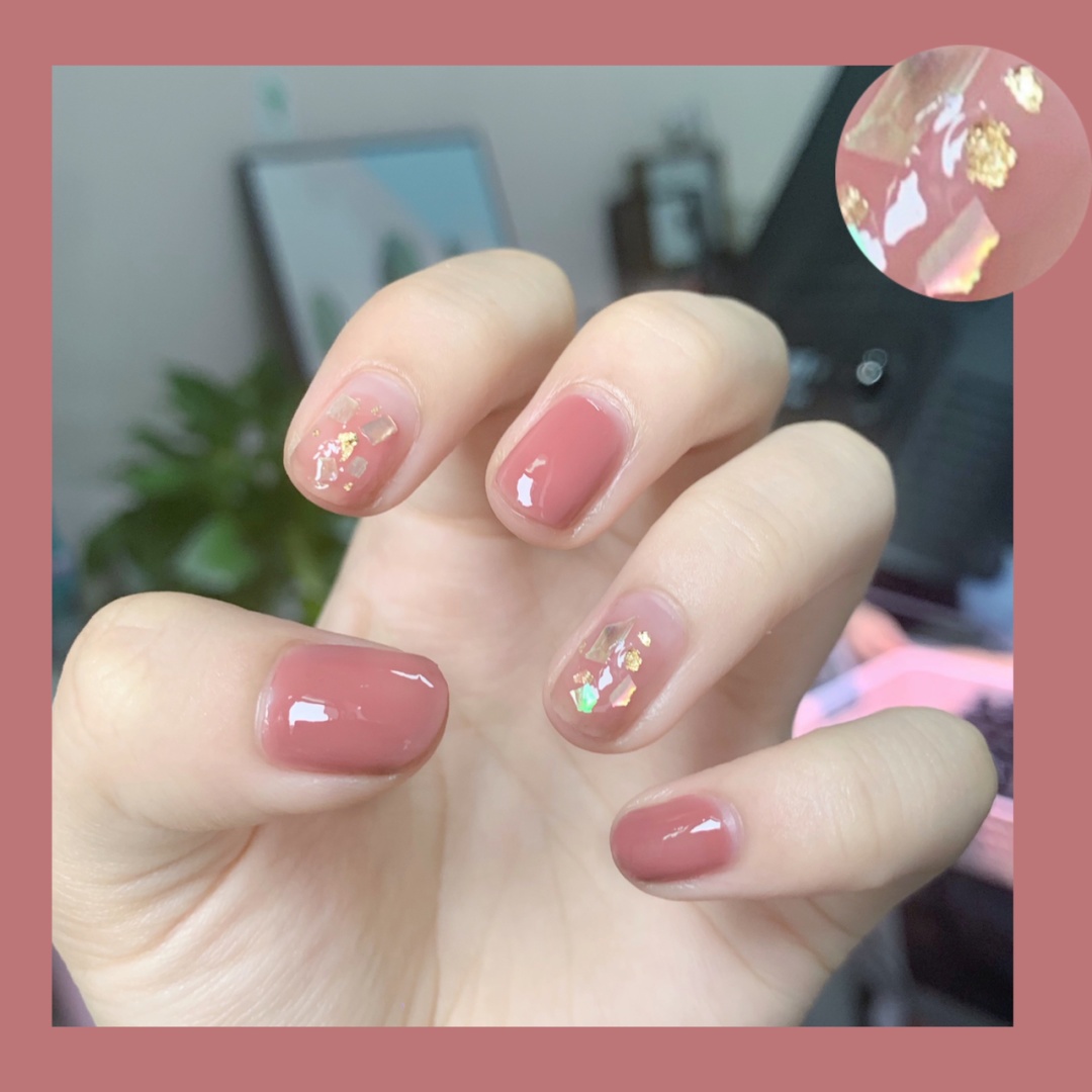 无名指和食指就是简单的单色晕染,放上贝壳片🐚和金箔纸,一点点闪的样子,超喜欢这个调调了 感觉搭配毛衣针织衫啥的都很棒!