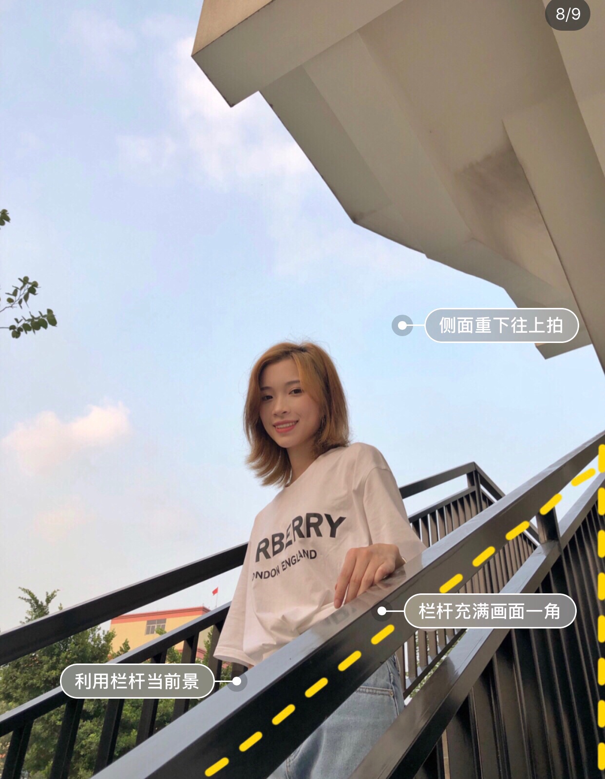 从栏杄侧面从下往上拍,栏杆充满一角