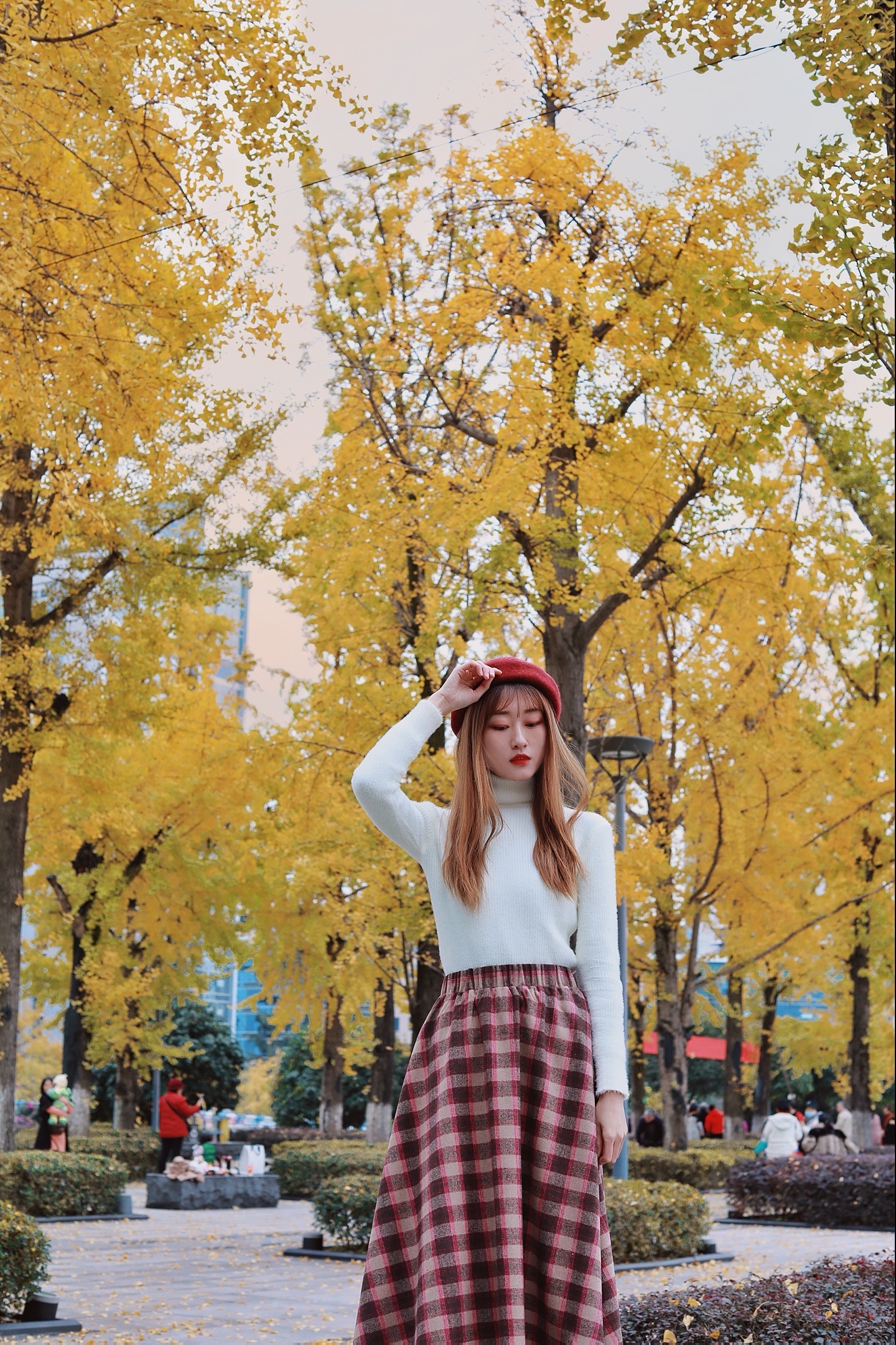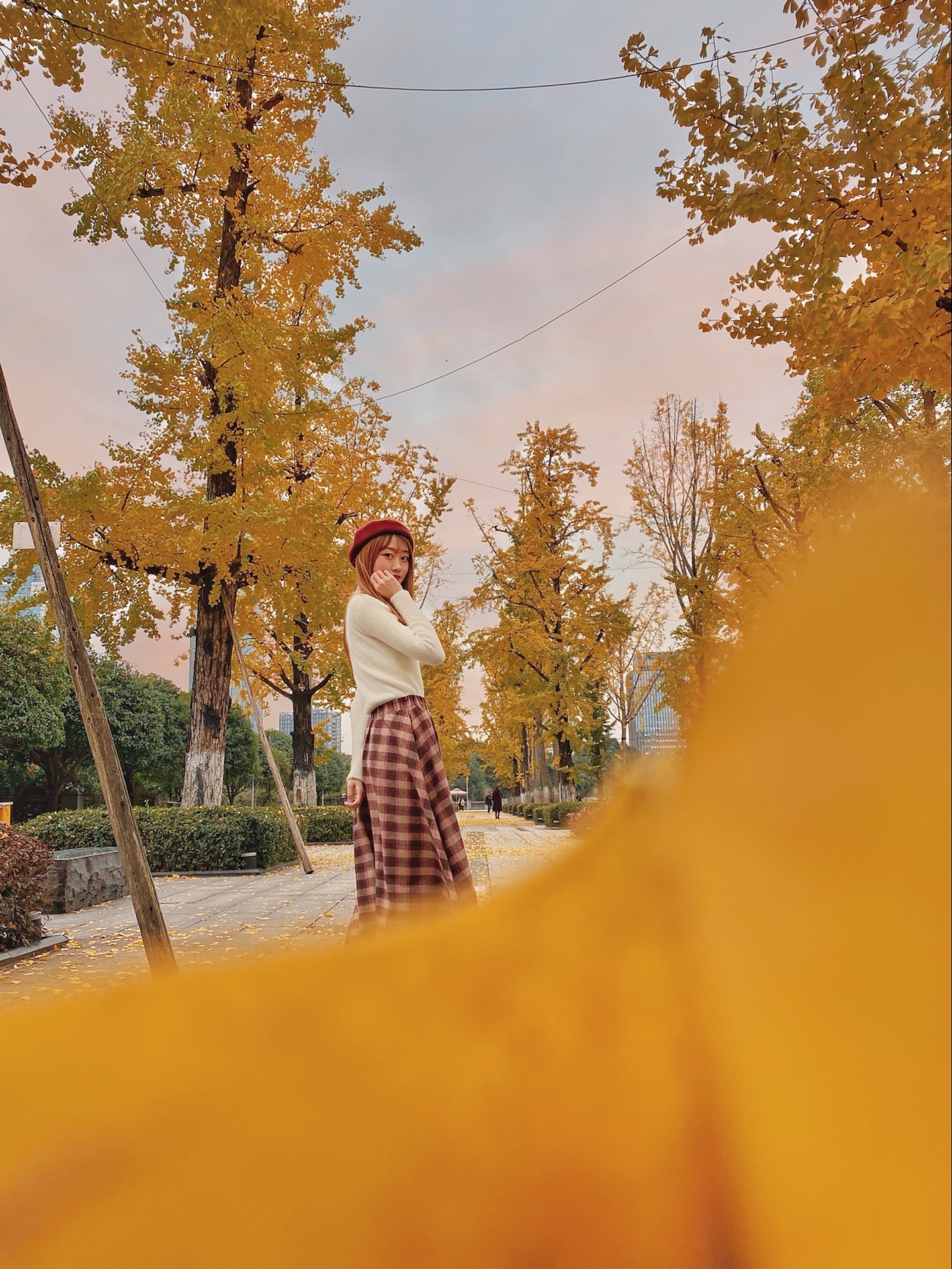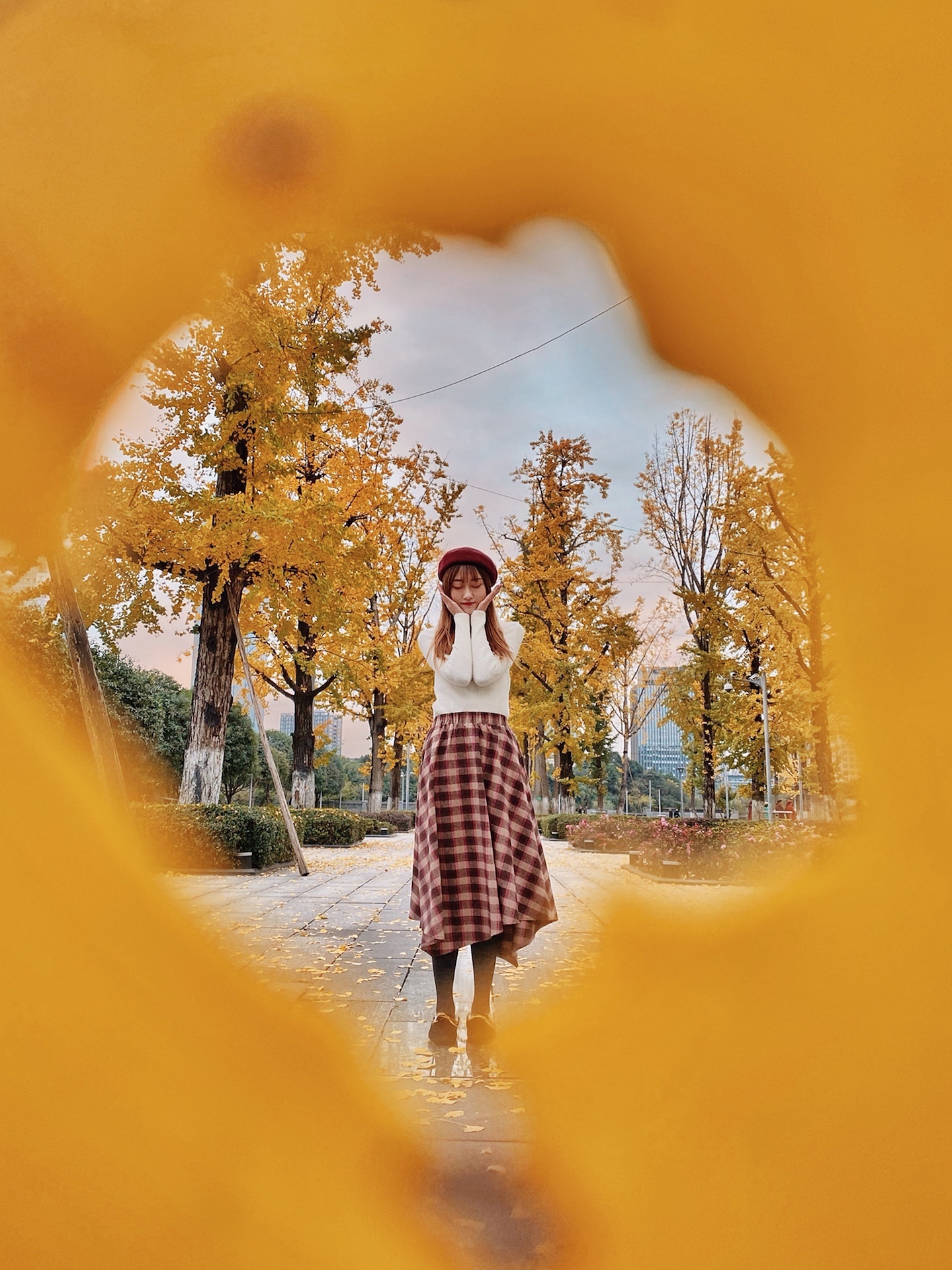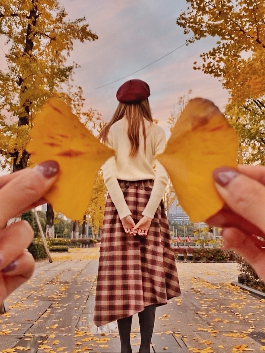 这样拍可以把人拍得很可爱,还可以遮挡不够茂密的银杏树!