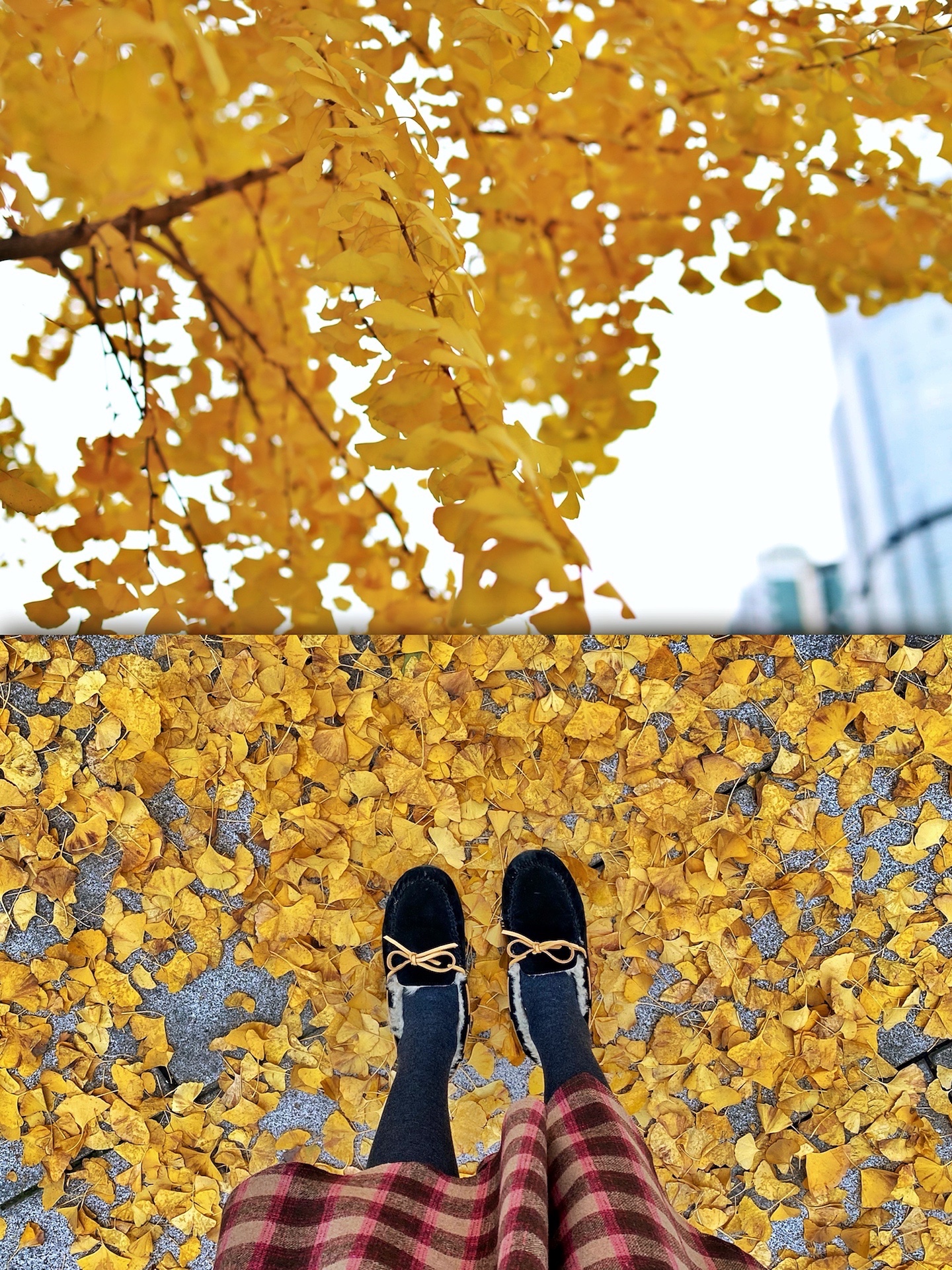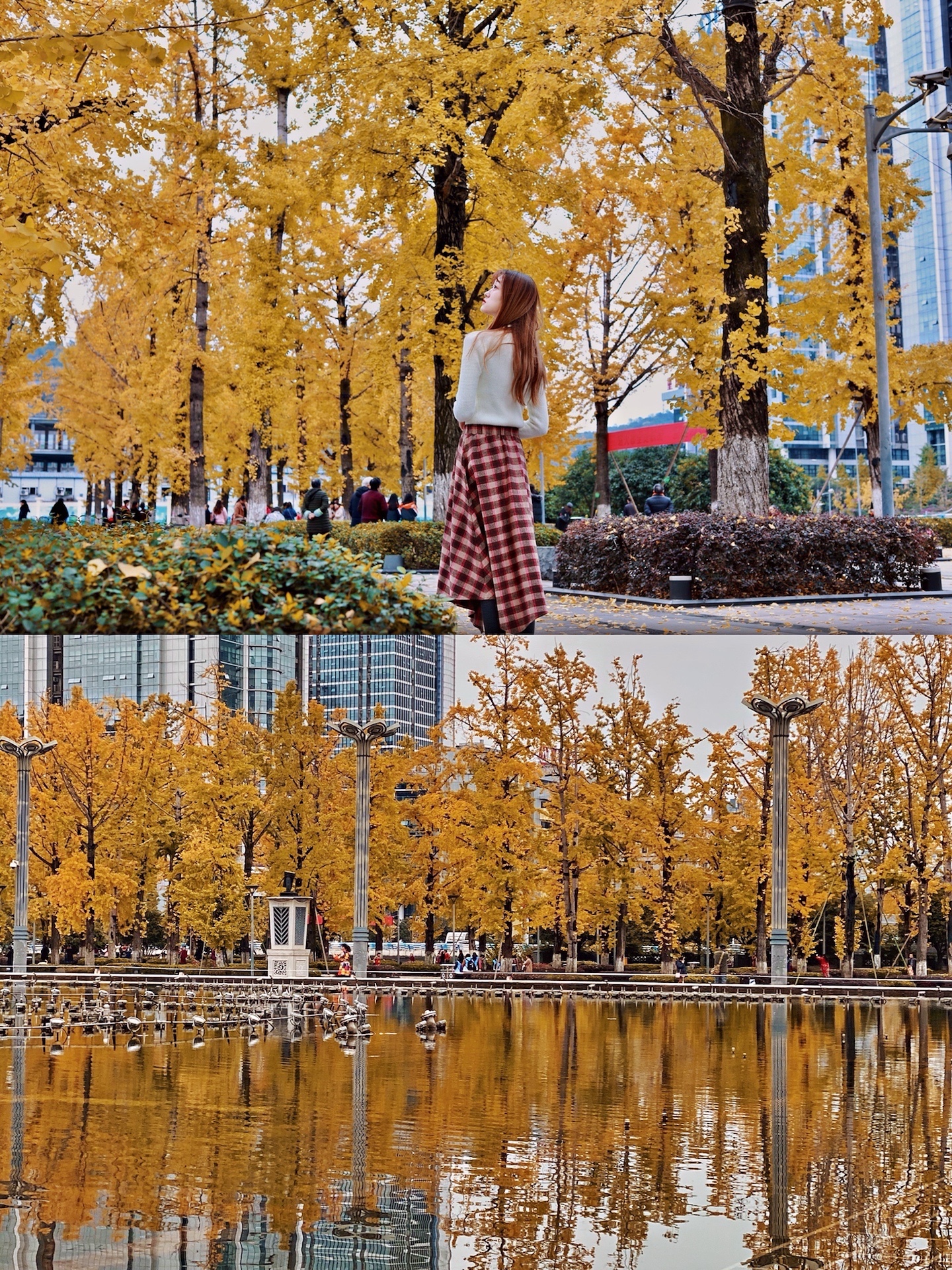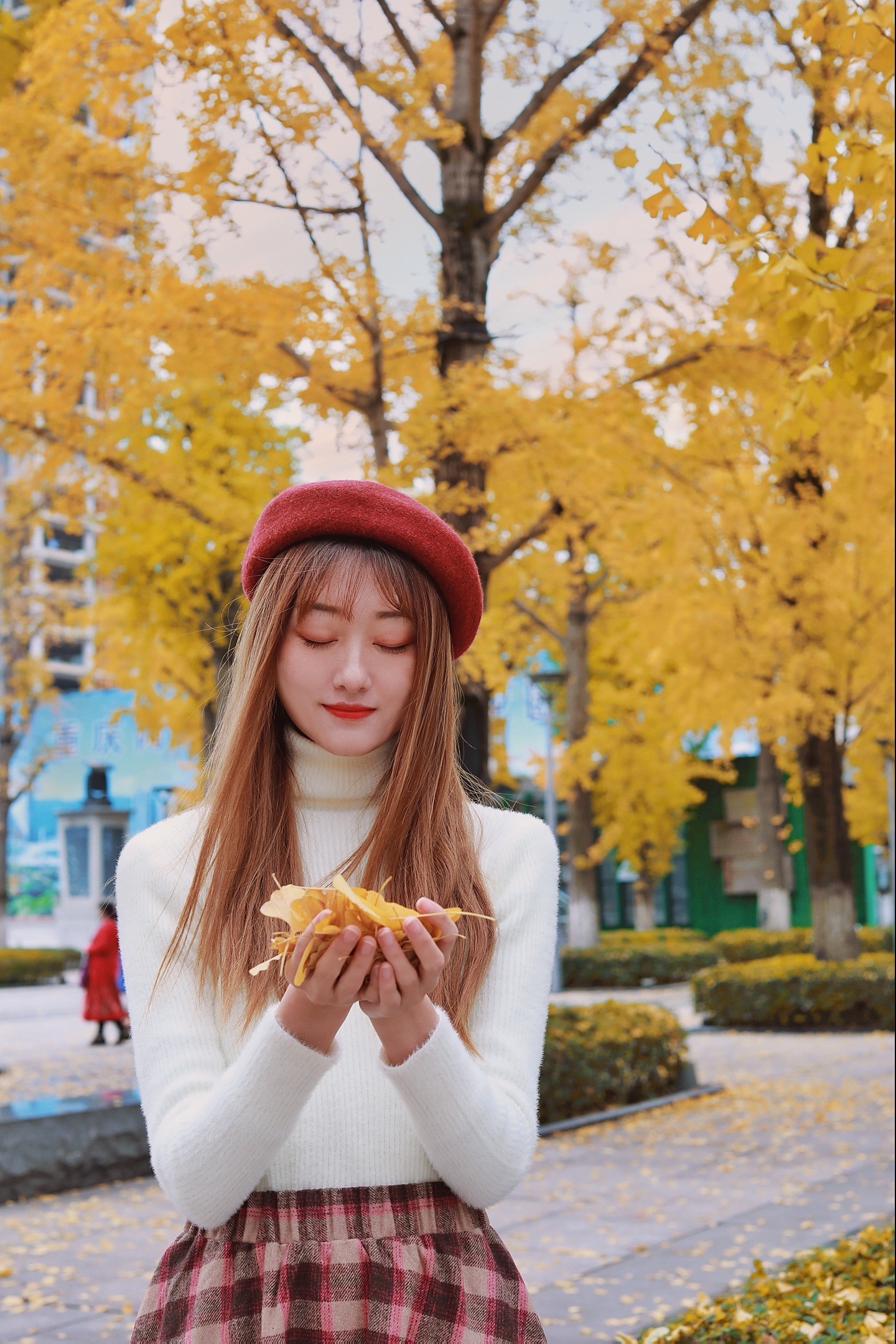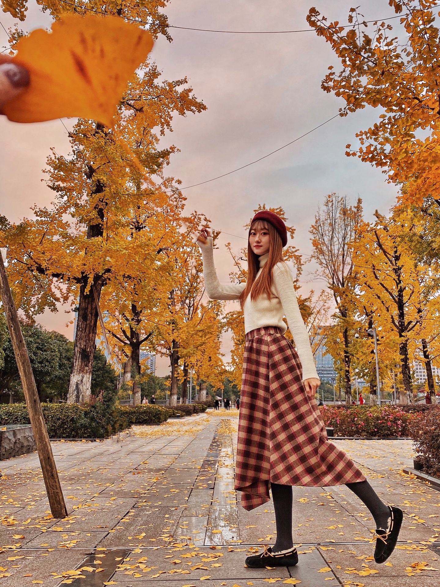 这样拍可以把人拍得很可爱,还可以遮挡不够茂密的银杏树!