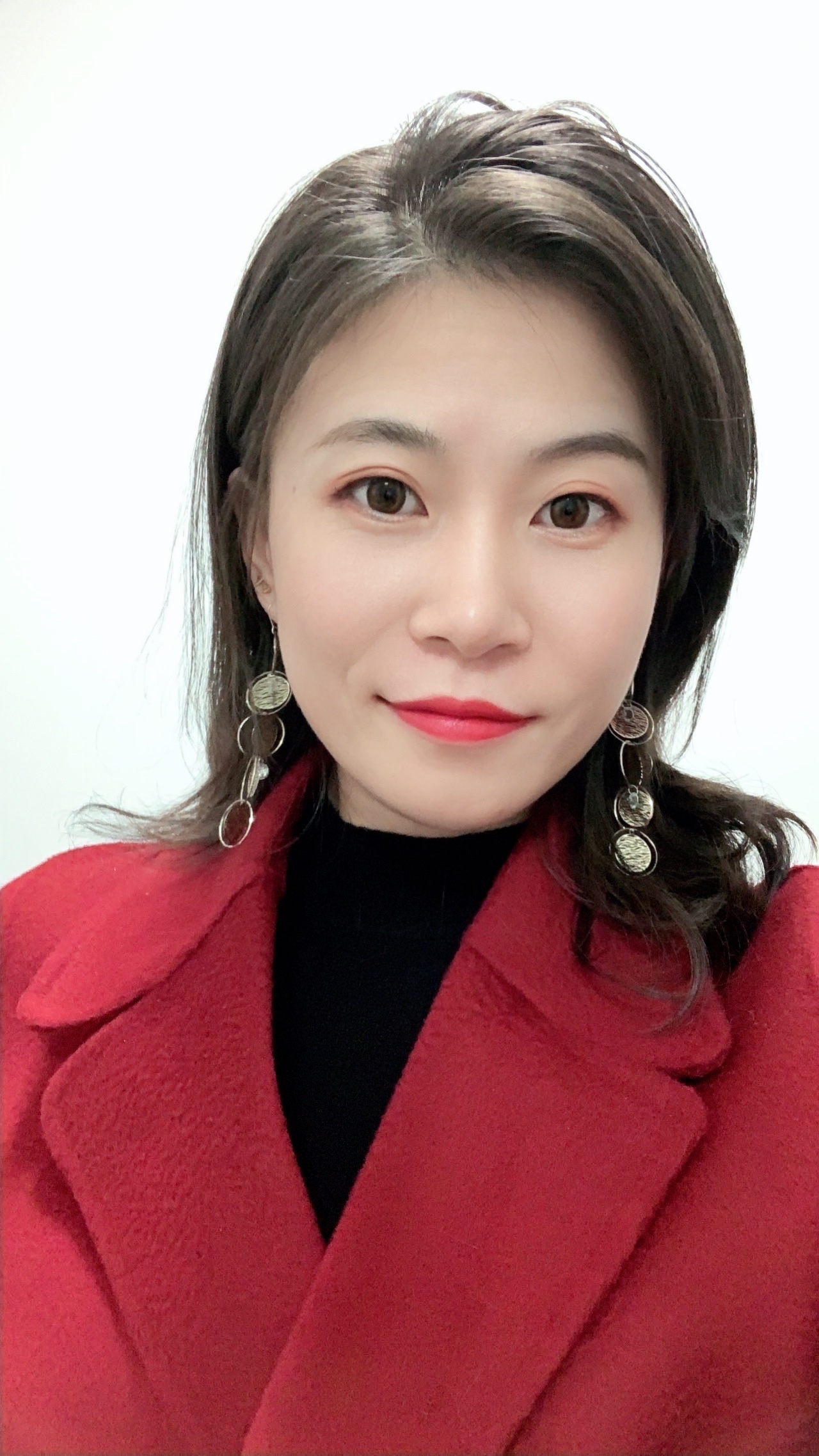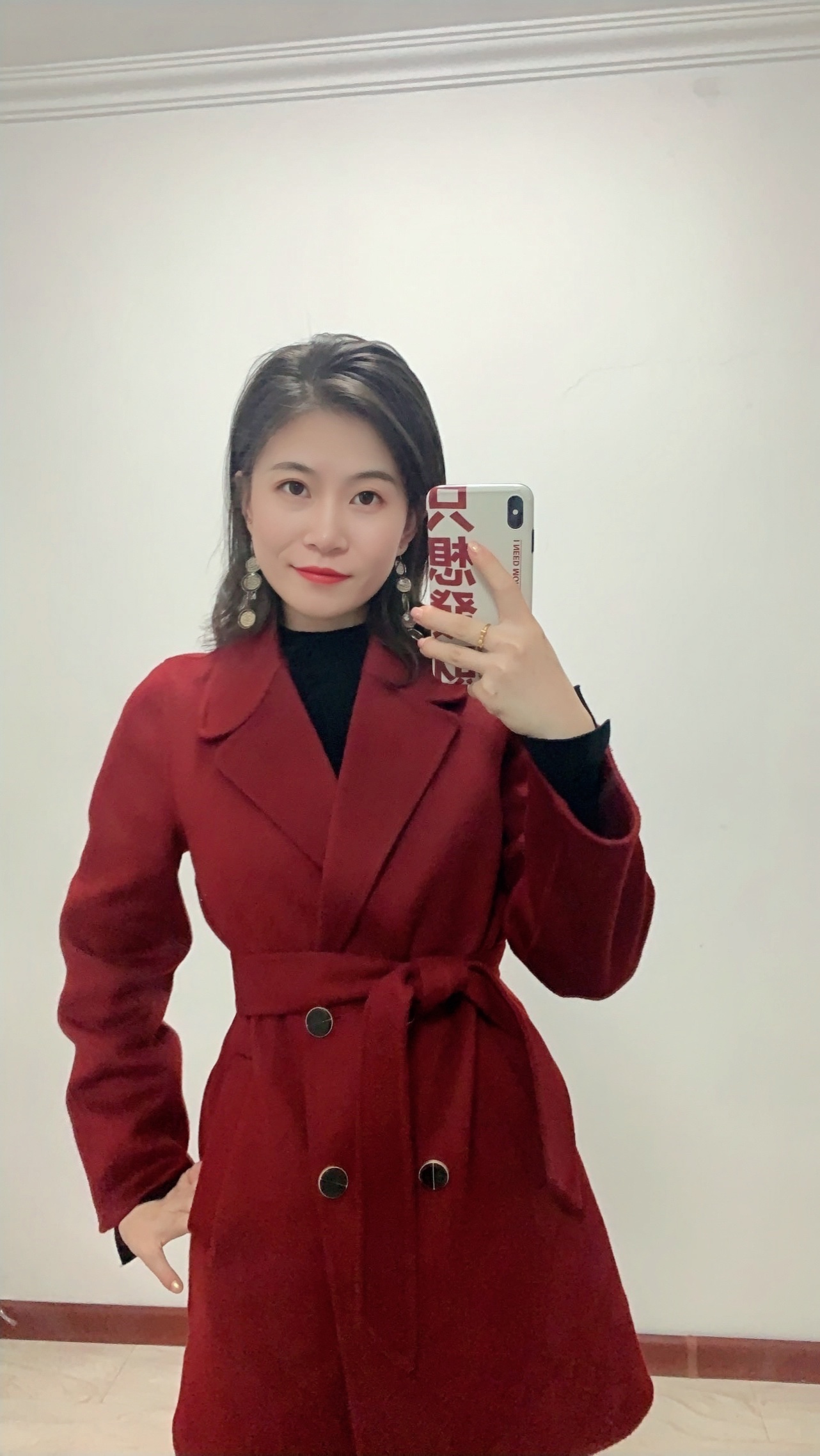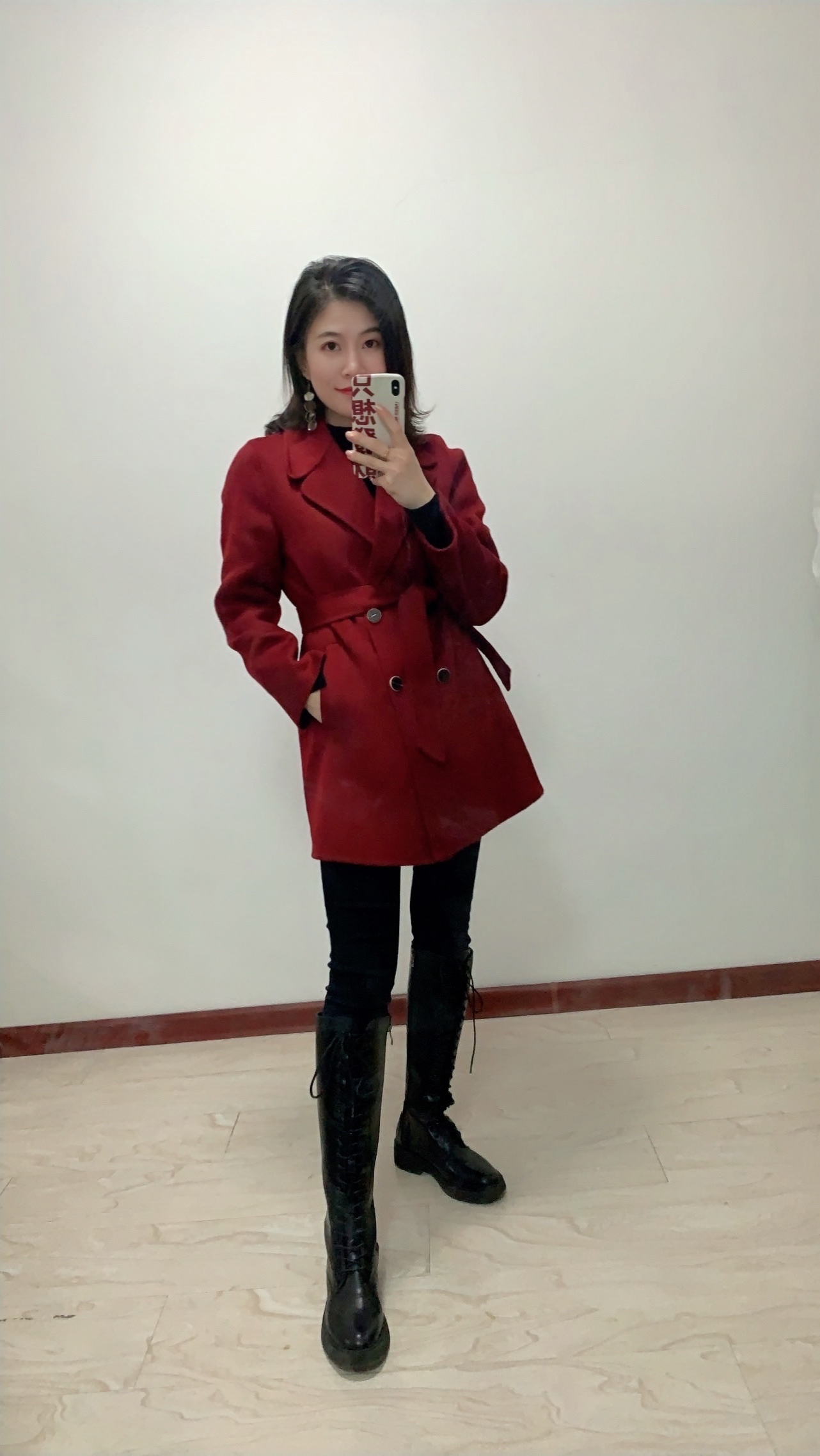 暗红色暗纹毛呢,黑红色的搭配特别显气质,内搭羊毛衫,紧身裤,骑士靴都是黑色,外套这个红色不轻浮,也不会过于沉闷。搭配了很有设计感的长款耳饰,整体上非常简约,腰带很好带出腰身,显高显瘦~