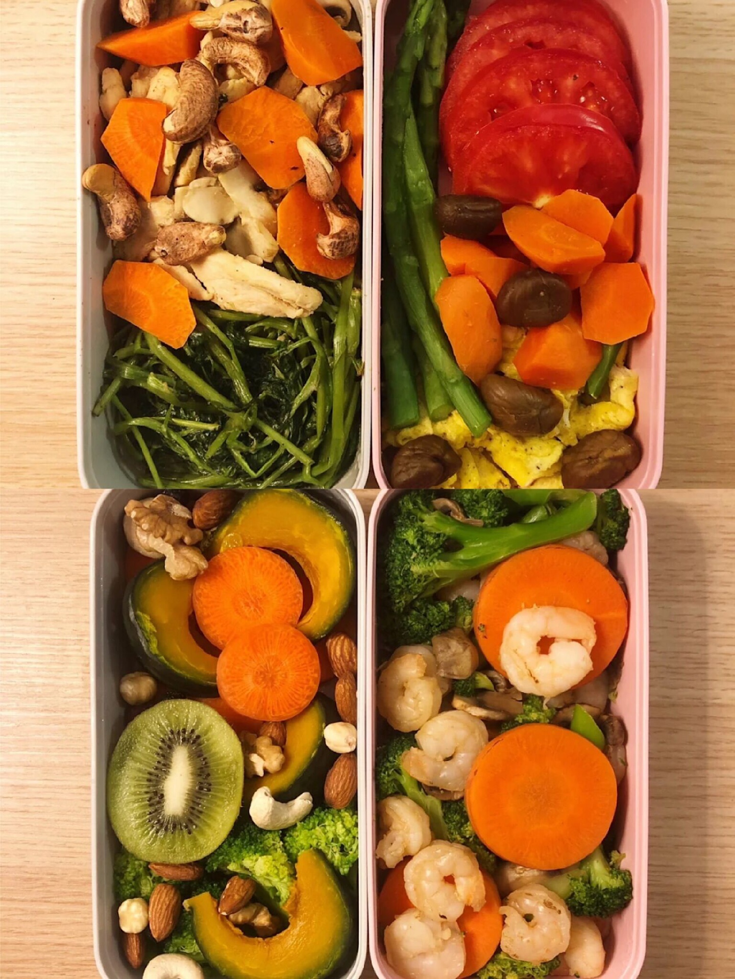 4️⃣焯西兰花+蒸南瓜+坚果+猕猴桃+西兰花炒虾仁胡萝卜