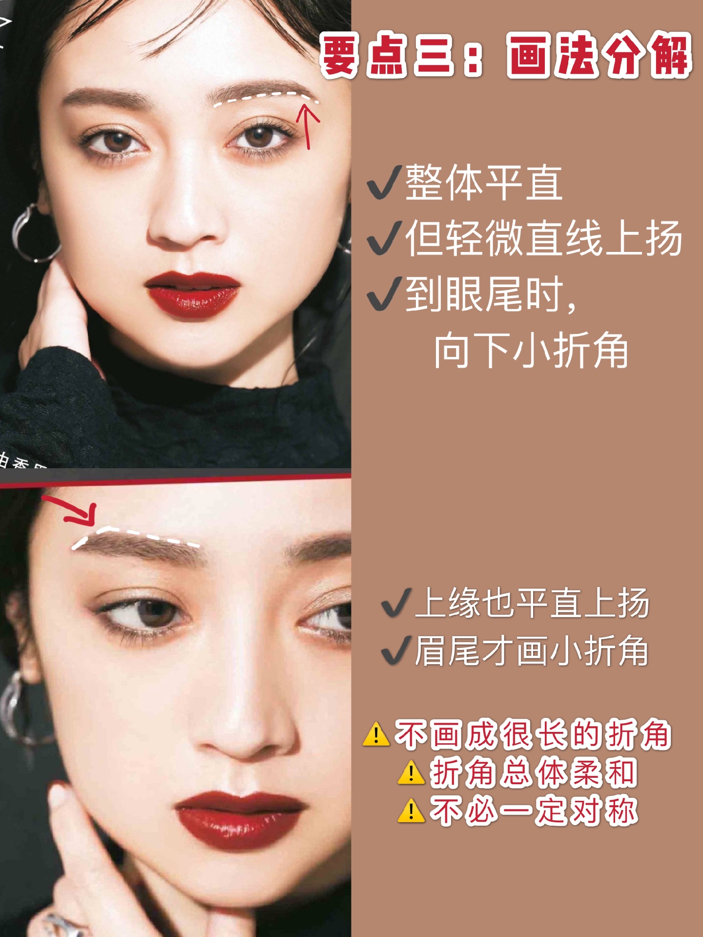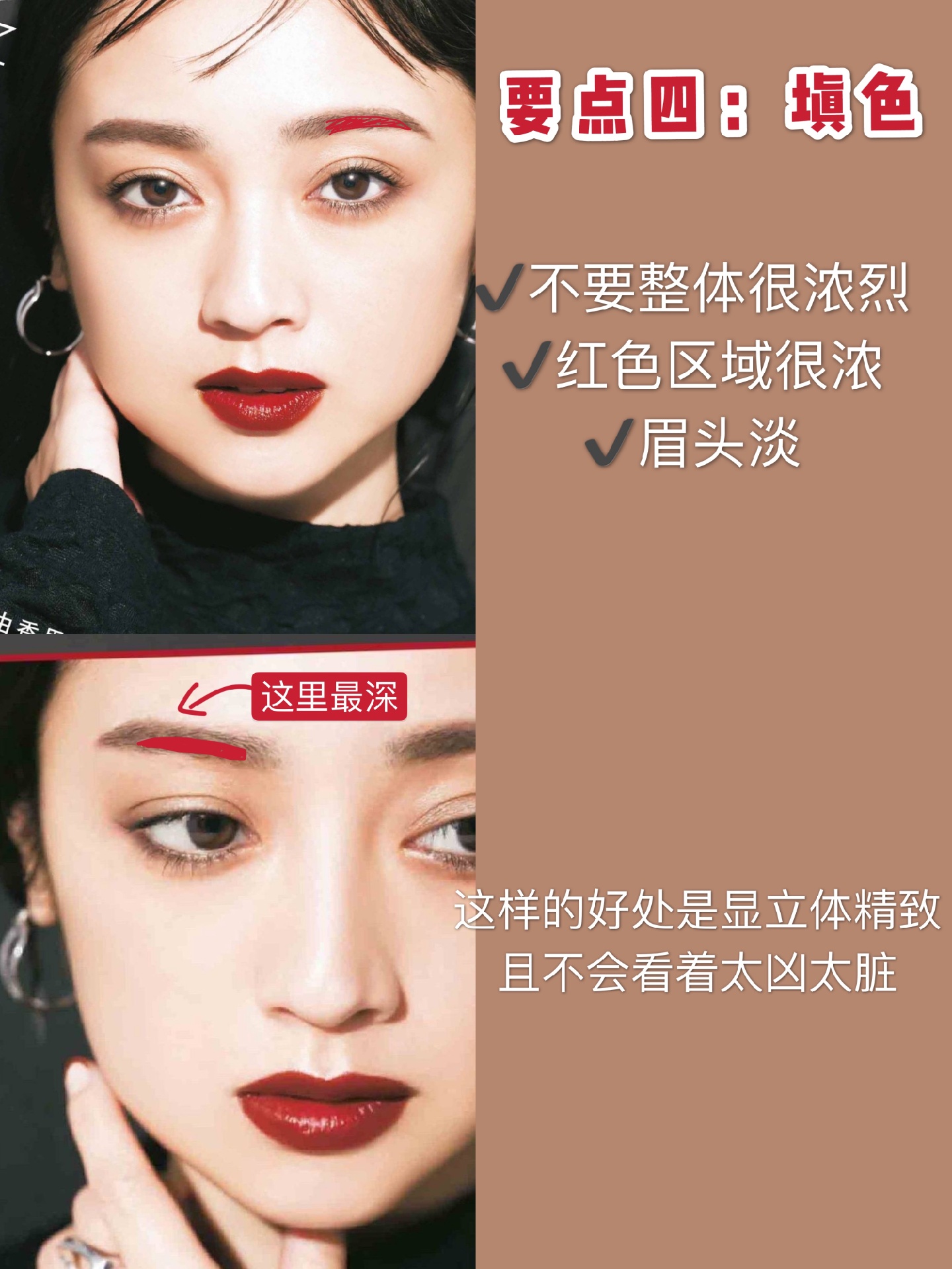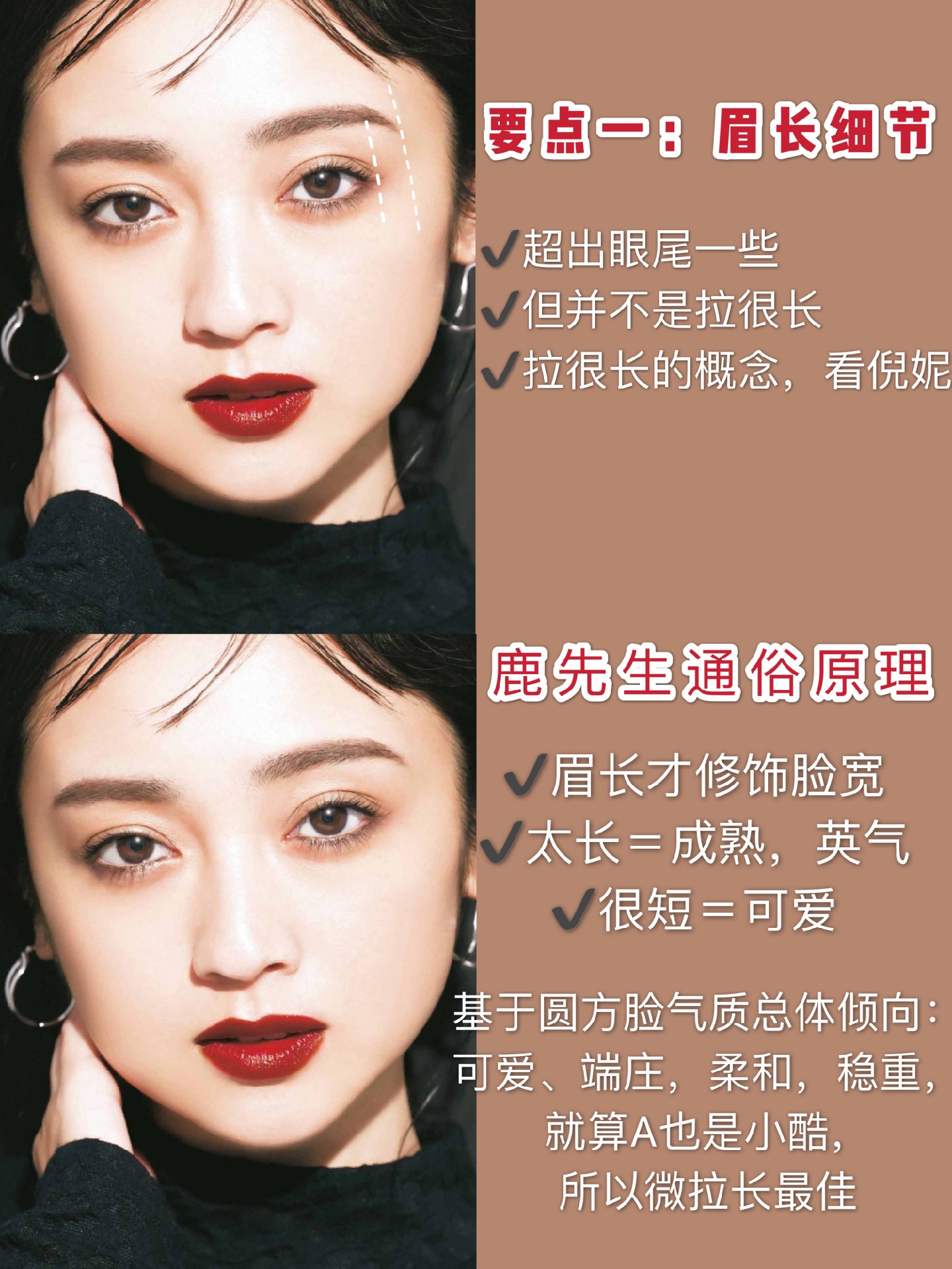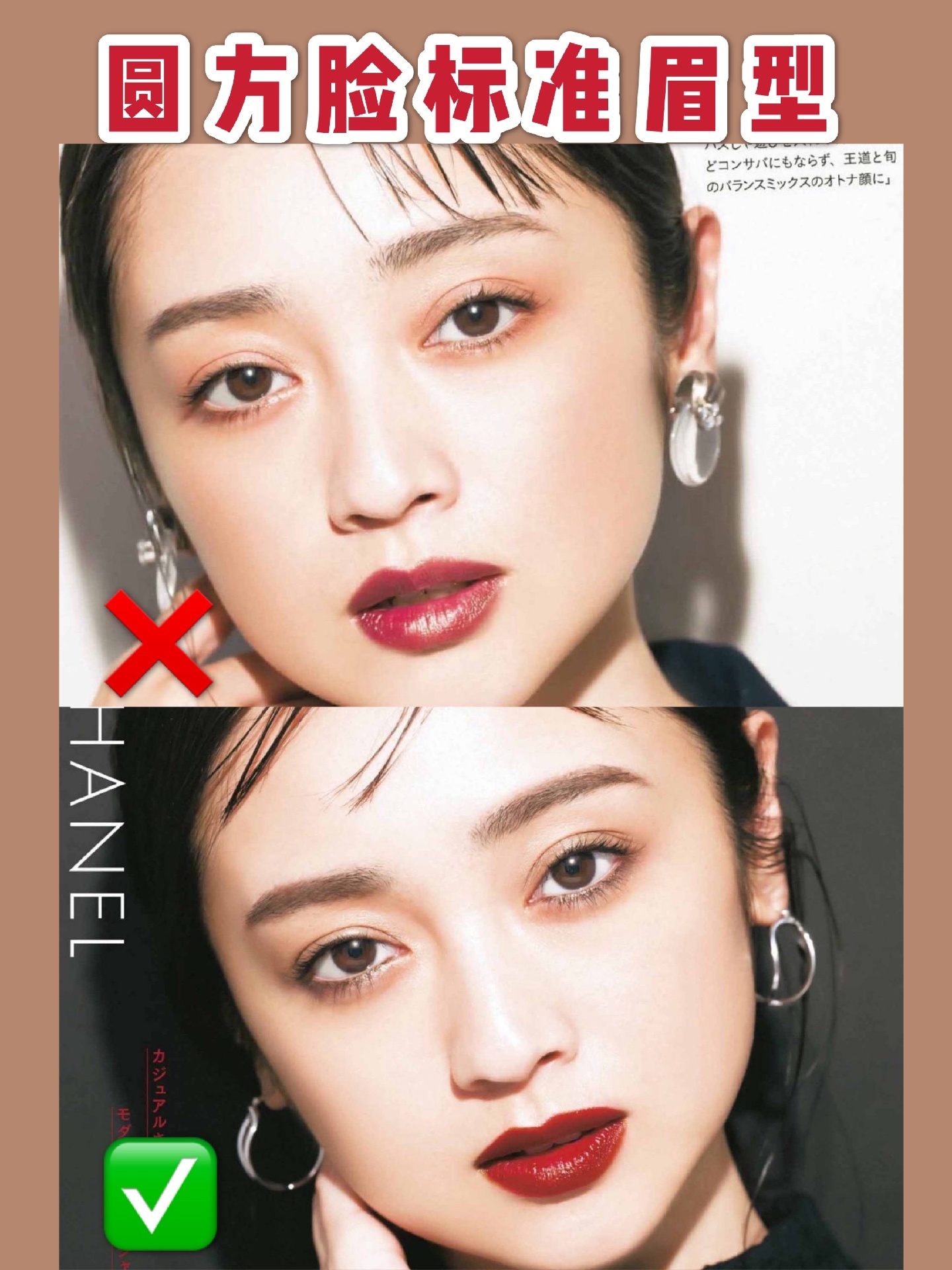所以,如果你的圆方脸更柔和端正,眉色淡一些,更端正气场,颜色更重,眉长稍长。