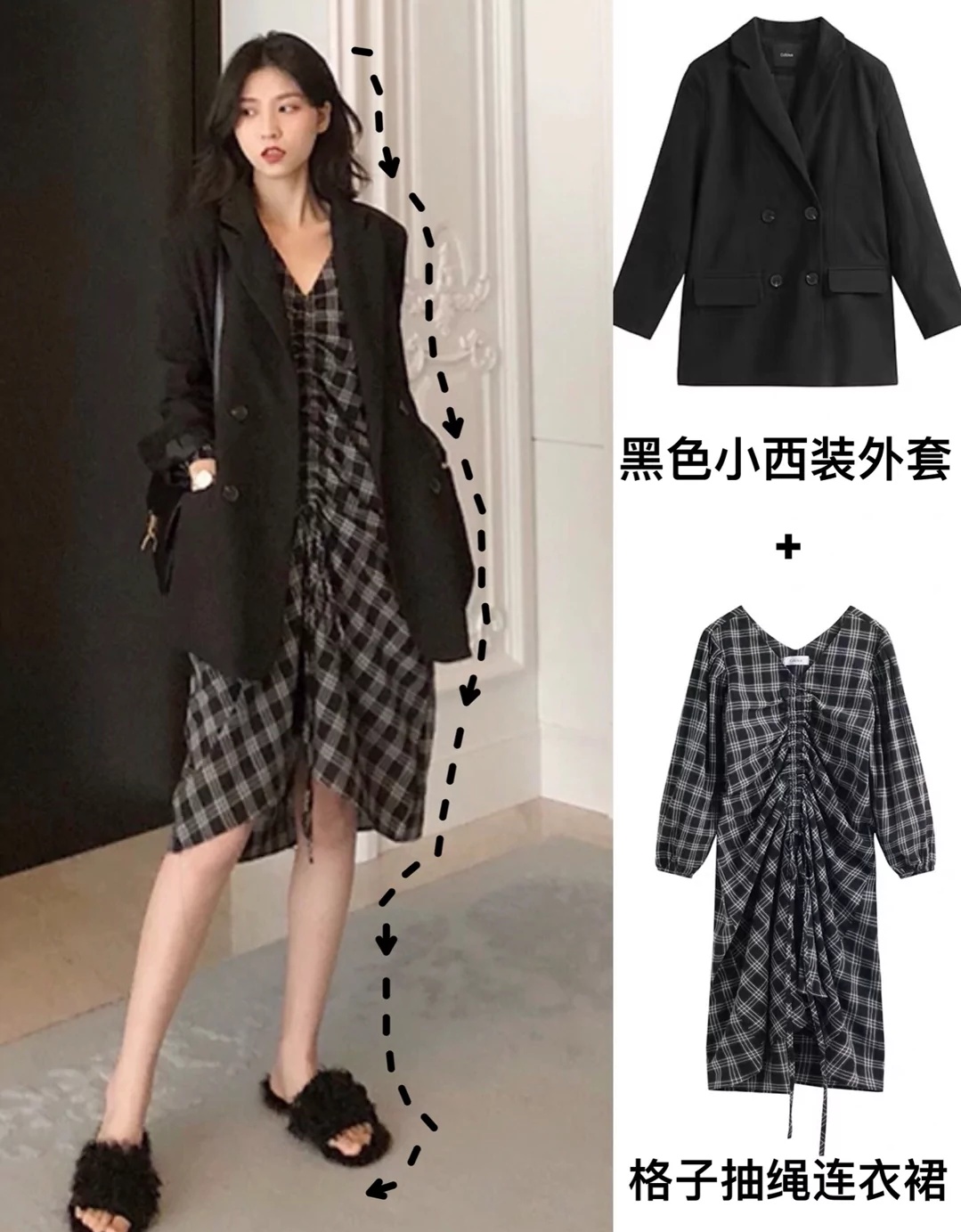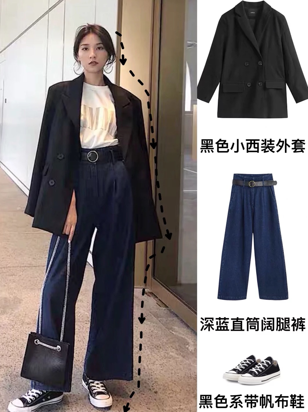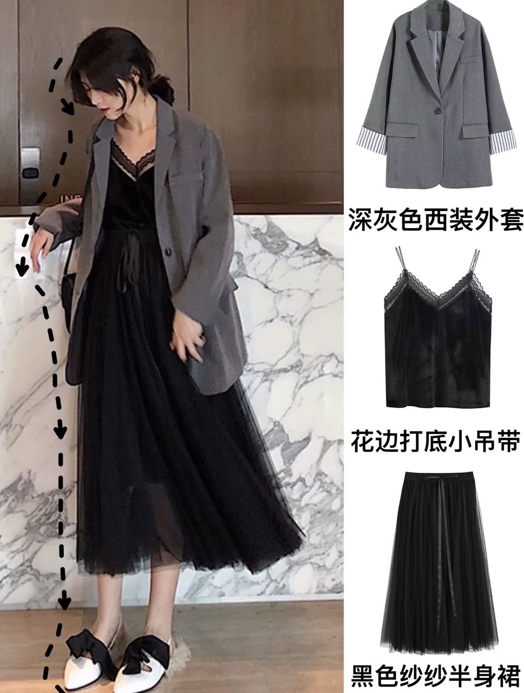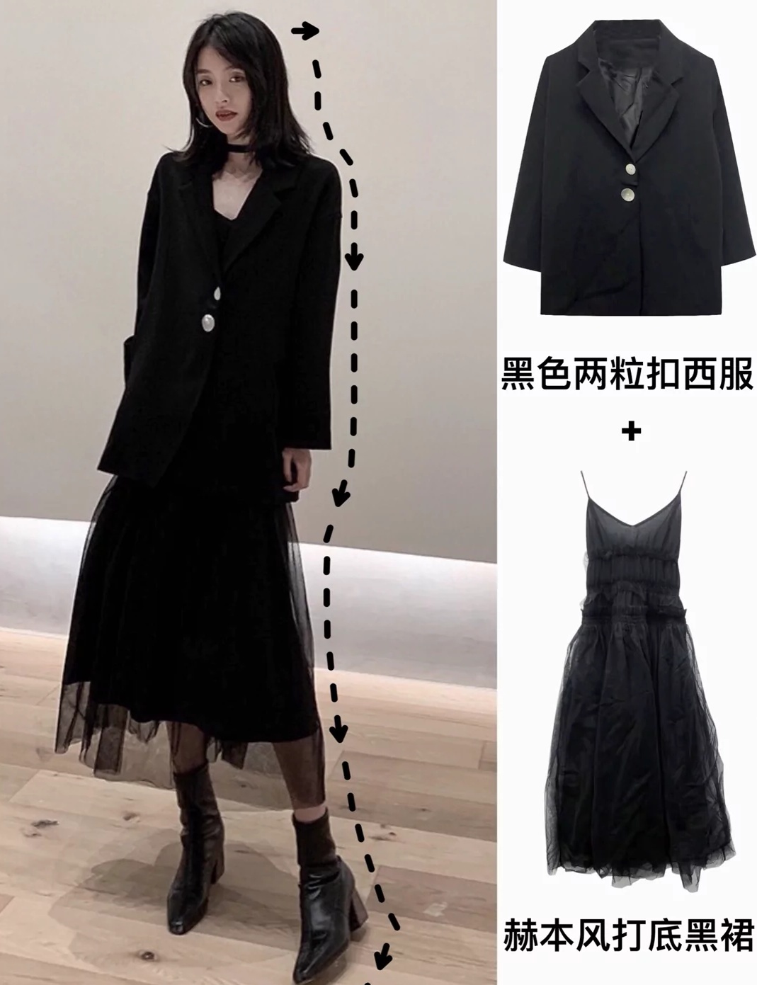 暗黑系西服外套、直筒阔腿裤、黑色纱裙简直是标配啊,黑色、白色、深色又是暗黑系的主色调,只要这样搭配起来绝不会踩雷!