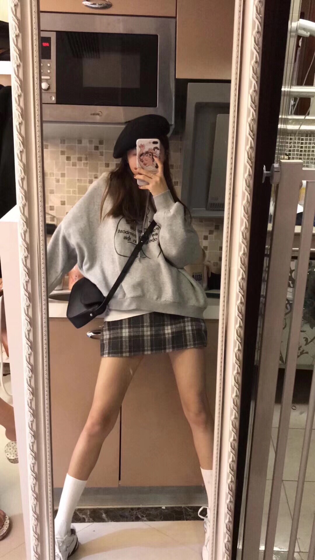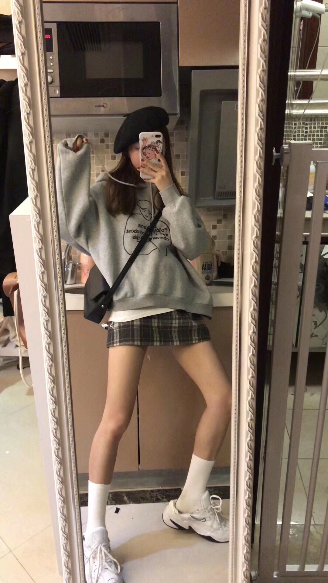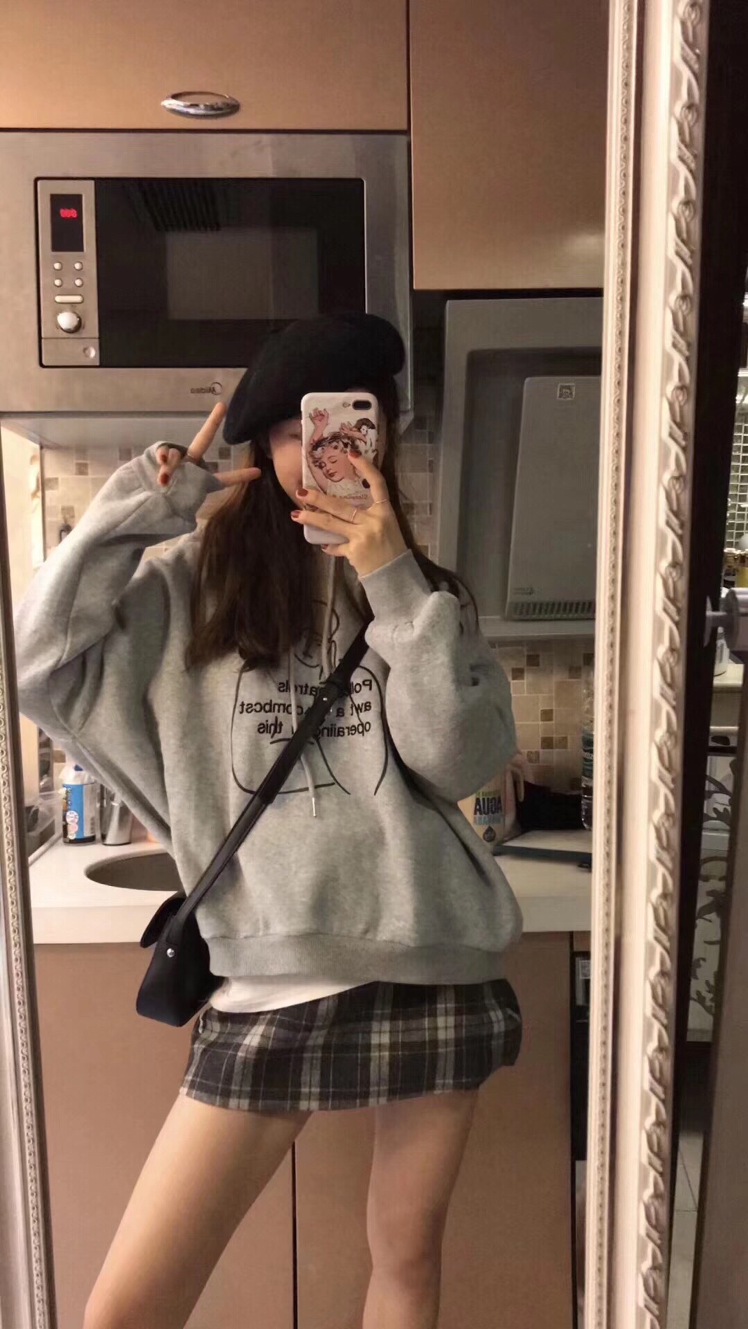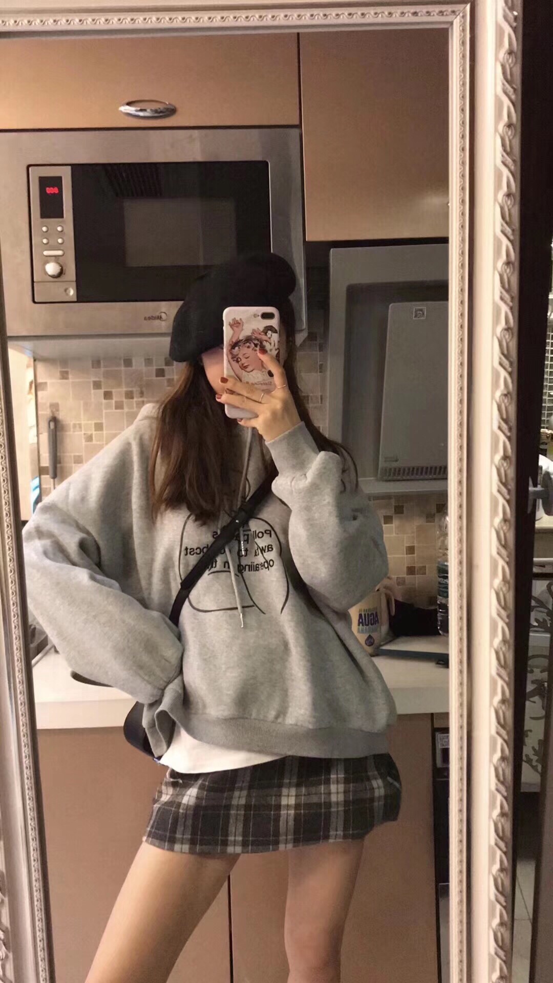 灰色卫衣加绒,叠加白色内搭搭配灰色格子裙,休闲阔爱