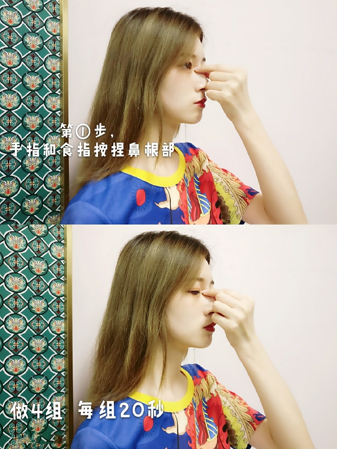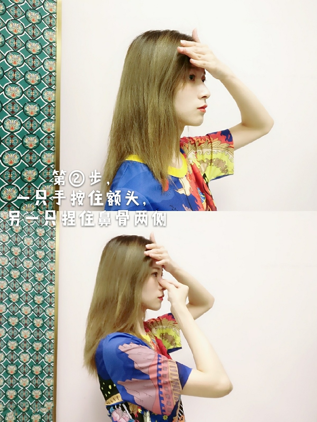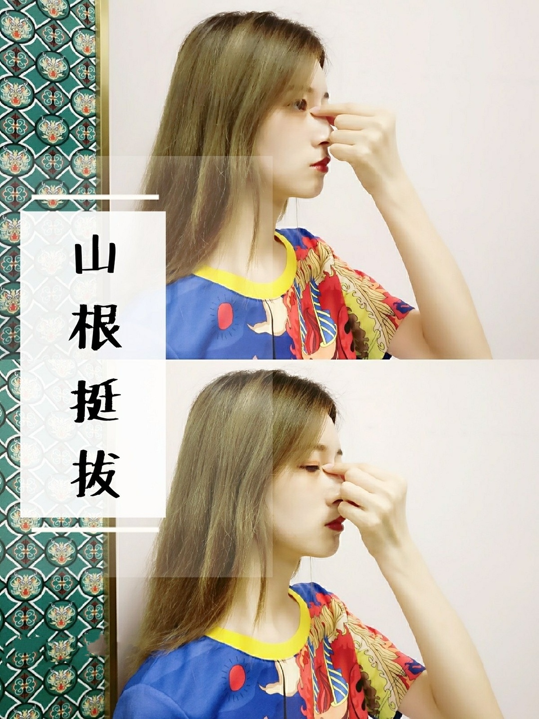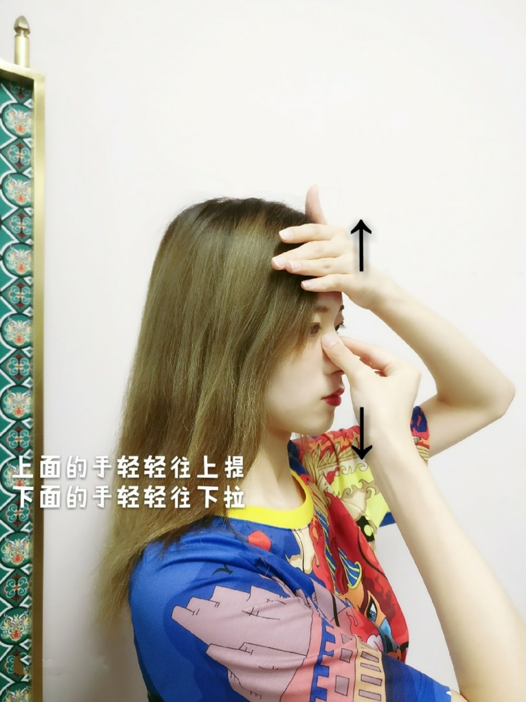 一只手按住额头,另一只手捏住鼻骨两侧,比刚刚那个按捏位置下一点点哦🌝🌝然后上面的手轻轻往上提,下面的手轻轻的往下拉,山根部位有轻微拉伸感就可以啦!