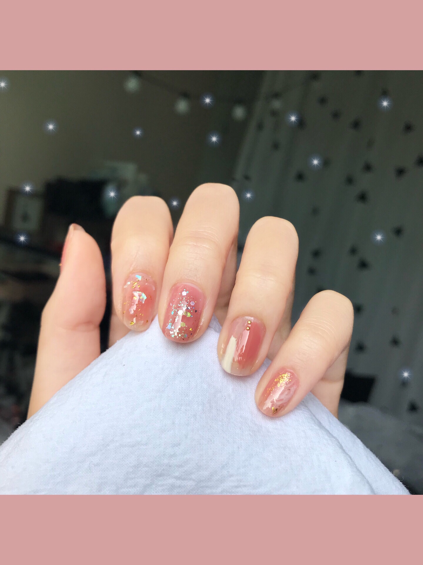 💕大拇指和小拇指用怀念和蕾丝进行了晕染,再在两头放点金箔碎片,闪起来💖