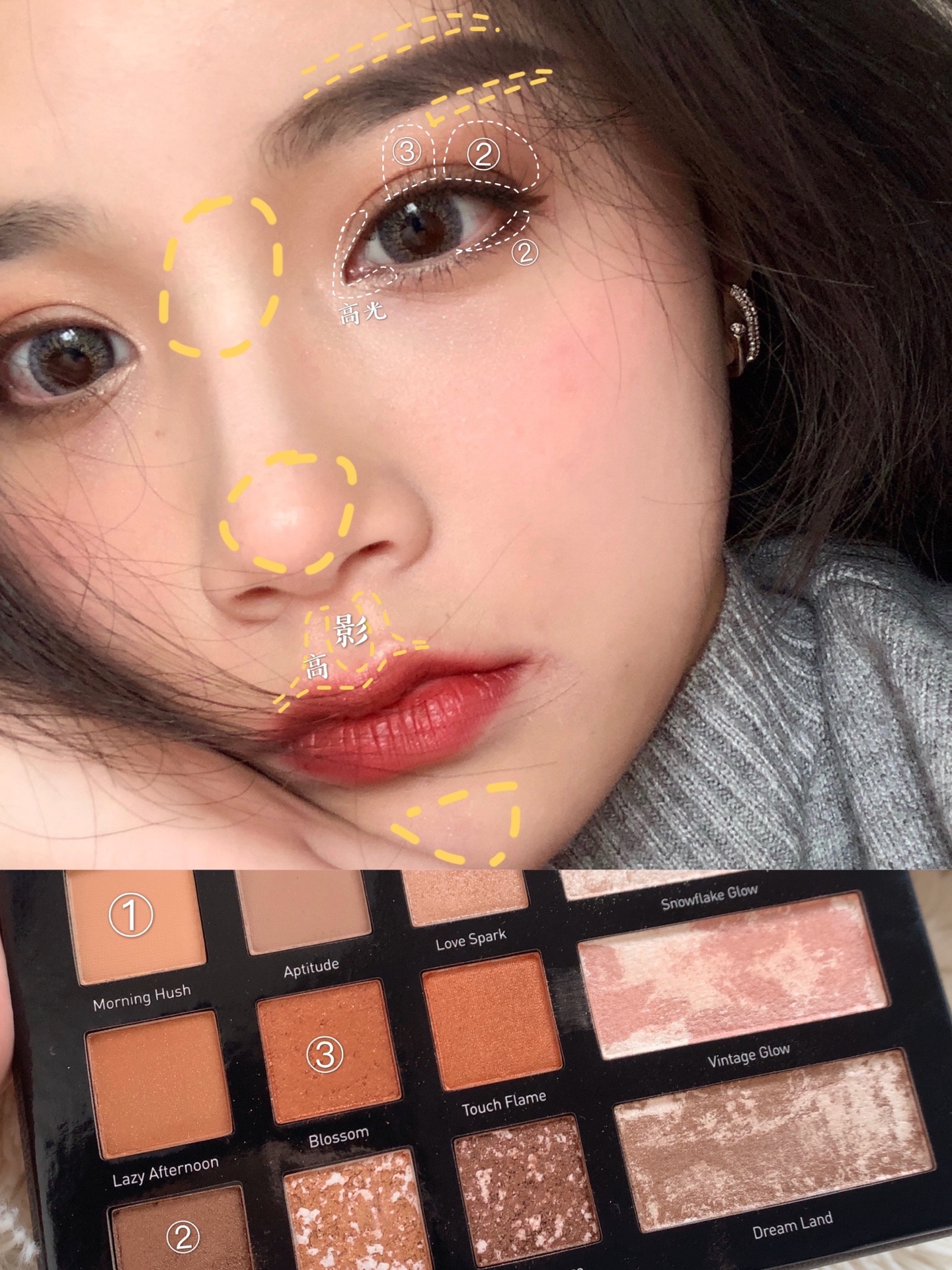 看看图四,在眼角眉骨、唇峰处也记得加高光!眼妆也是很简单,浅色打底,深色在眼尾处加深,中间提亮,就OK啦~阴影要说一下,在人中处加深~人中边上凸起的部位加一点高光,整个人看起来会更立体水灵~这里下手要轻一点。
