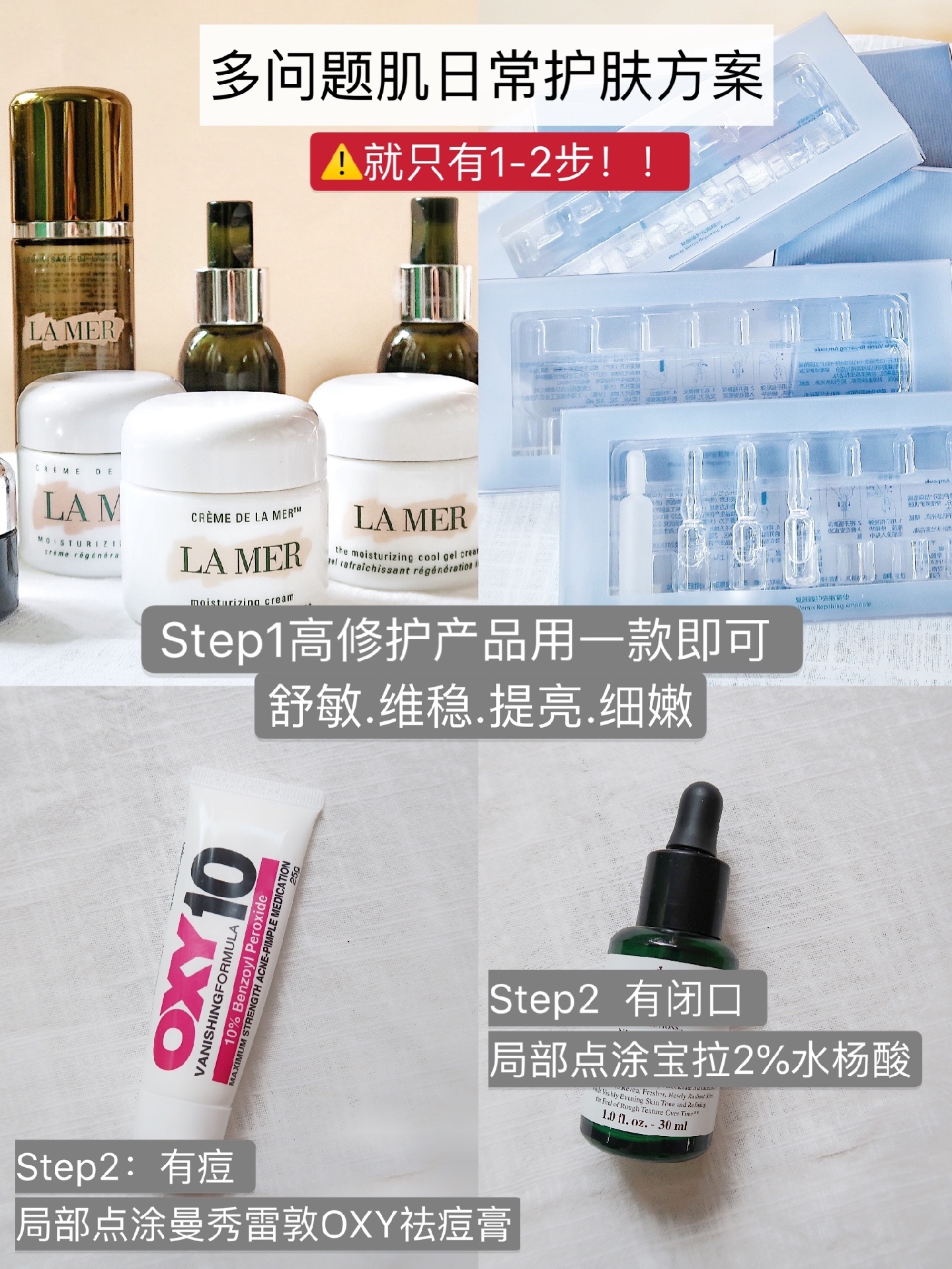 如果有痘和粉刺的人就先用用海蓝之谜或小银针涂一层,有粉刺,局部点宝拉2%水杨酸;有痘,局部点曼秀雷敦oxy10%消痘膏即可。