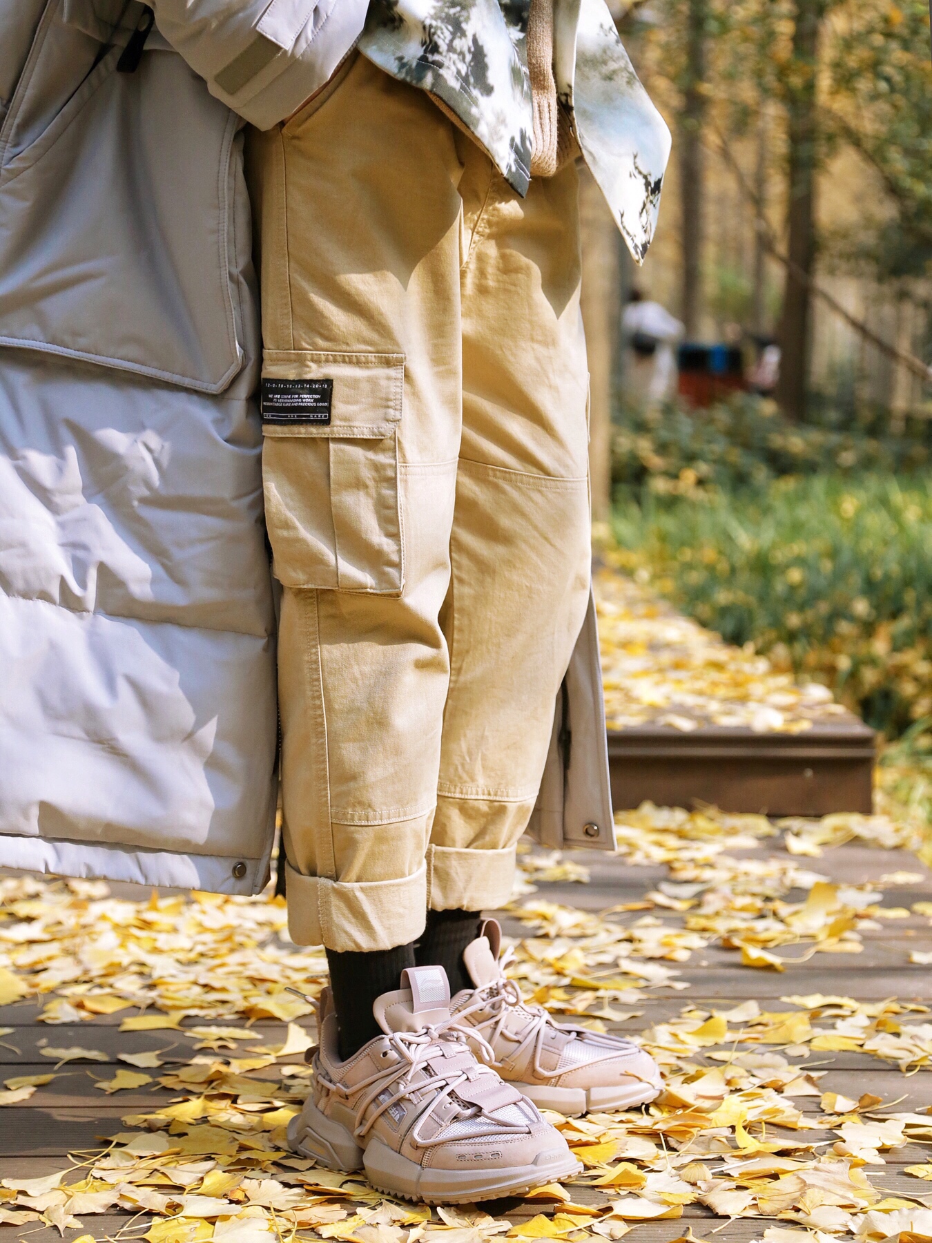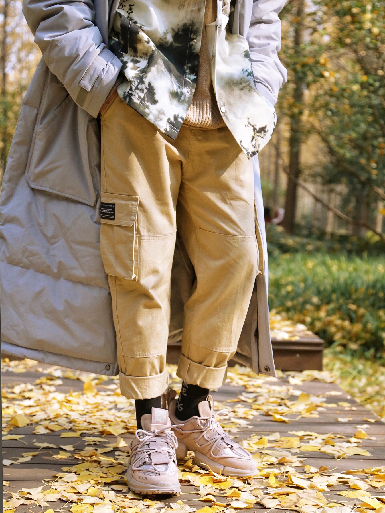 裤子:浅卡其工装直筒裤;