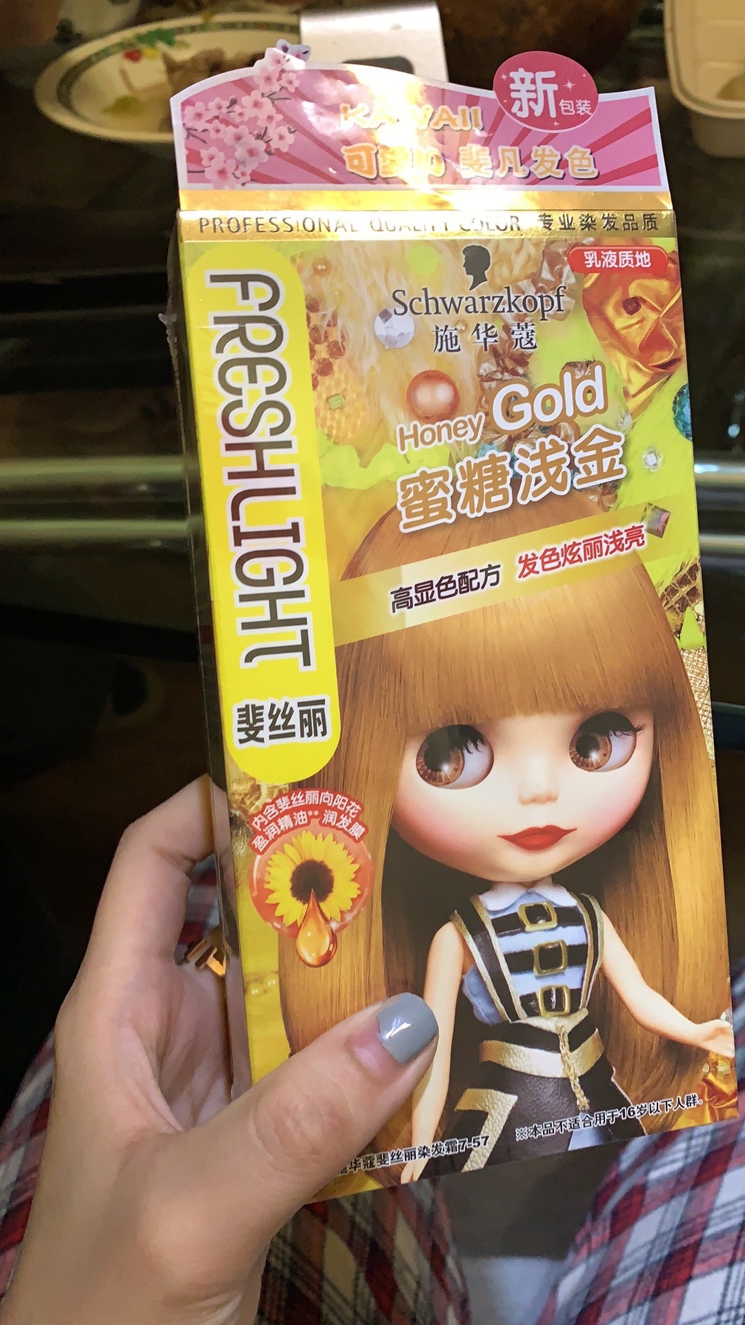 在家让妈妈帮我操作了施华蔻乳液染发剂的【蜜糖浅金】,效果出来超级满意,美哭了~