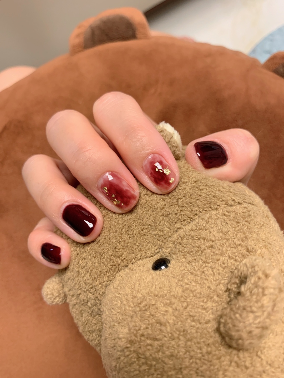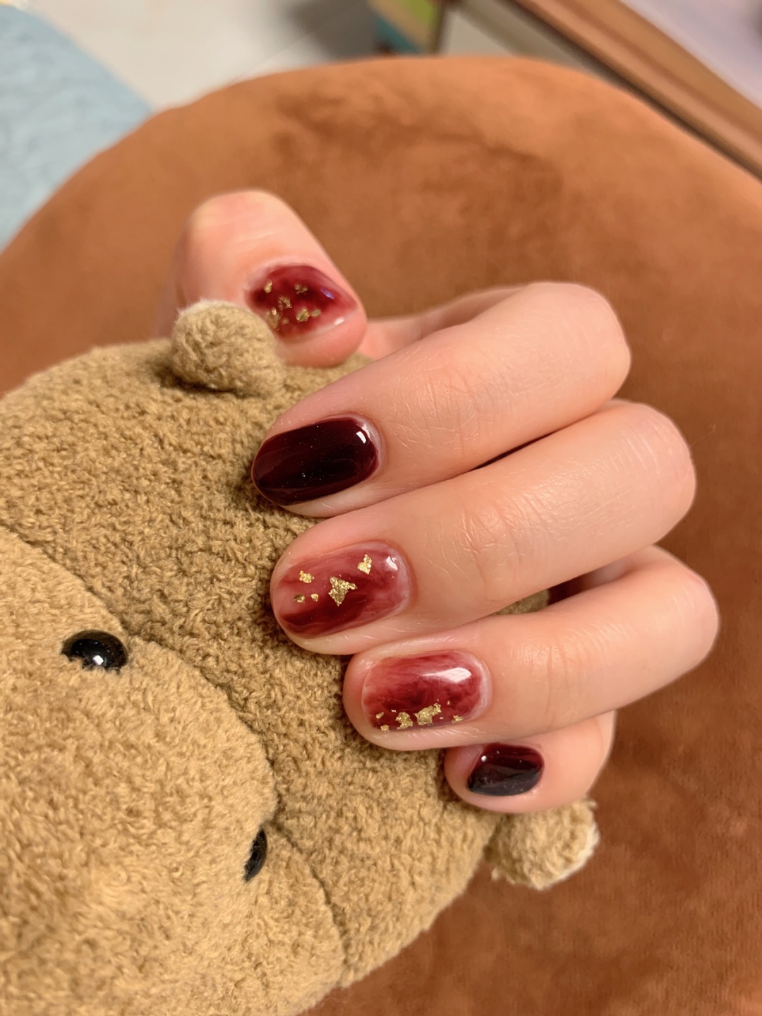 深酒红涂了四遍,晕染乳白色打底一遍,晕染三次,用可卸底胶晕染的,贴上金箔,一点点,没有贴全甲,效果还是不错滴。适合秋冬,新年,超级显白。
