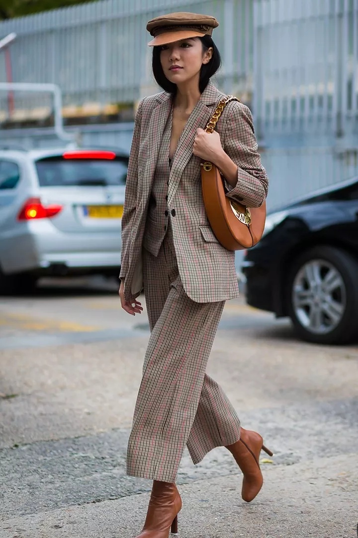 格纹西装的组合优雅又复古,再歪戴上一顶蓓蕾帽,时髦和优雅瞬间都有了~