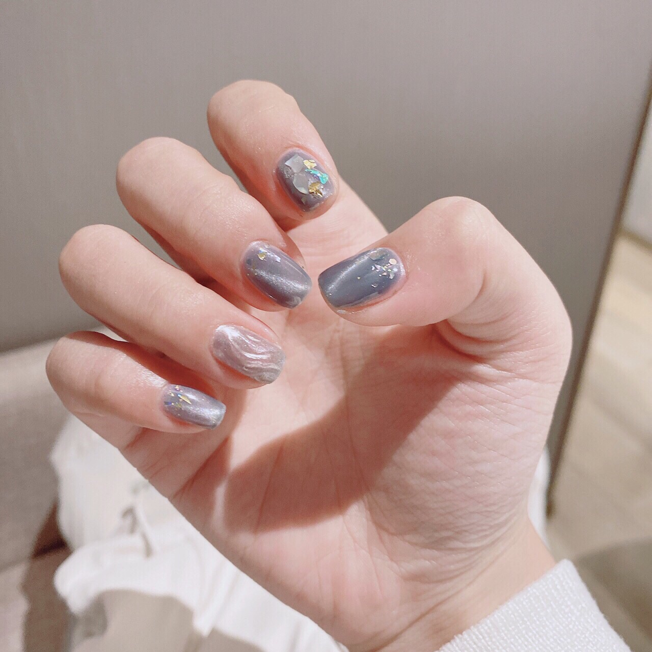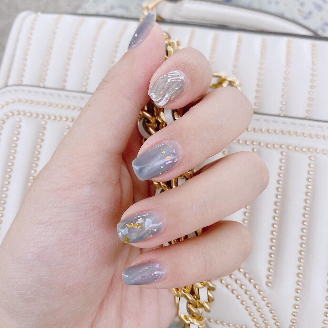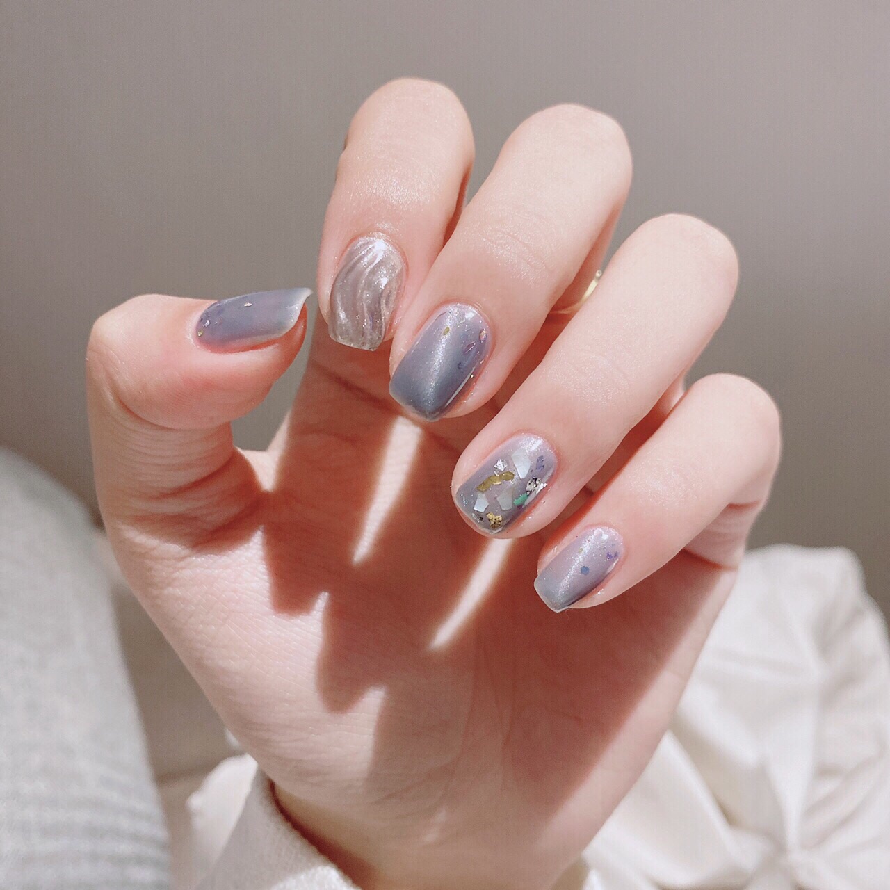 蓝灰色猫眼美甲➕水波纹➕贝壳金箔点缀