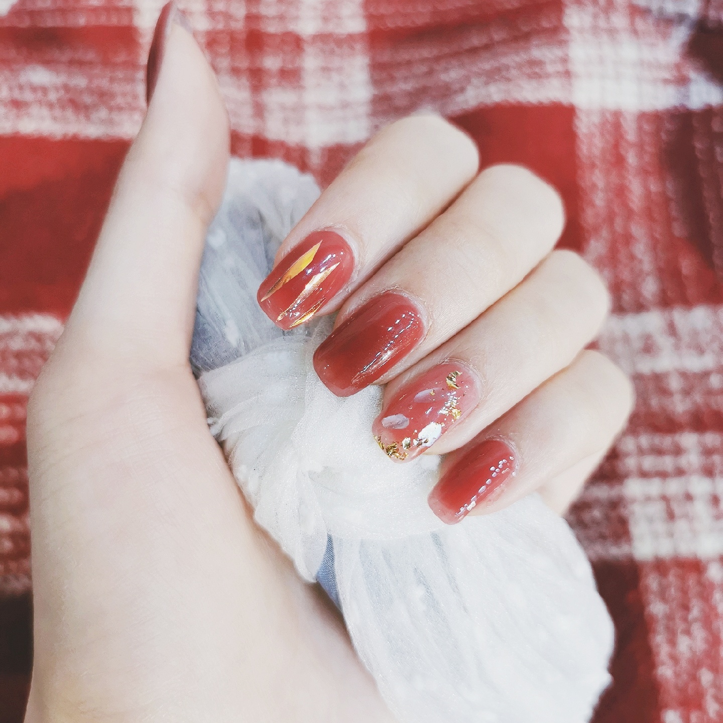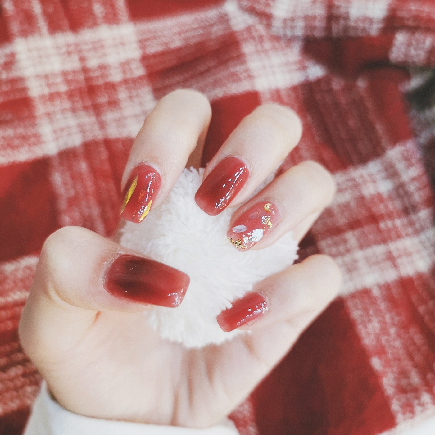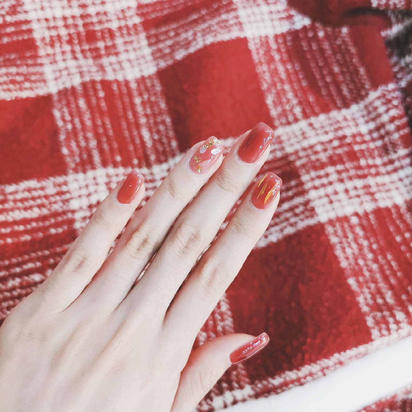准备过年啦~给指甲换了个衣服🤩想着过年做一个红红火火的颜色❤️来年大吉大利🎊这个葡萄色,红棕里面带一点紫调🍇手残拍不出来😂实物真的巨好看😍非常显白,很温柔的一个颜色💃透明度比较高,看上去颜色不会很实💁比较有水润光泽感💫食指上面加了一些玻璃纸,无名指是贝壳片加金箔✨其他都是单色😗简约中不失精致的感觉,红金配色又有点年味💝