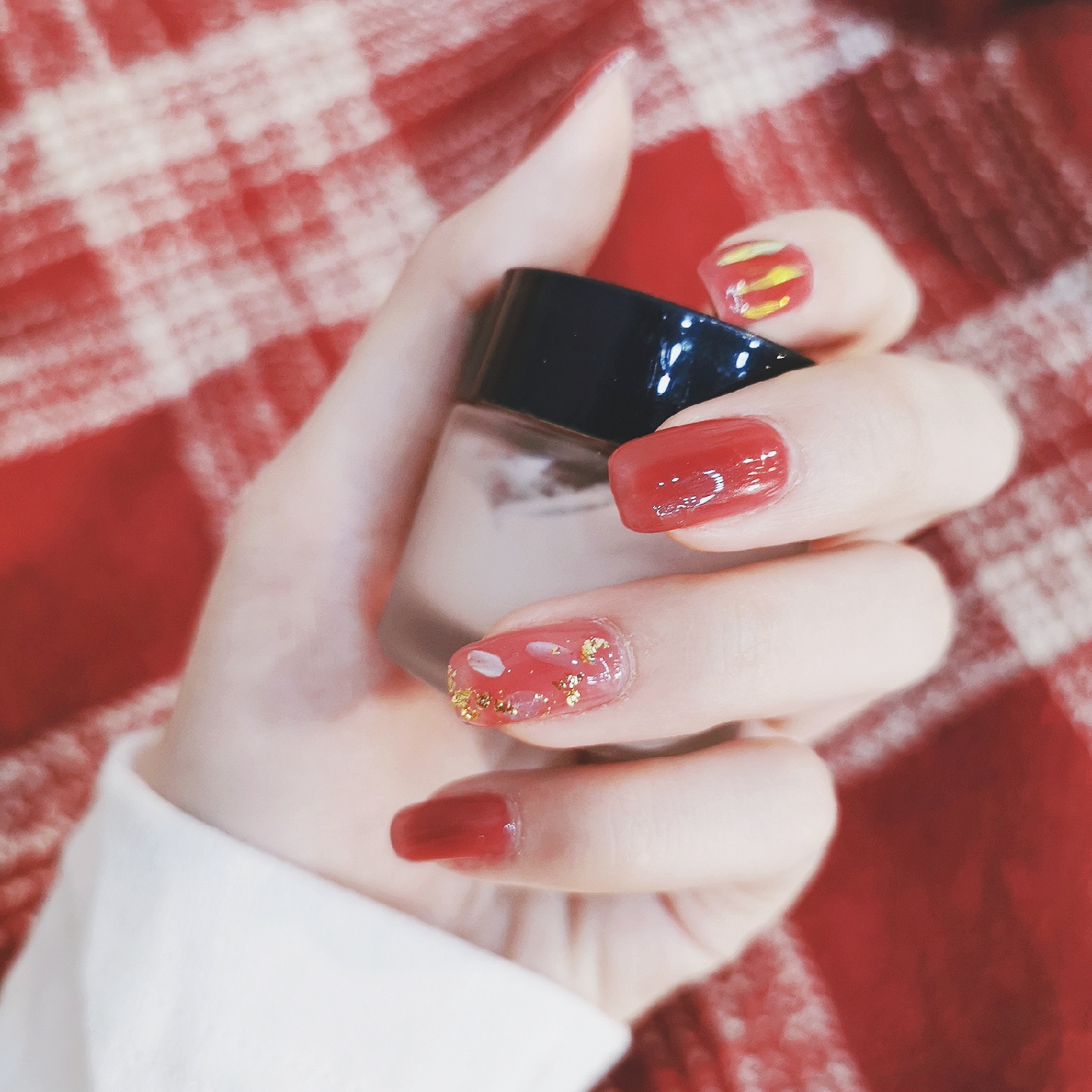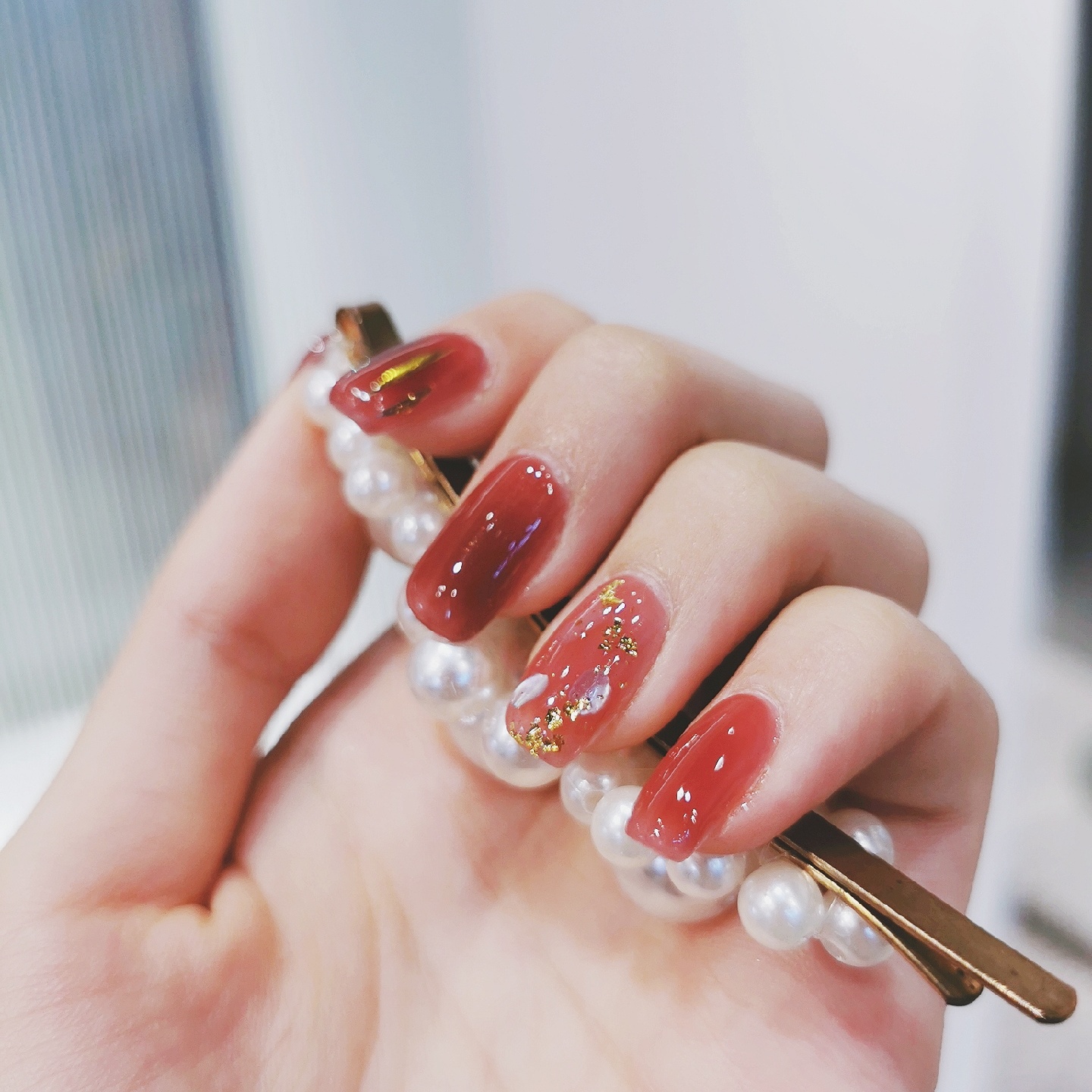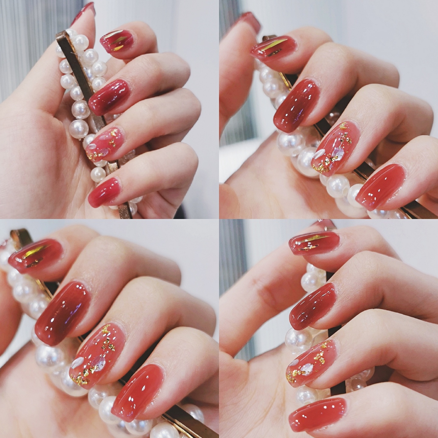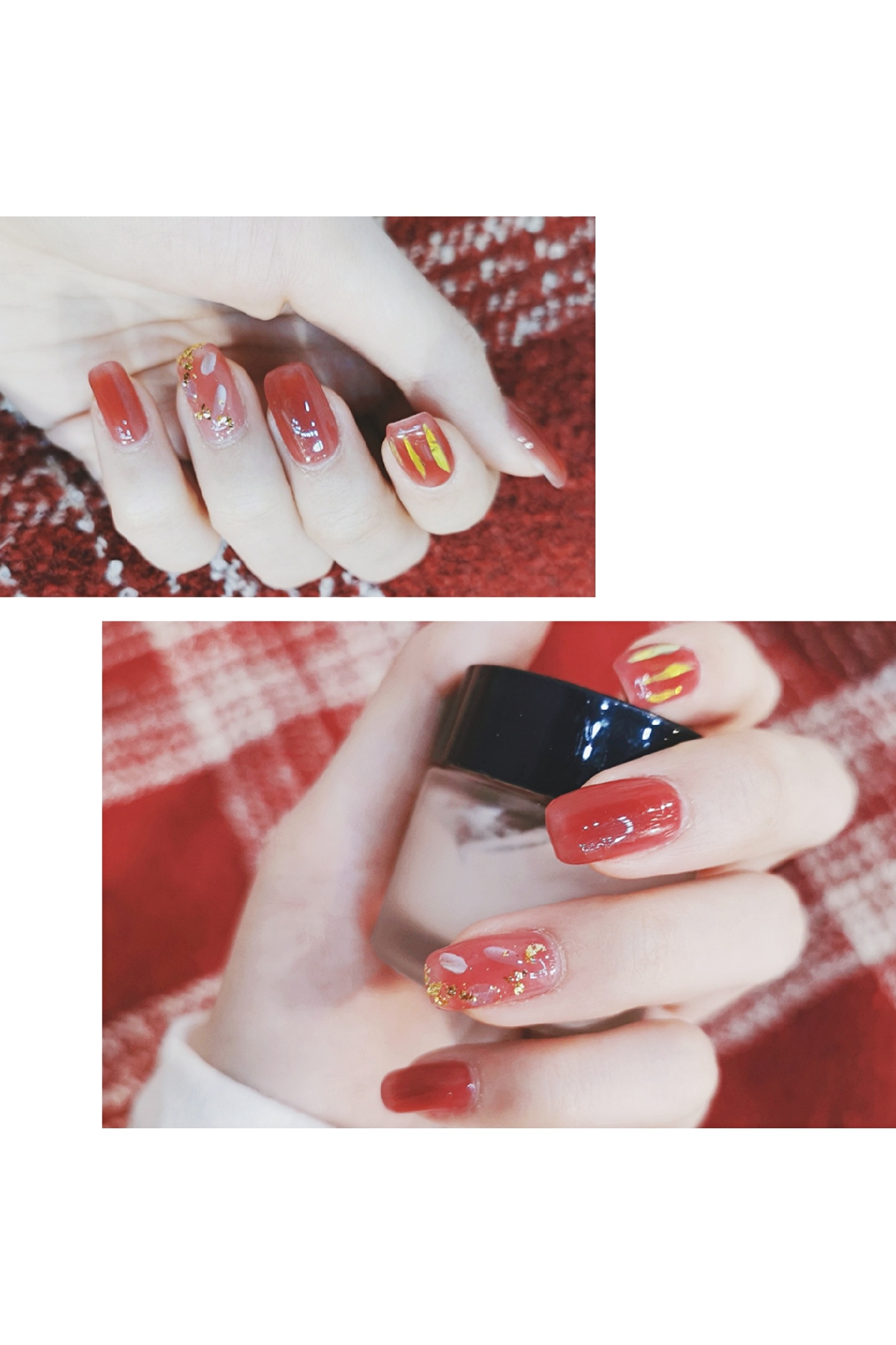 准备过年啦~给指甲换了个衣服🤩想着过年做一个红红火火的颜色❤️来年大吉大利🎊这个葡萄色,红棕里面带一点紫调🍇手残拍不出来😂实物真的巨好看😍非常显白,很温柔的一个颜色💃透明度比较高,看上去颜色不会很实💁比较有水润光泽感💫食指上面加了一些玻璃纸,无名指是贝壳片加金箔✨其他都是单色😗简约中不失精致的感觉,红金配色又有点年味💝