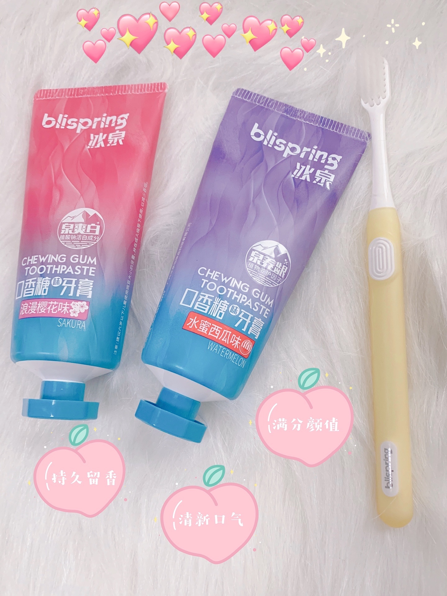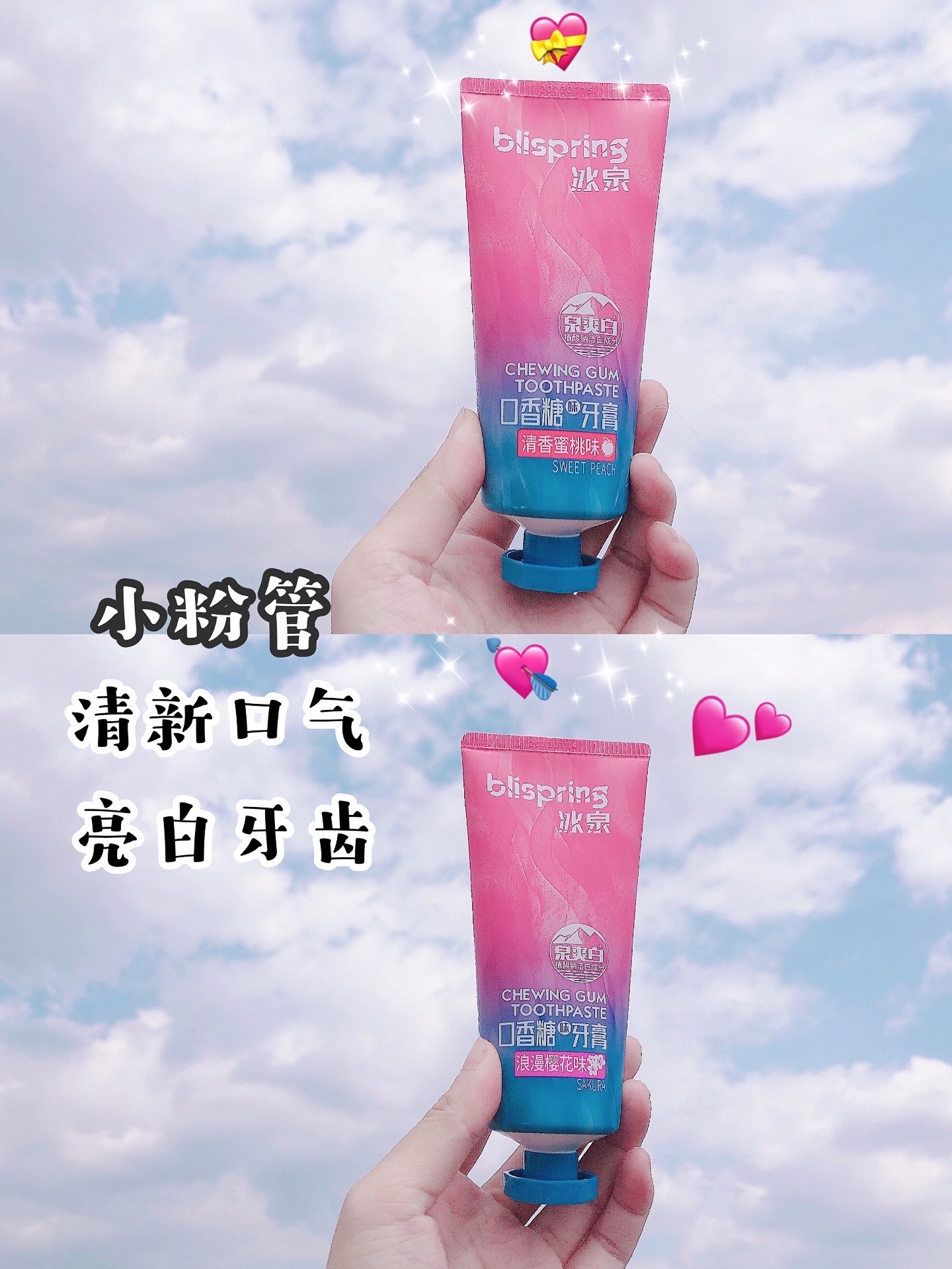 🍑小粉管 清香蜜桃味,这是我最喜欢的一款哦,不管是味道还是颜值都很爱,刷完牙之后满口都是蜜桃的清甜味道,😇真的就是人间水蜜桃啦!浪漫樱花味,淡淡的樱花味道,有春天的气息哦~用起来很温和!满满的樱花香味。这两款里面都有亮白因子,可以让牙齿变白,减少牙渍。用完之后牙齿肉眼可见的比之前白净许多。