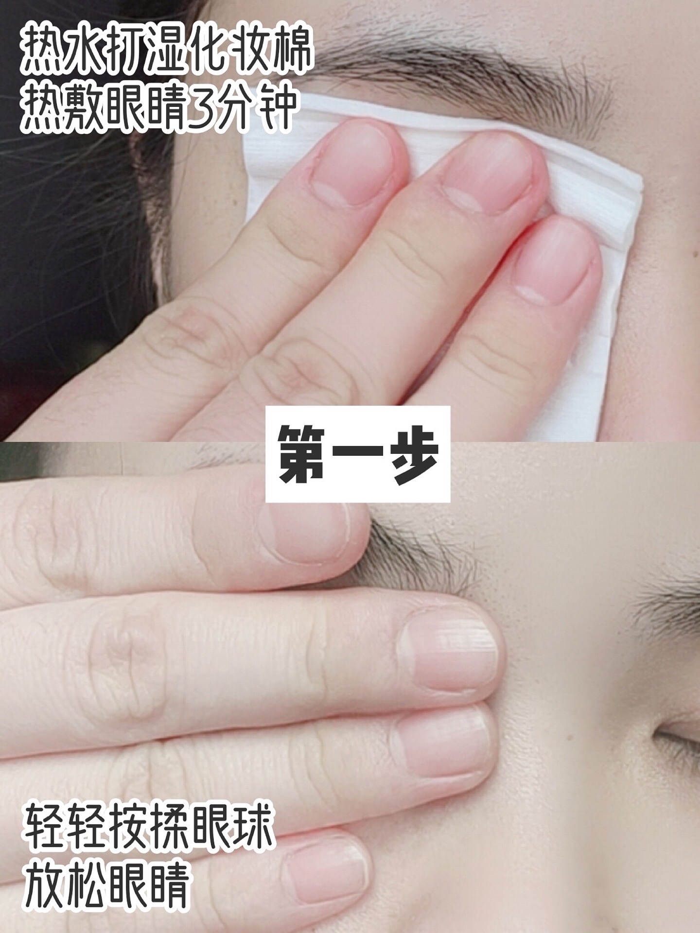 捂热双手,化妆棉泡热水热敷下眼睛(也可拿毛巾替代)让眼睛好好休息2-3分钟,期间可以轻轻按揉按揉眼球