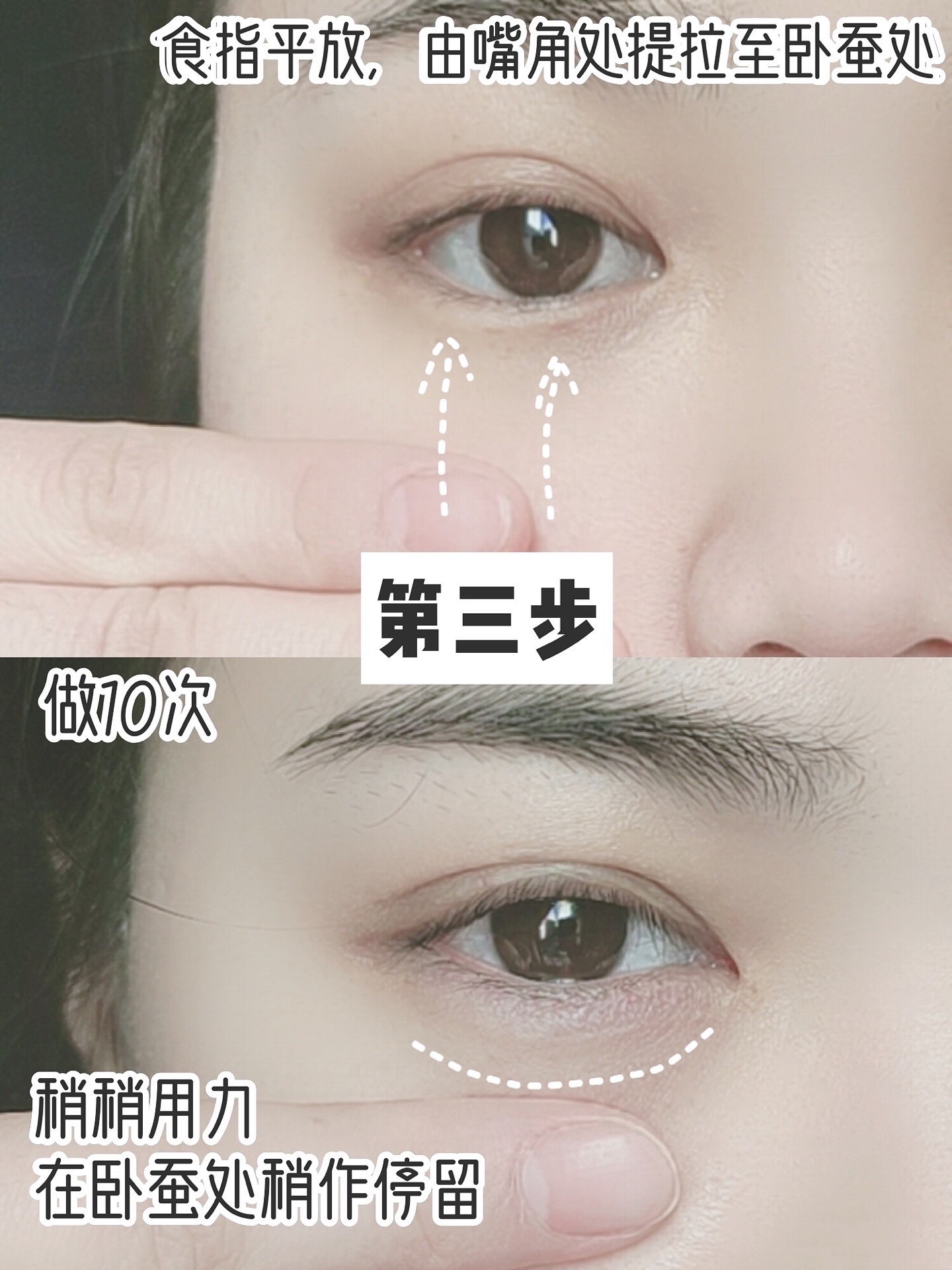 两指平放在鼻梁处,向上推至卧蚕位置,在卧蚕处稍稍停留