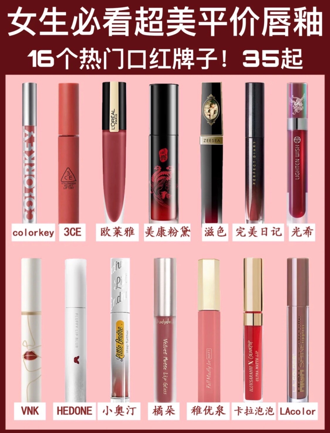 今天和大家分享吃土女生闭眼入平价唇釉!!16个热门口红牌子,可以慢慢看啦😜#平价口红大赏##口红##显白口红#