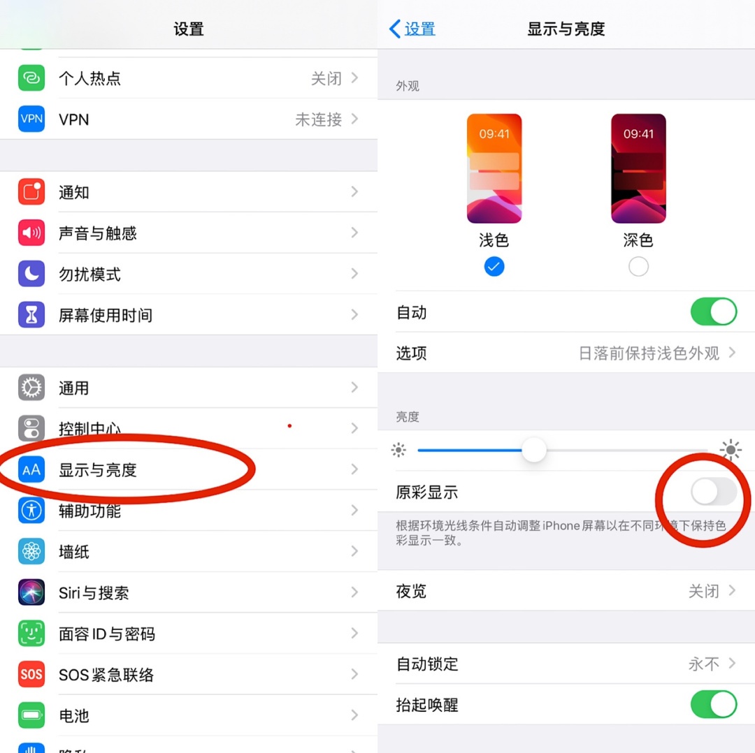 🤳第一步➡️打开设置➡️显示与亮度➡️原彩显示按钮🔘关闭-美图社区-美图秀秀