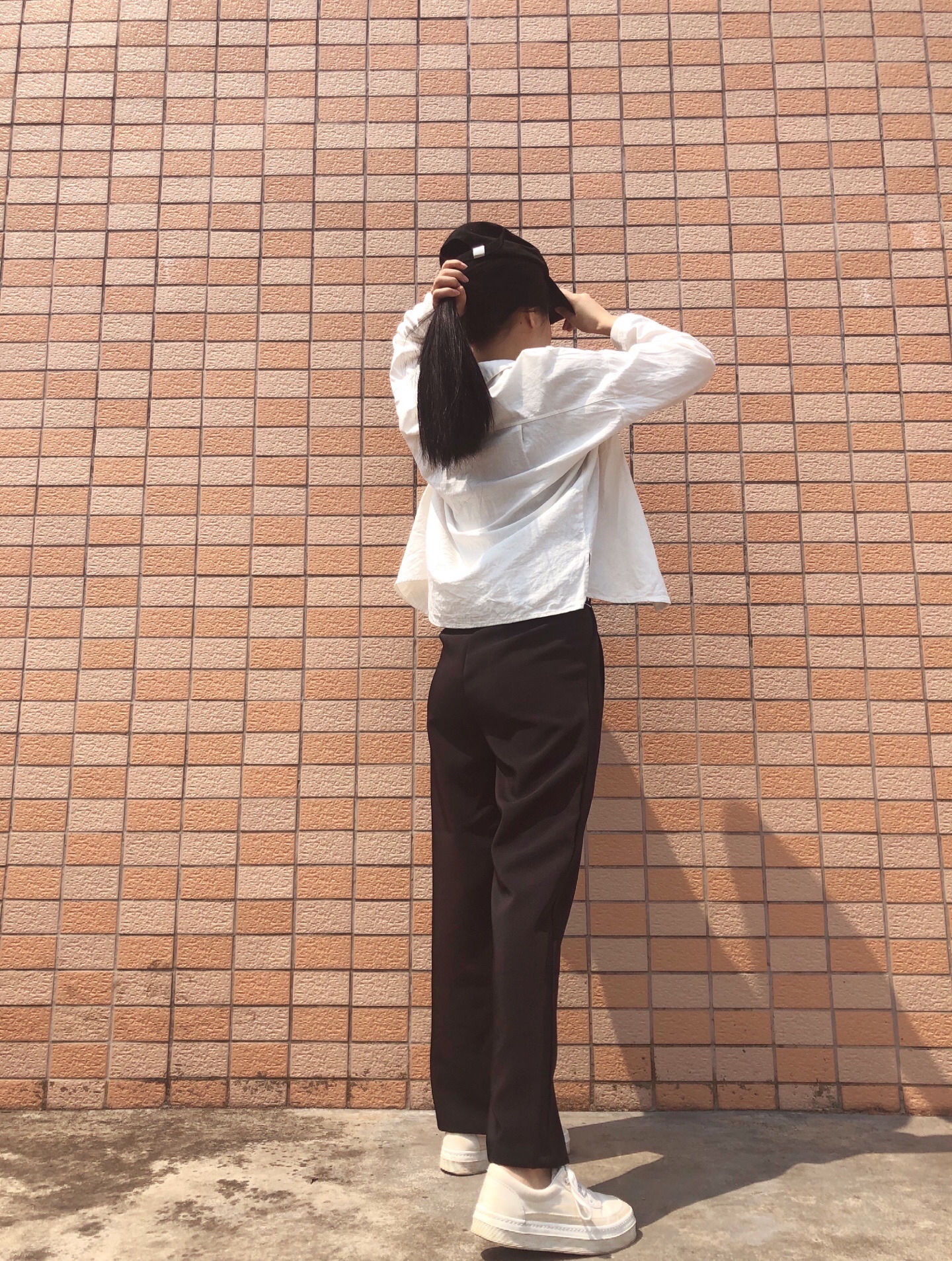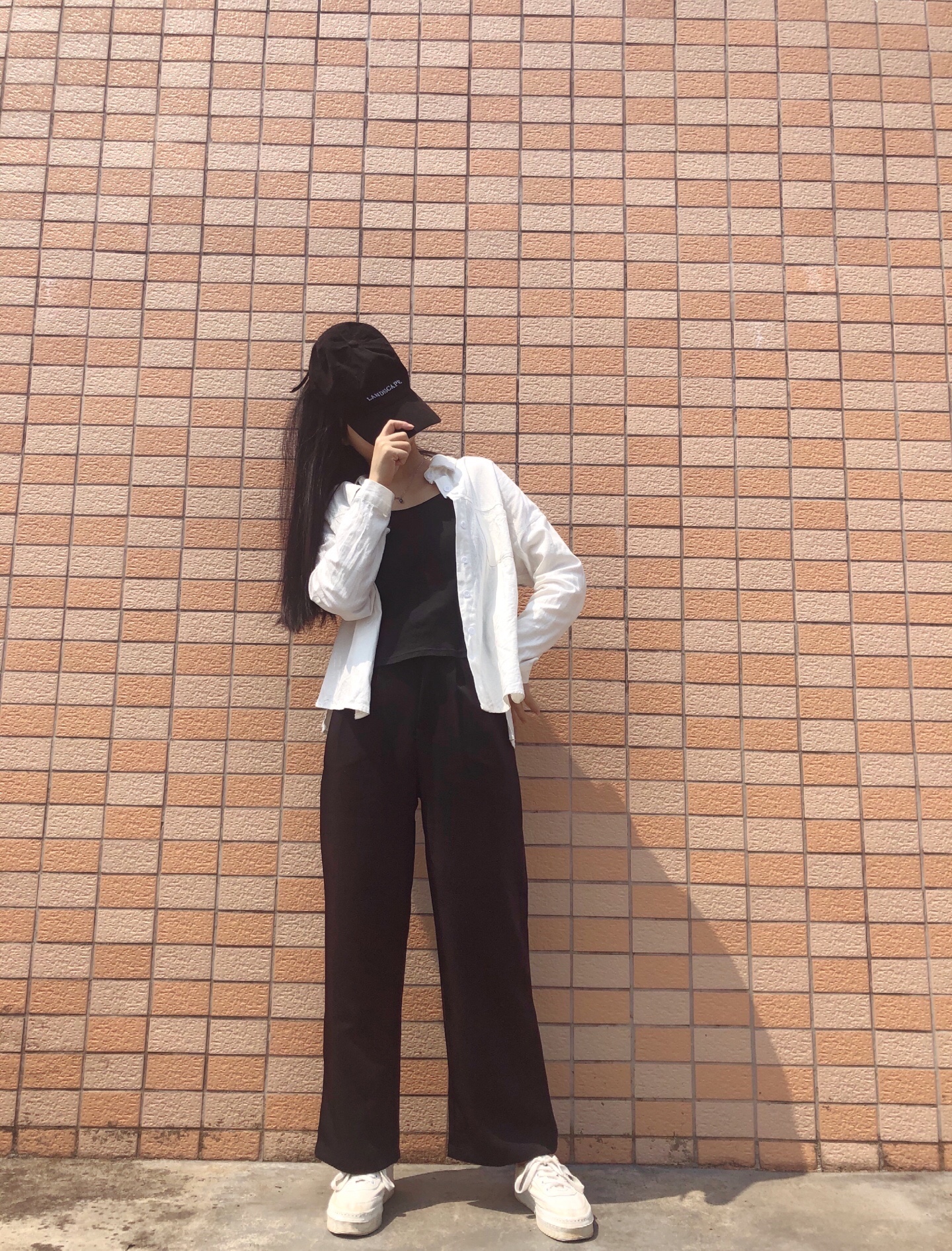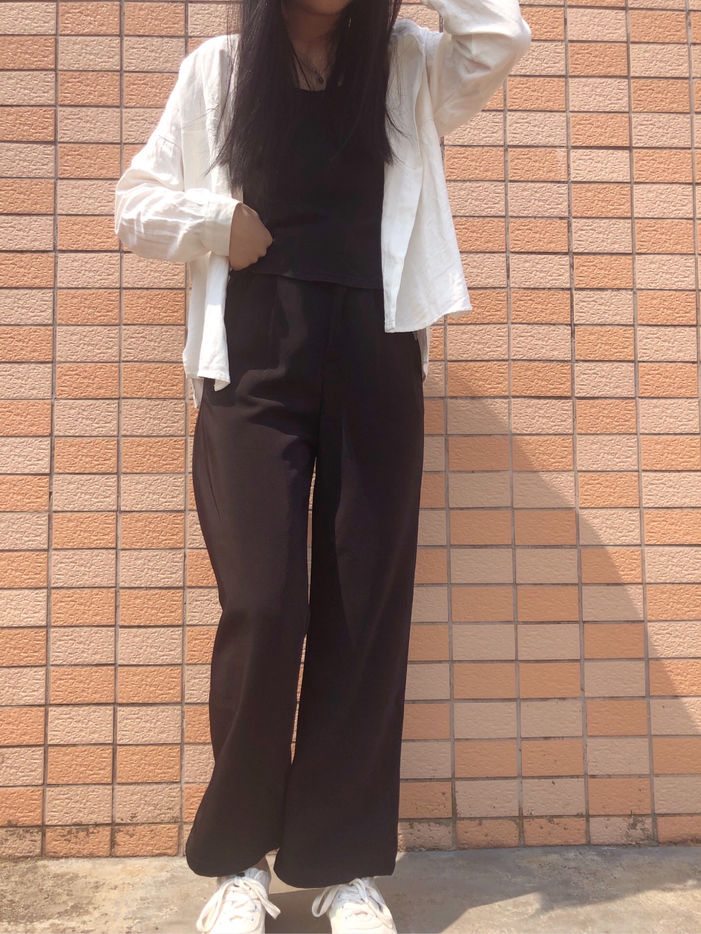 白衬衫➕黑色吊带配西装裤简直不要太酷了,姐妹们一起拍照叭😝#宅家拍大片#
