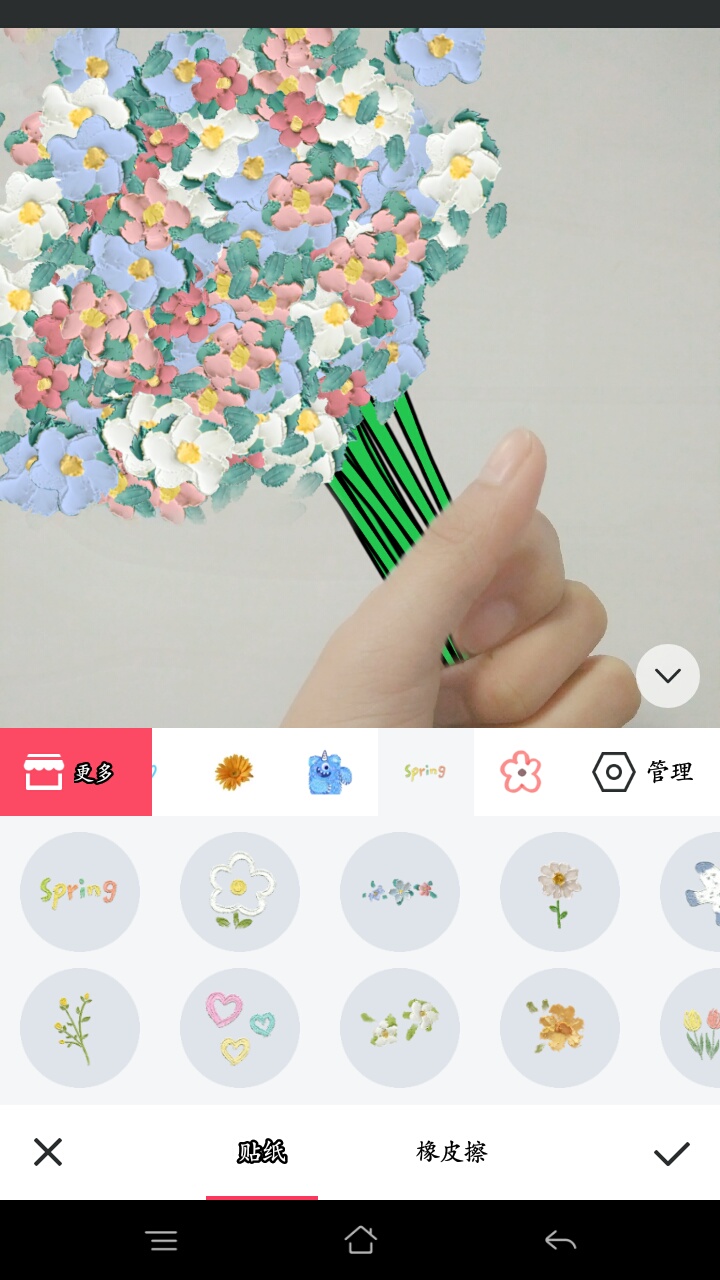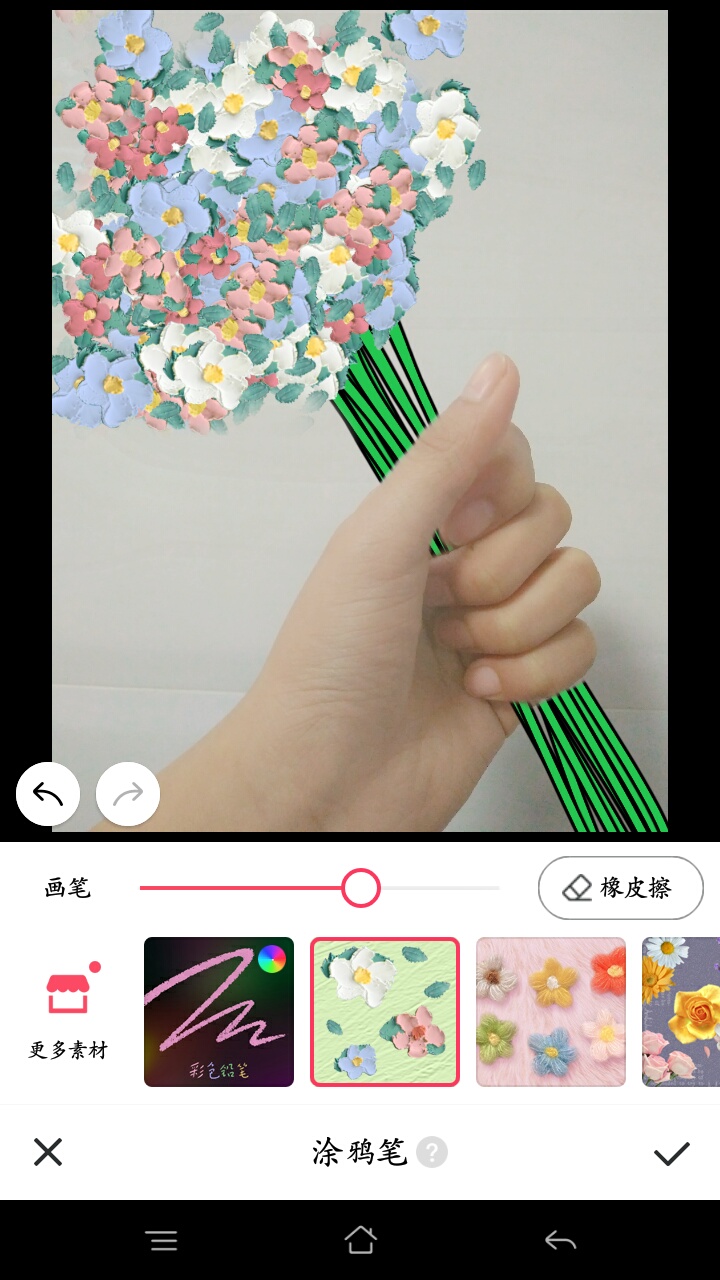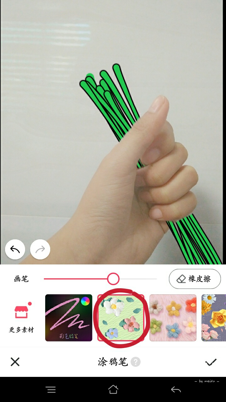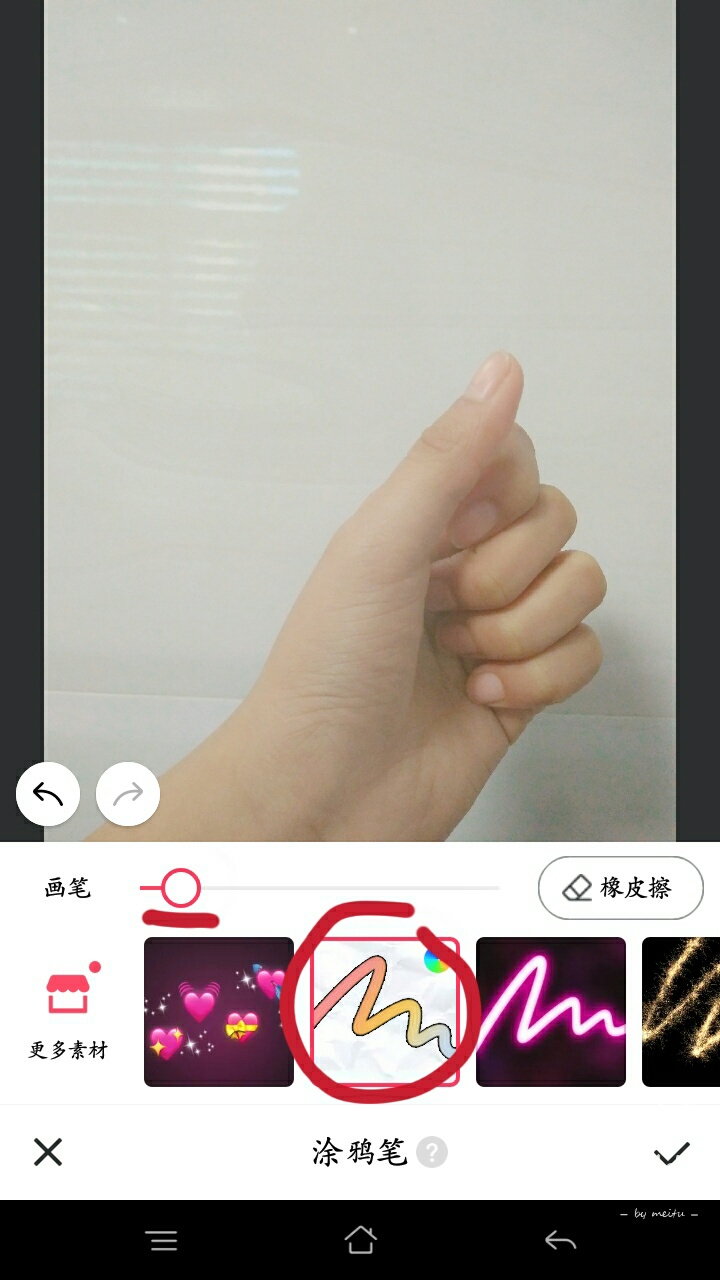 3.打开涂鸦笔,找到图片中的素材在手中的位置画几条竖线。