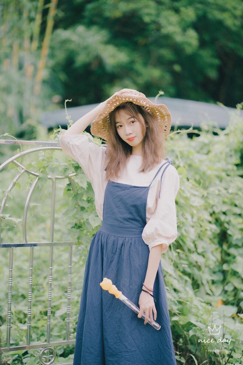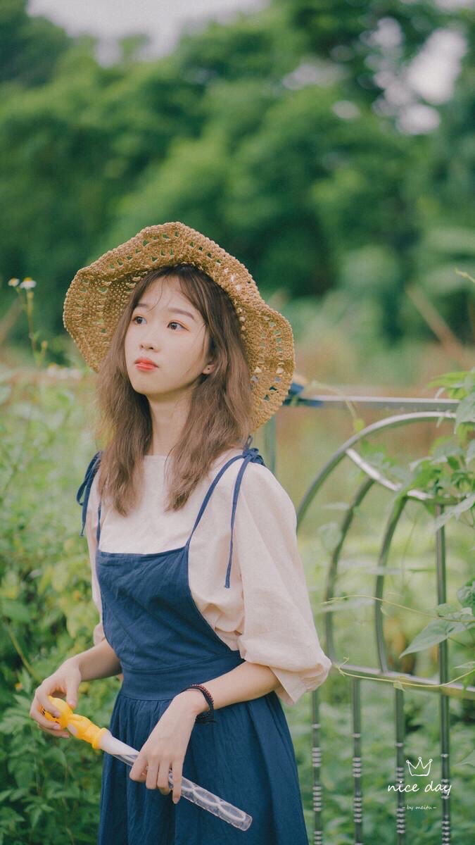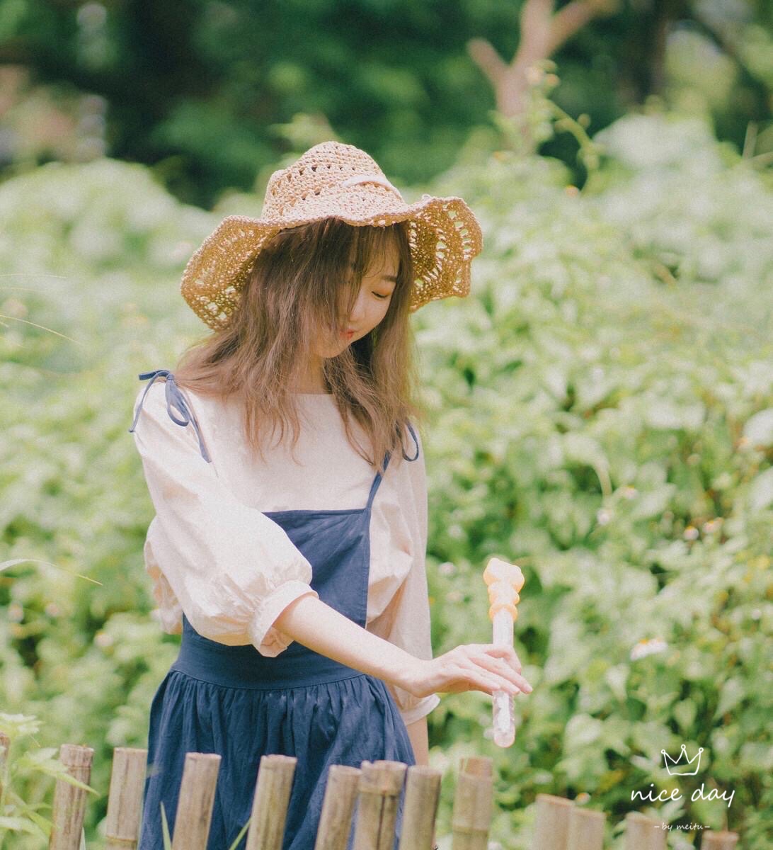 找一个好看的背景站着,上半身稍微向前倾,戴着时尚草帽,把手放在头上,手和头符合三角形法则,害羞微笑看镜头,这个拍照技巧,真的简约美