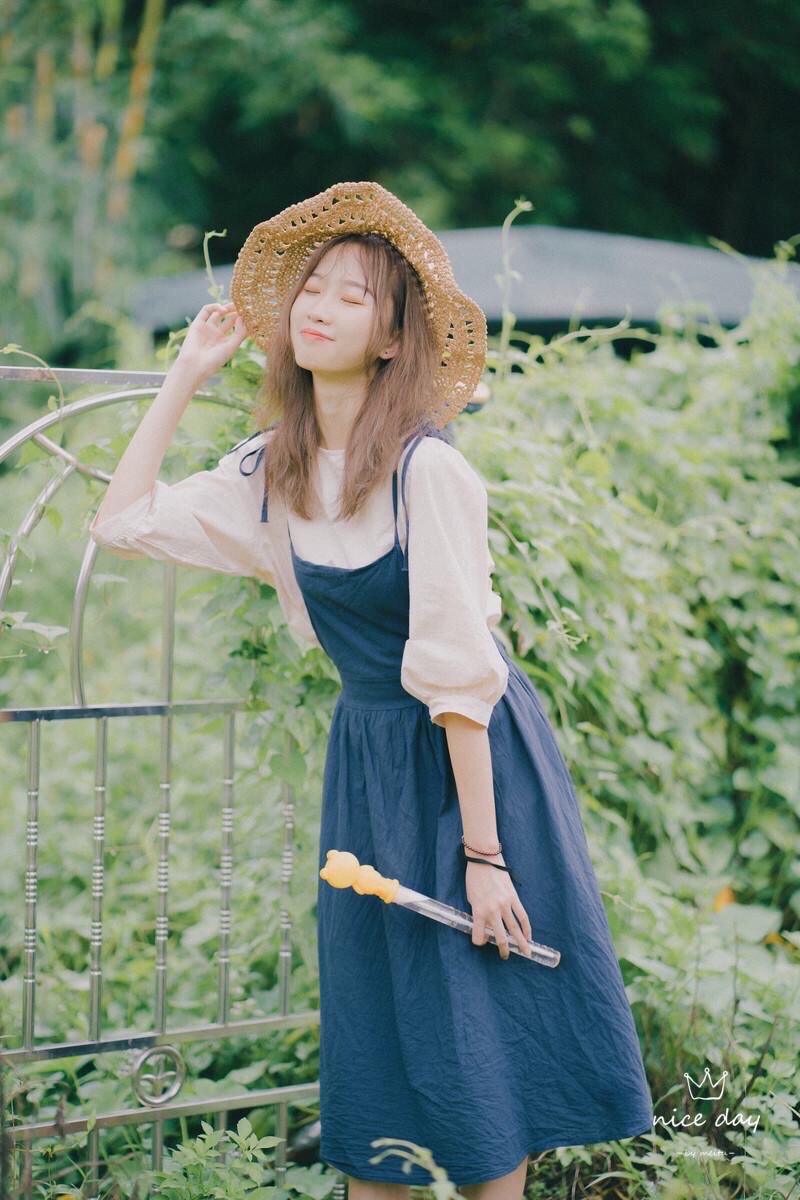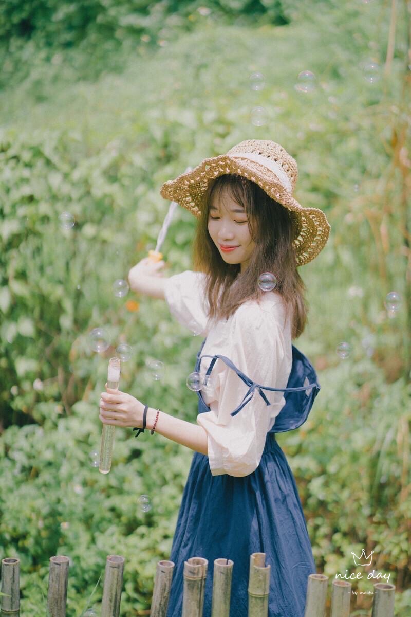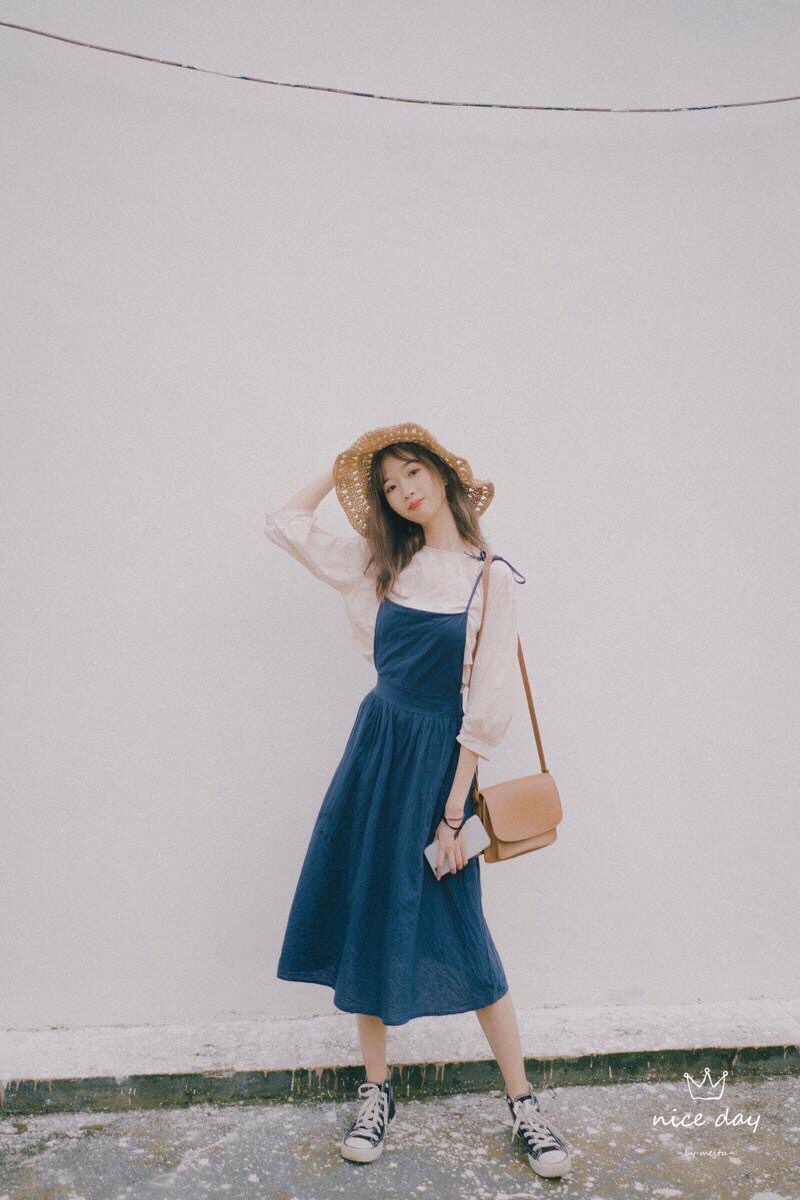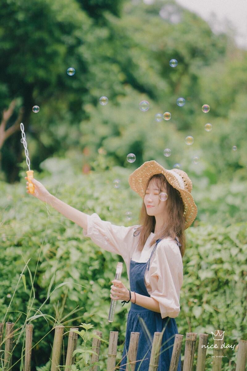 找一个好看的背景站着,上半身稍微向前倾,戴着时尚草帽,把手放在头上,手和头符合三角形法则,害羞微笑看镜头,这个拍照技巧,真的简约美