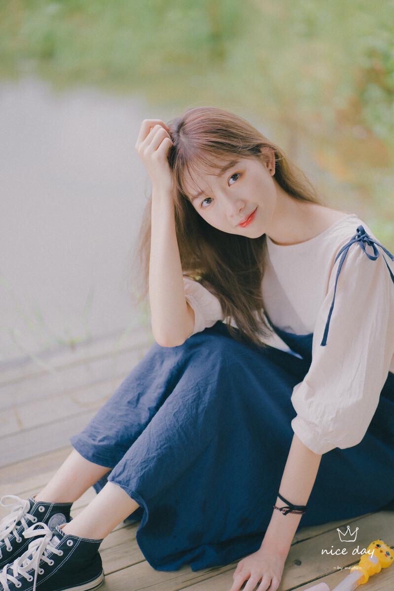 坐在干净地面,侧对着镜头微笑,把头靠在撑起的手,手指撩着头发,这个拍照动作,手、头和脚,也一样符合三角形拍照法则,自然也不做作