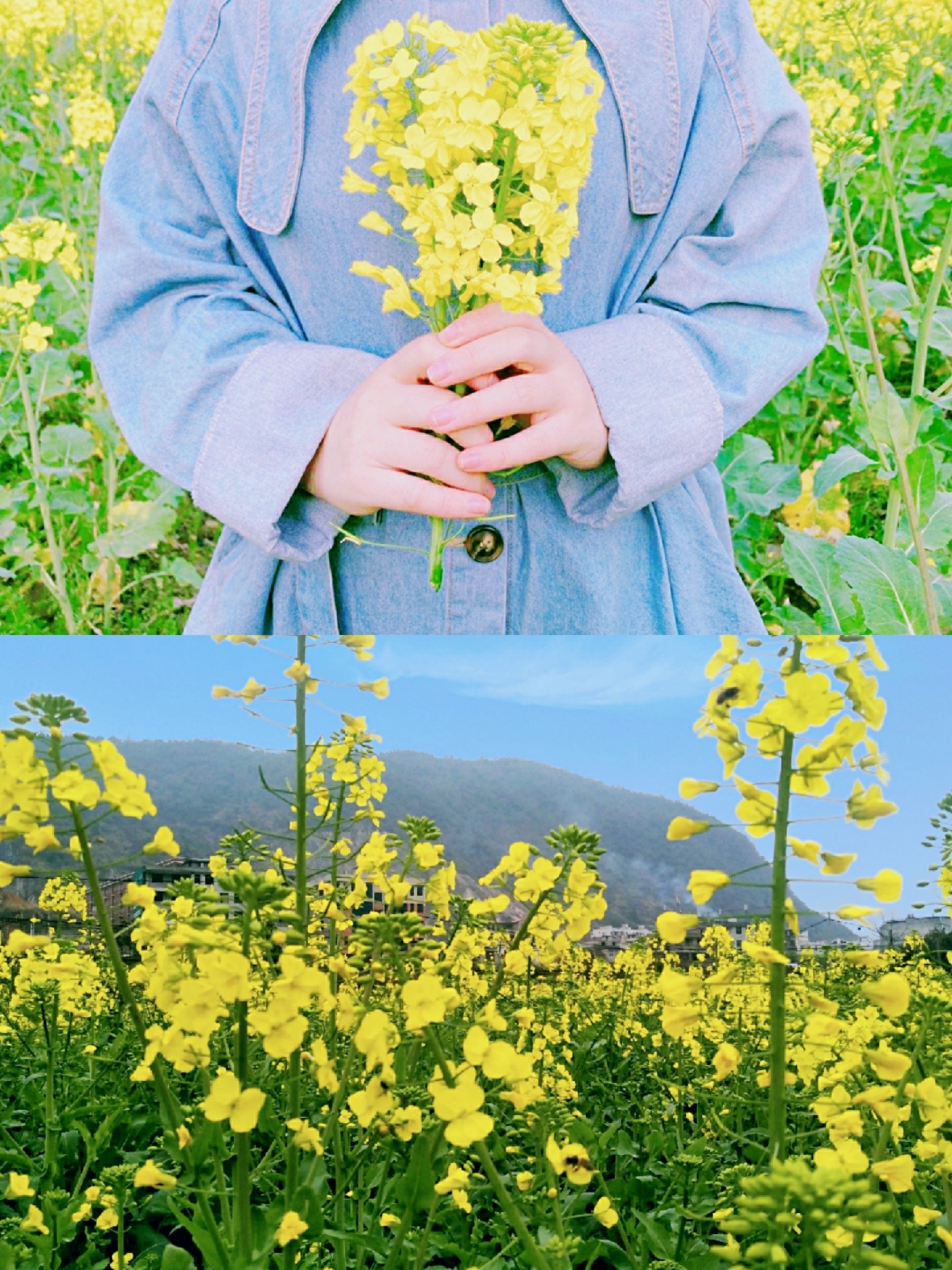 图四:手握鲜花,拍半身,拍花的景从下往上拍。#油菜花# #春色撩人# #用手机拍大片# #拍照姿势# #油菜花拍照#