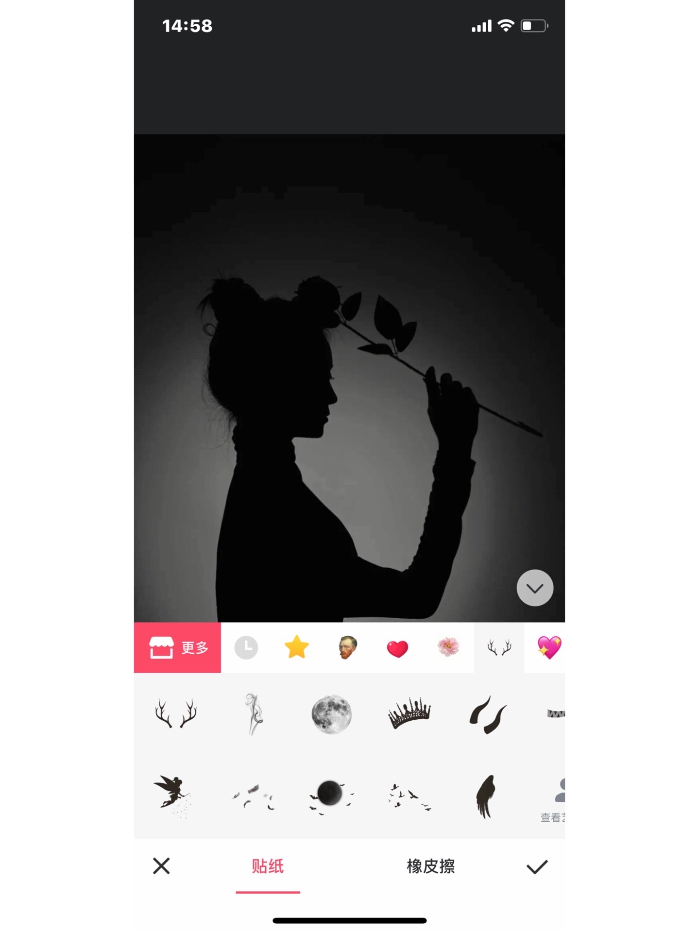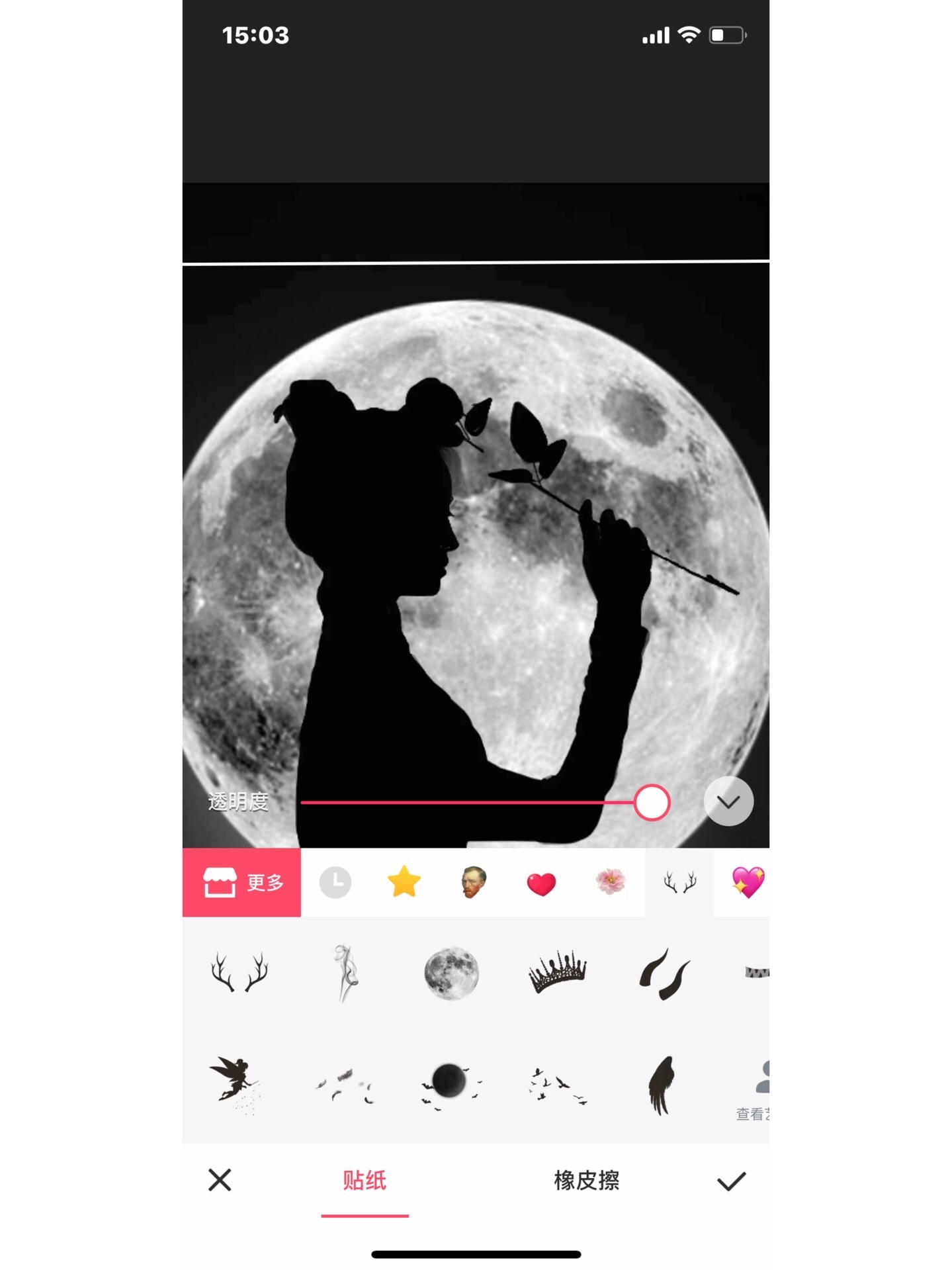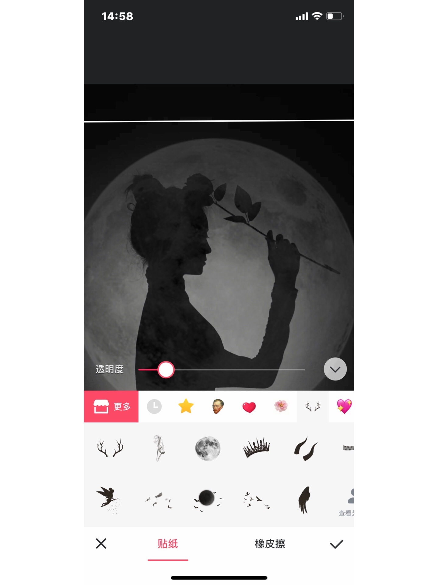 步骤:首先打开美图秀秀的图片美化 然后点击贴纸 打开更多 一直往下翻 翻的时候仔细一点 找到恶魔缠身一系列贴纸 打开试用 找到月亮 先把透明度拉低 然后用橡皮擦把人物抠出来 再把透明度拉回去 就差不多可以啦