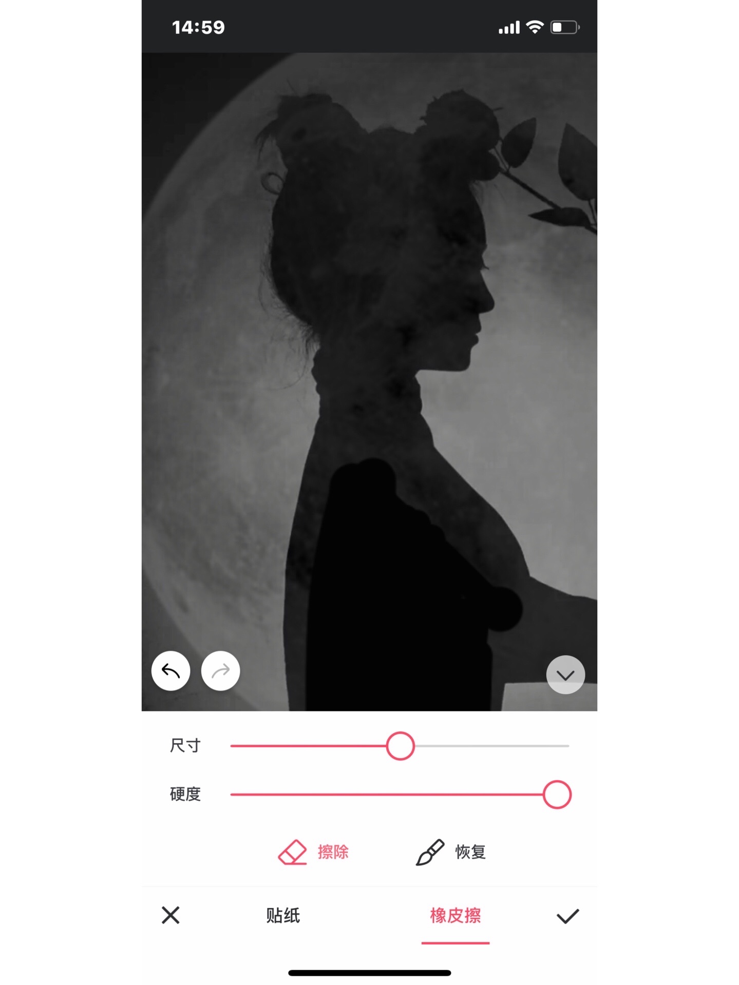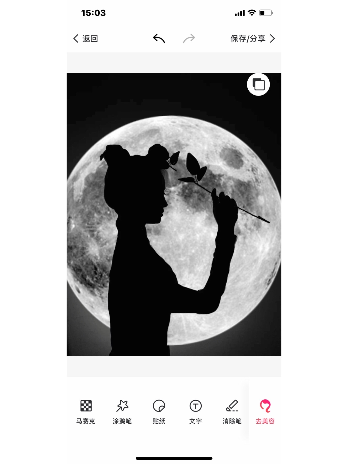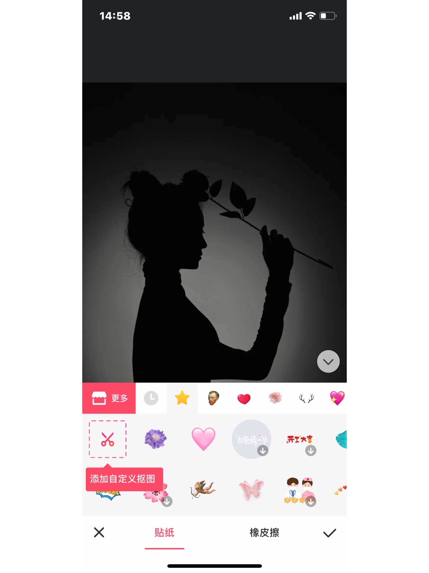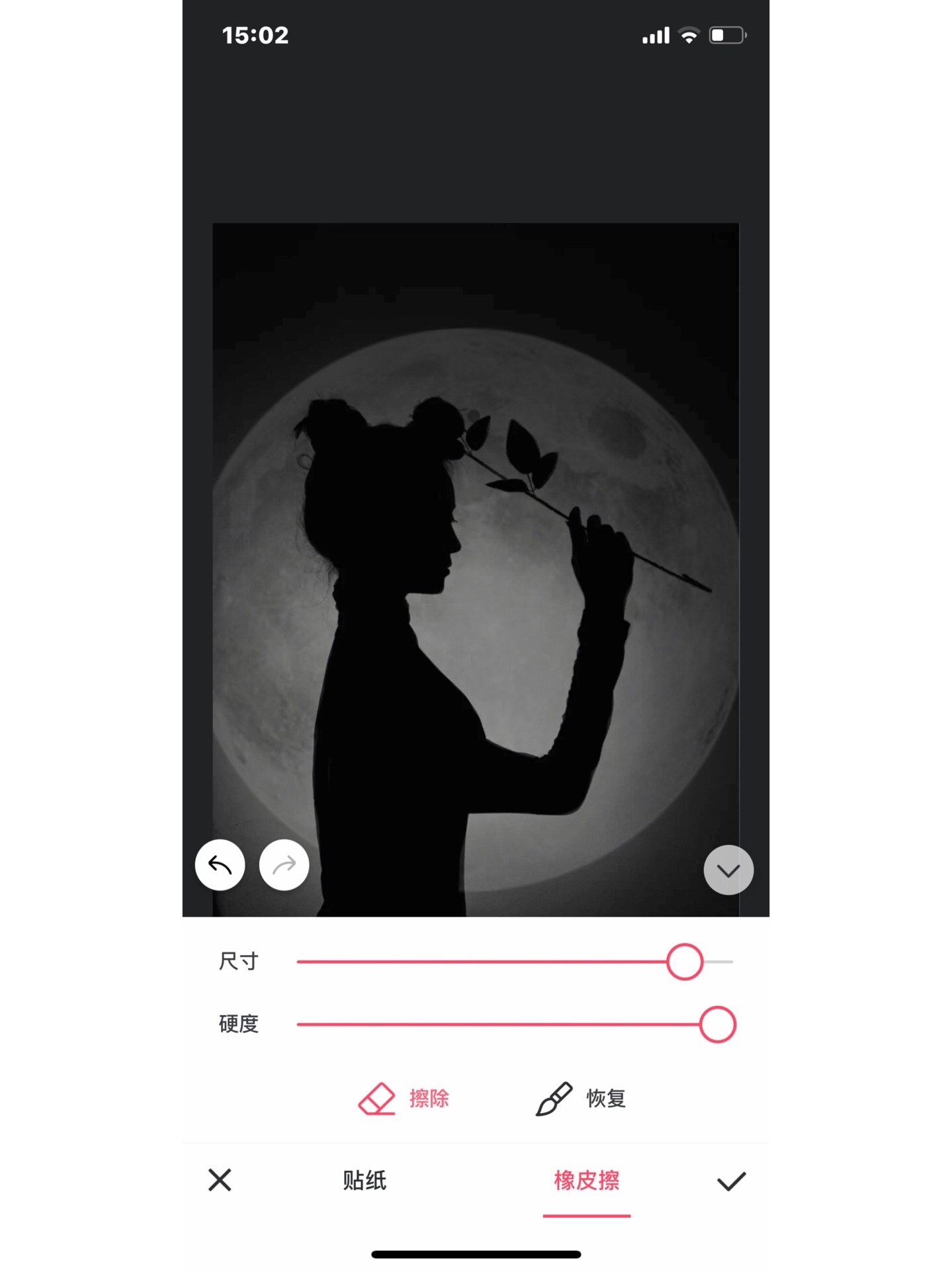 步骤:首先打开美图秀秀的图片美化 然后点击贴纸 打开更多 一直往下翻 翻的时候仔细一点 找到恶魔缠身一系列贴纸 打开试用 找到月亮 先把透明度拉低 然后用橡皮擦把人物抠出来 再把透明度拉回去 就差不多可以啦