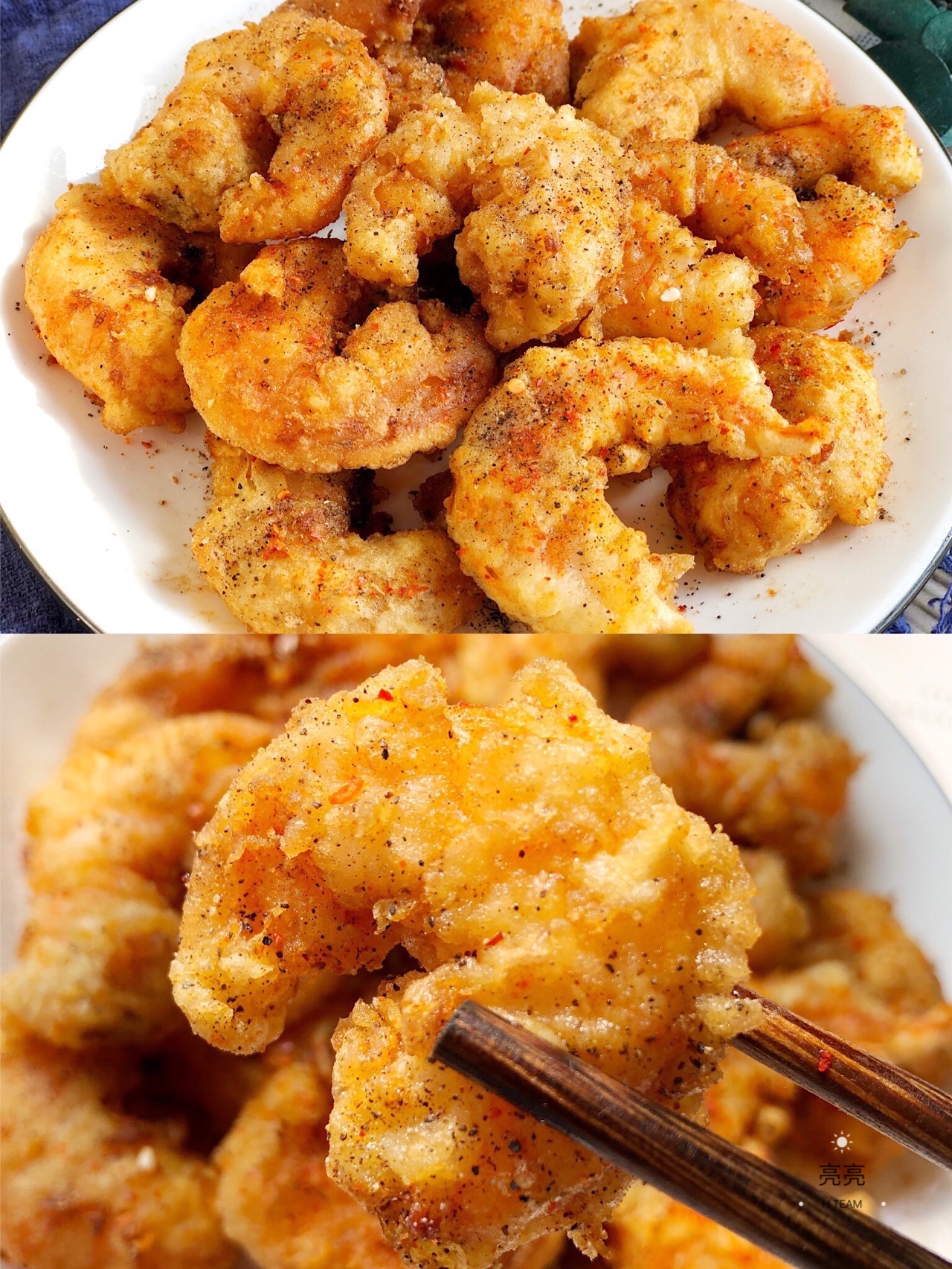 2⃣️适量淀粉加入一个蛋液搅拌成浓稠状,虾仁裹上面粉,锅内油温8成热加入虾仁炸至金黄色捞出,复炸一次更好吃哦!炸好的虾仁撒上椒盐、辣椒粉就可以开吃啦!绝对又是追剧小零食哦