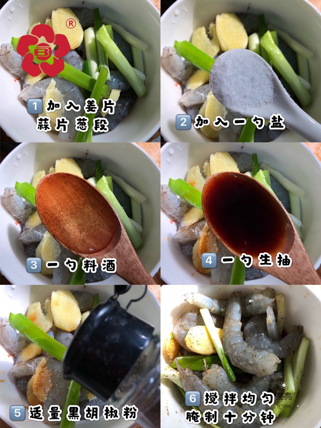 1⃣️虾仁加入姜葱蒜➕一小勺盐➕一勺生抽➕一勺料酒➕适量黑胡椒粉抓拌均匀腌制10分钟。