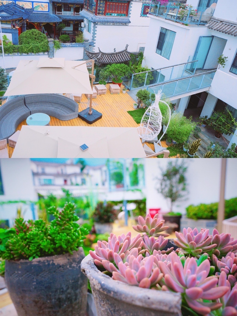 酒店的布局很巧妙,高低穿梭,一扇门,一个拐角,就是另外一处美妙的空间。一楼的院子随处栽满了多肉,有各式休闲椅,还有可以日光浴的躺椅,沐浴在古城慵懒的阳光下一定很惬意。二楼同样有精致的院子和观景平台,视野超棒,远处苍山雄壮的身影一览无余。