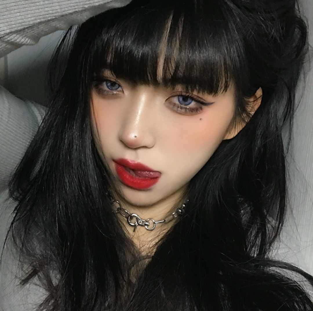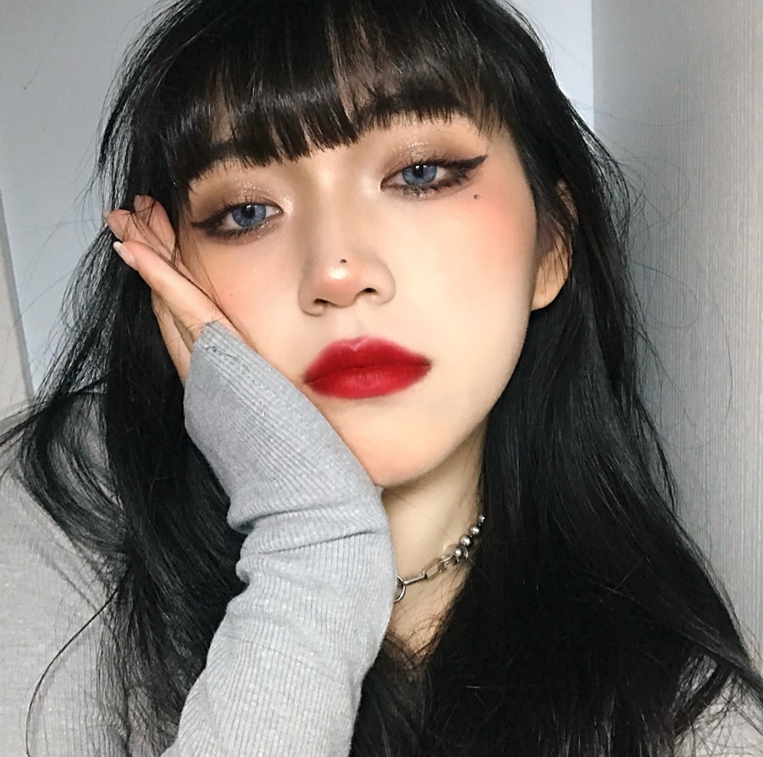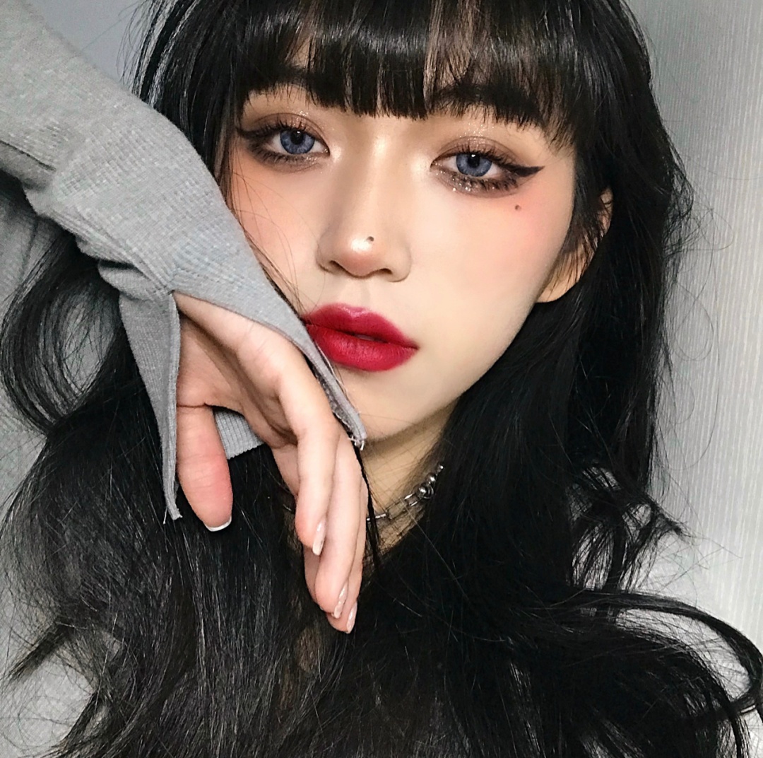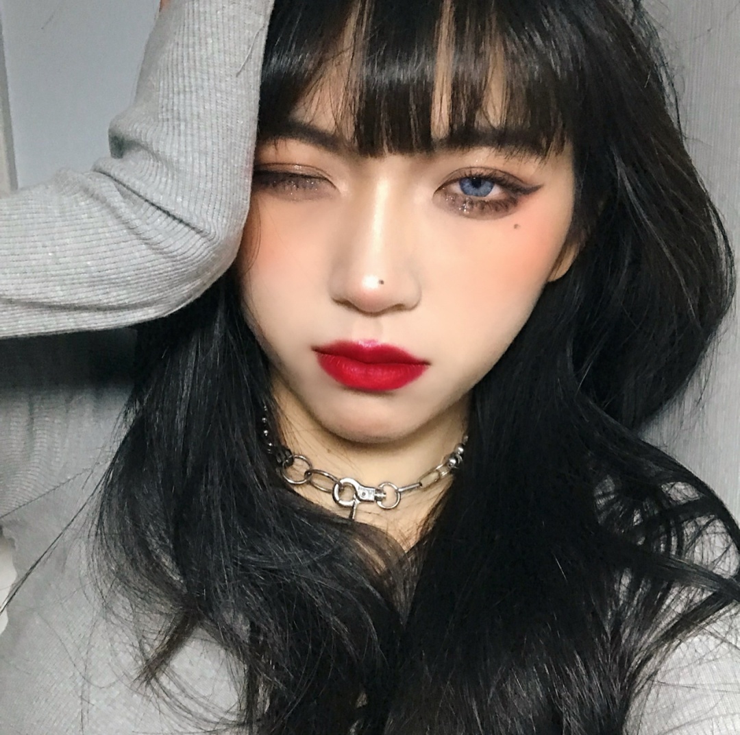 眼妆是暗黑系的颜色啦 还是以灰黑调 眼线就比较浓一些 还有下睫毛是画的