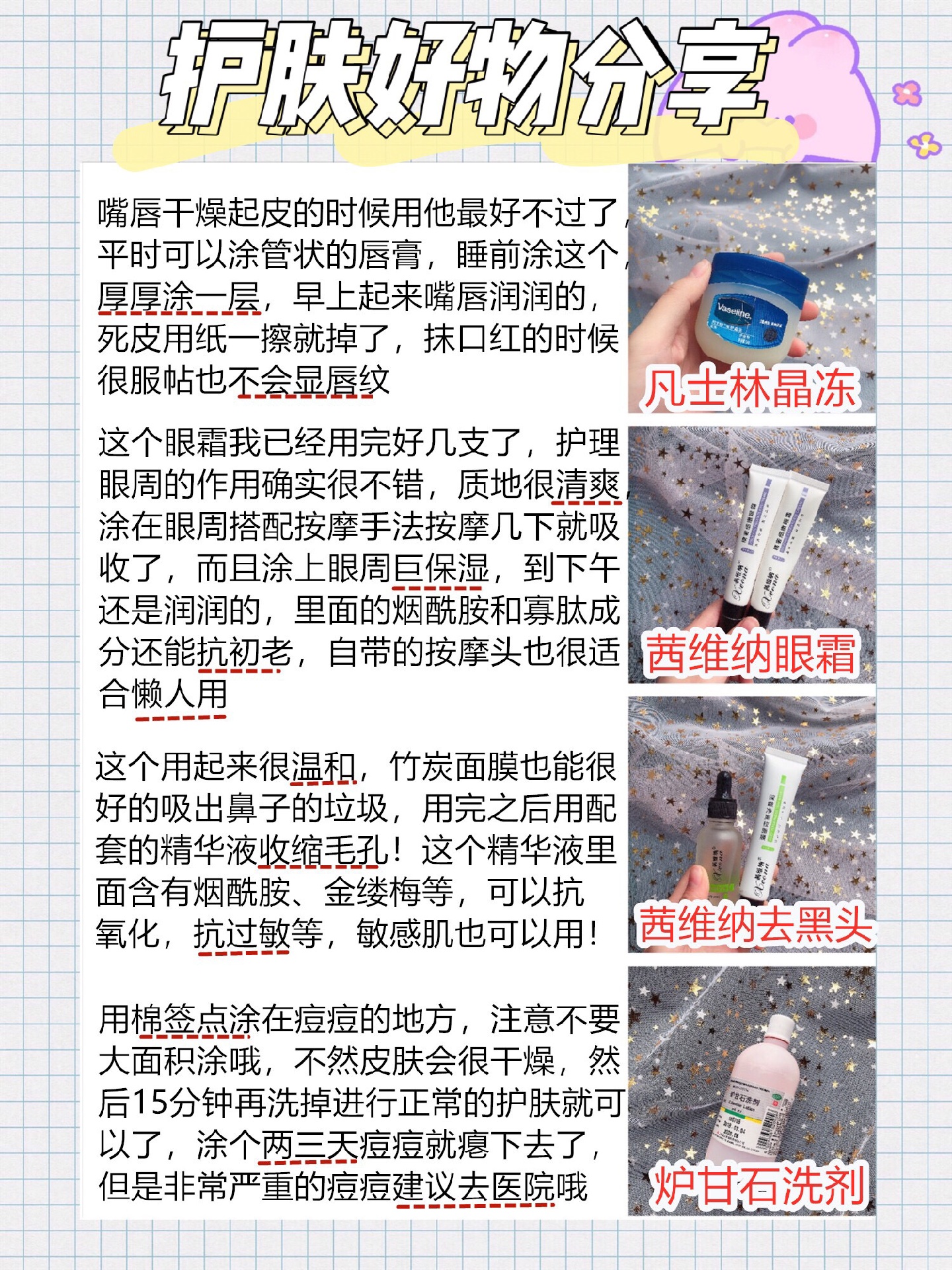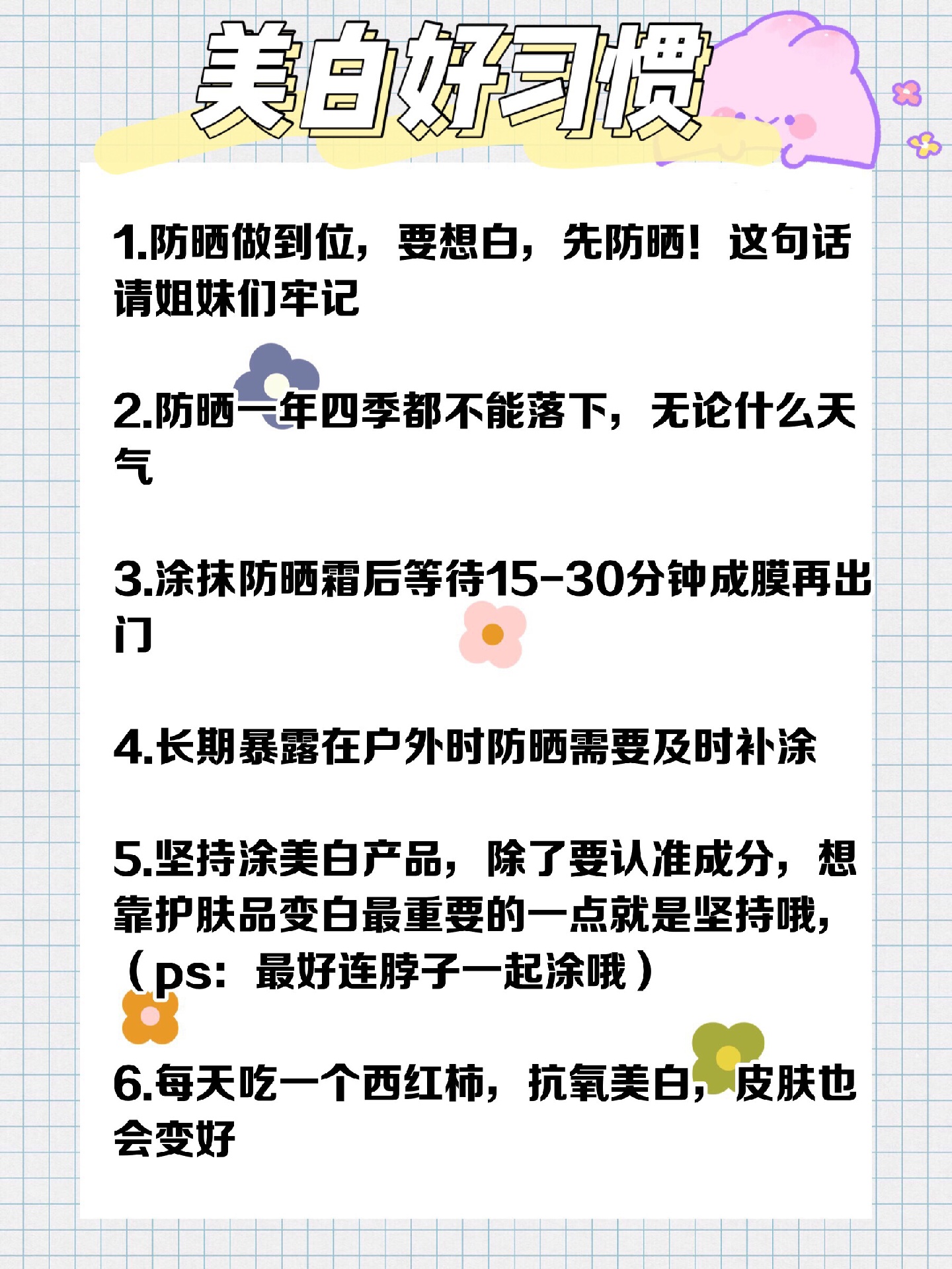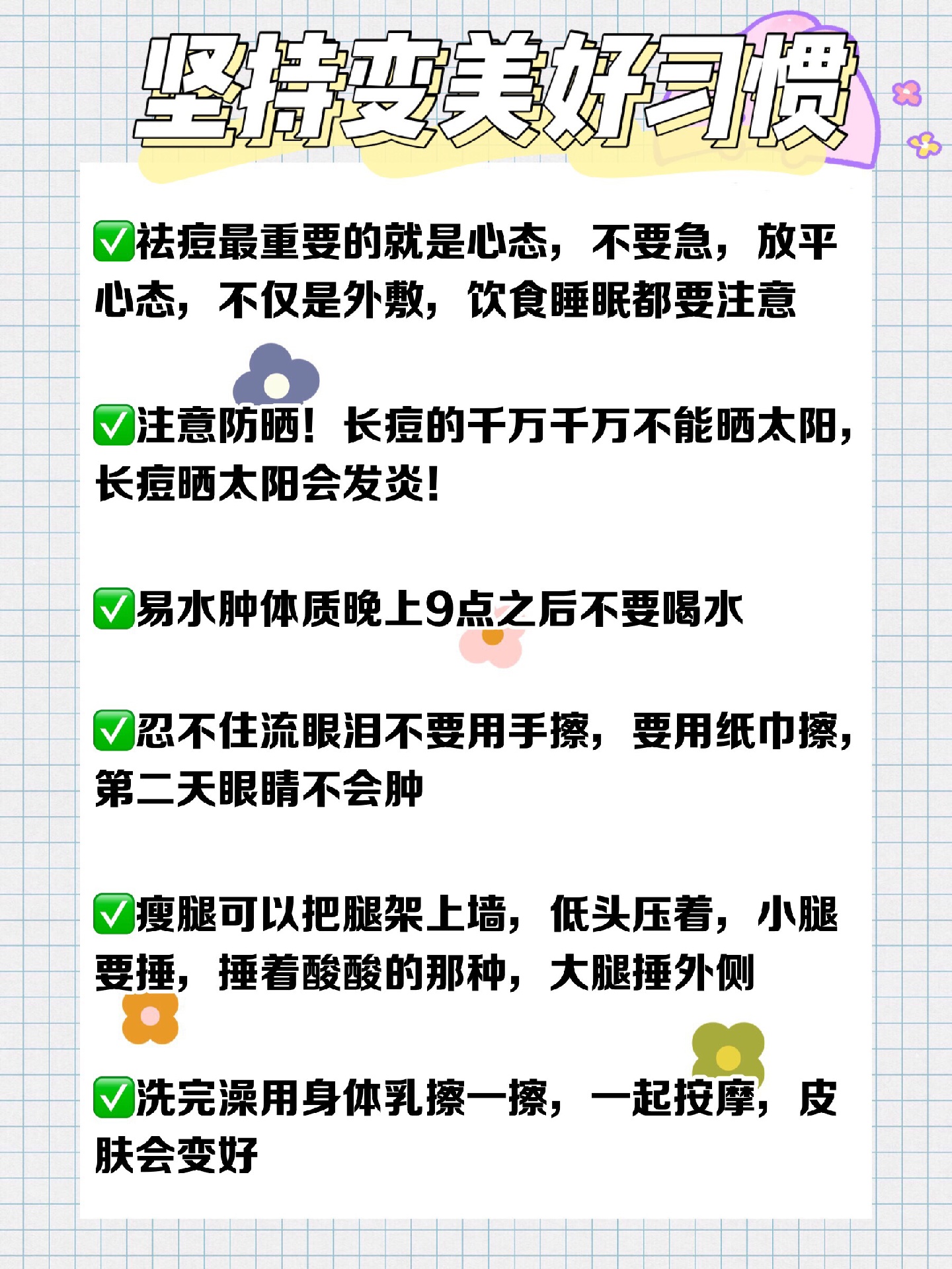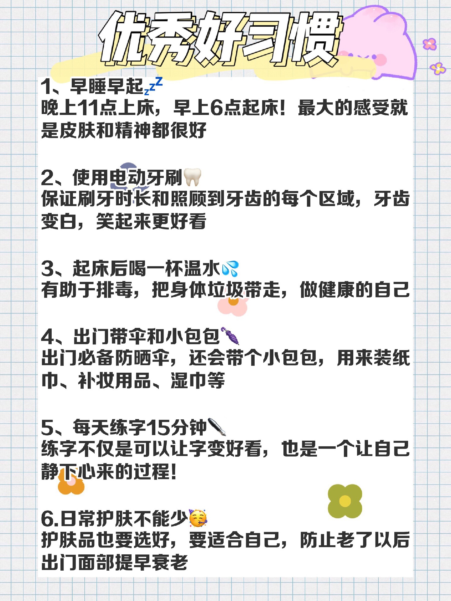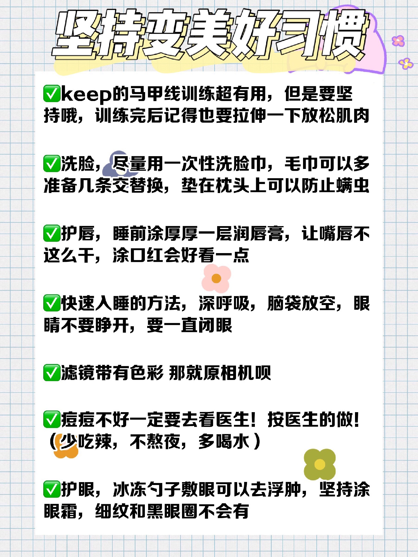 除了作息,饮食也不要吃的太重口味,基础的护肤也要需要的,今天整理了一些小细节,希望宝贝们可以逆袭美少女哦😘