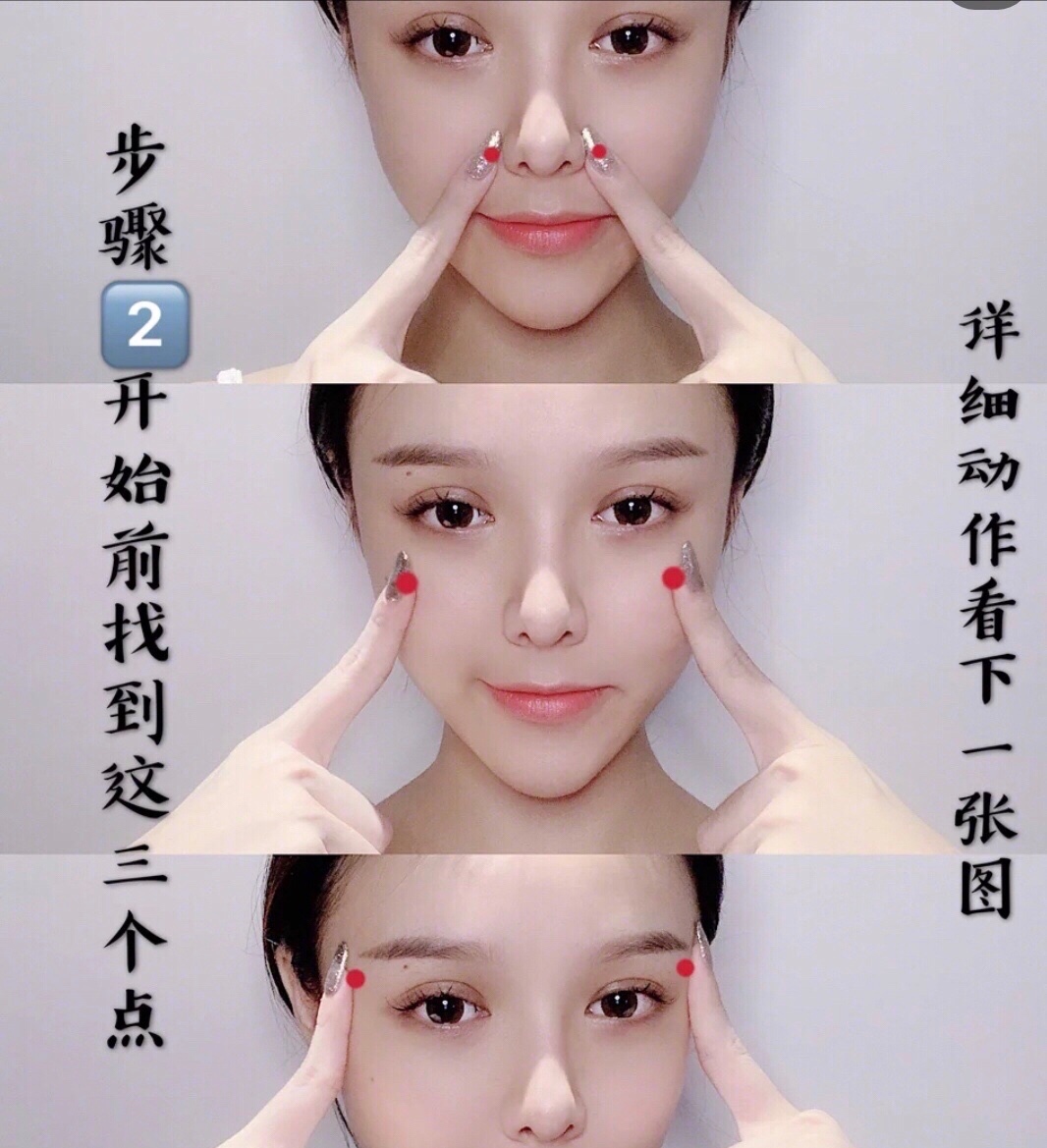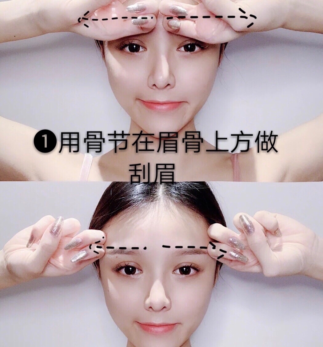 1⃣️用中指和食指的骨节,在眉骨上方做刮的动作。