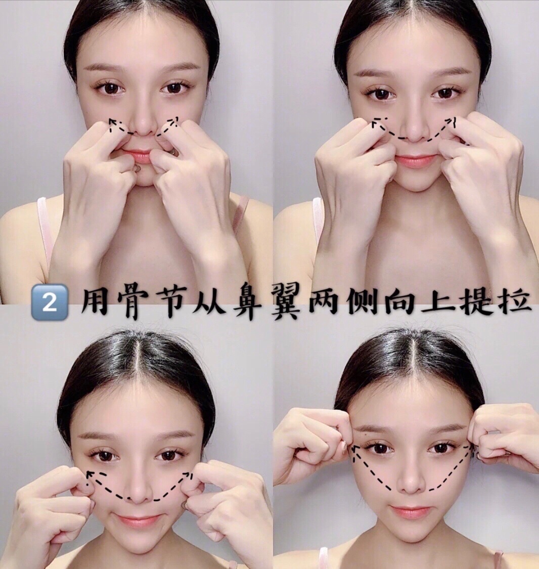 2⃣️同样用中指和食指的骨节沿着鼻翼到颧骨上从鼻翼刮到太阳穴。可以改善颧骨突出,提升面部,对眼部周围也有很好的按摩。