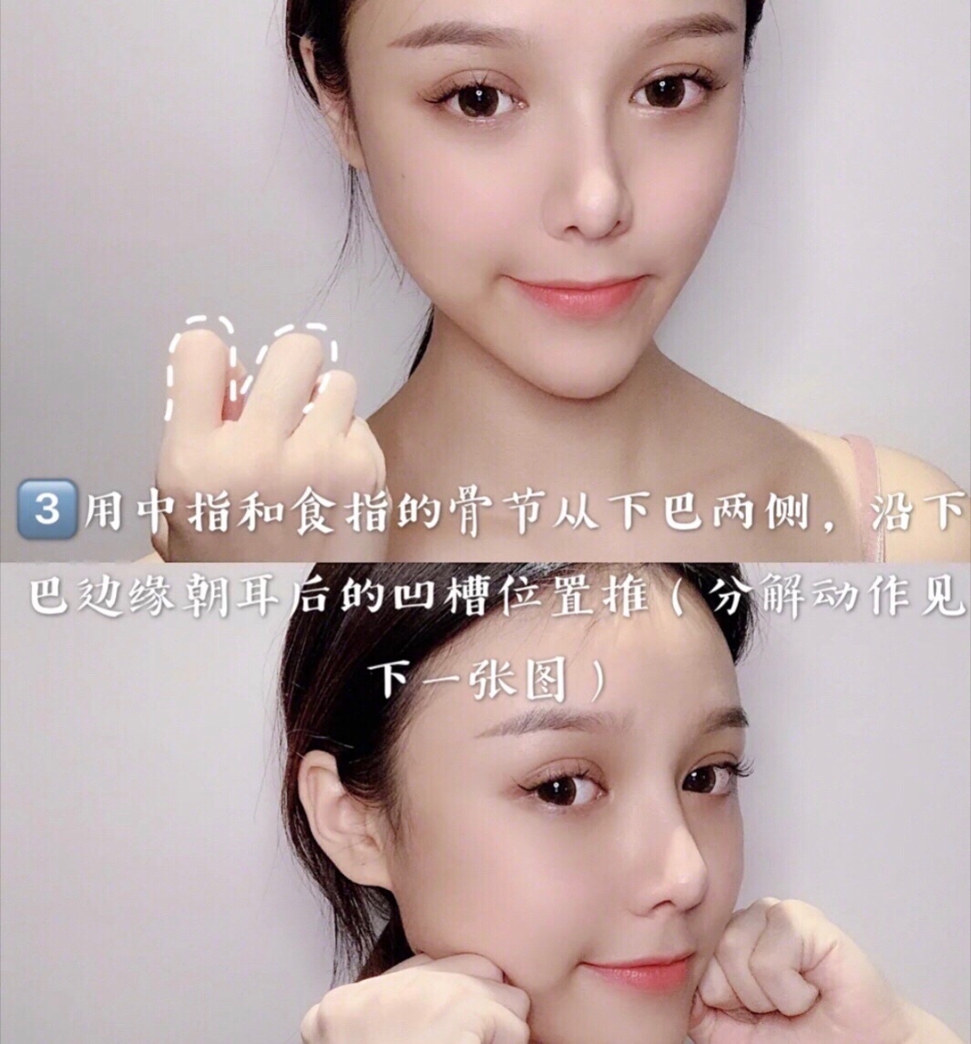 3⃣️用中指和食指的骨节,从下巴两侧,沿着下巴边缘往耳后的凹槽可以促进淋巴循环,收紧下巴